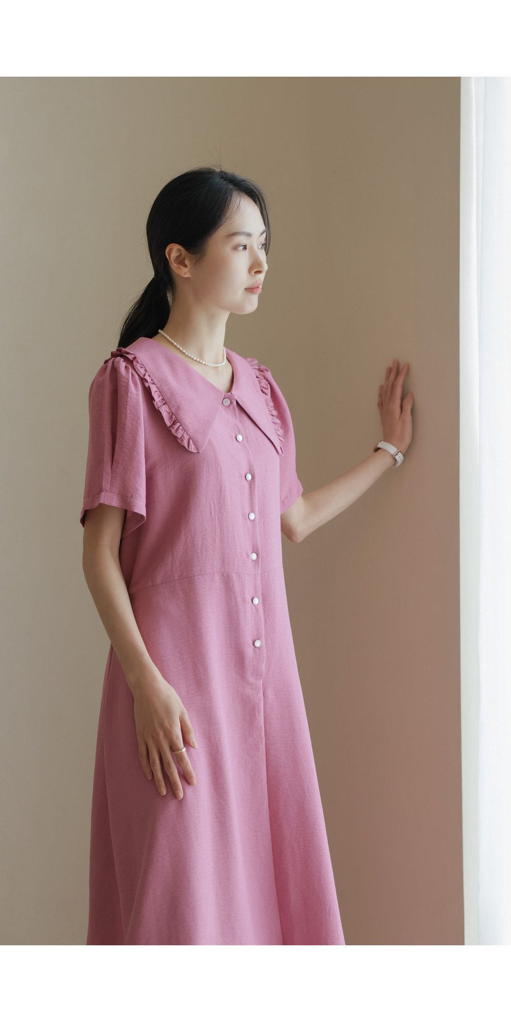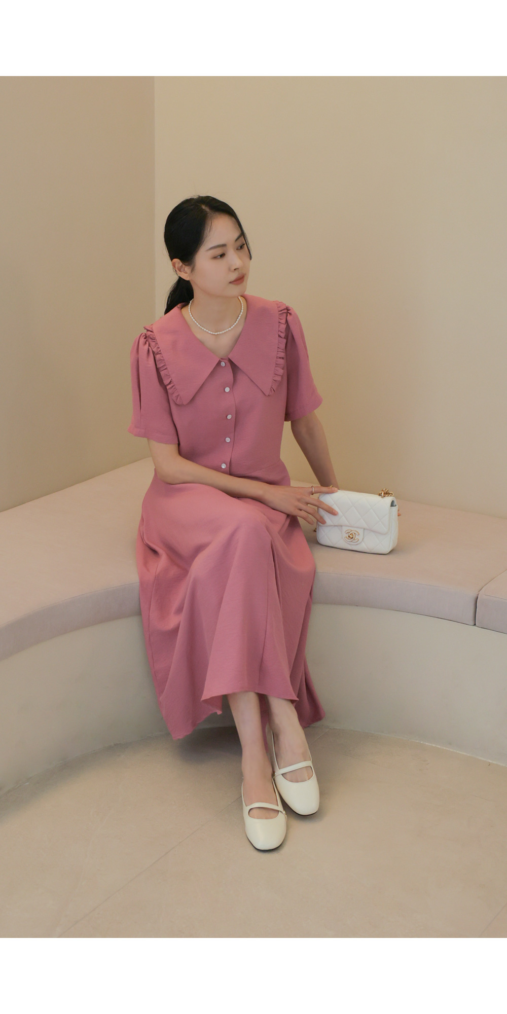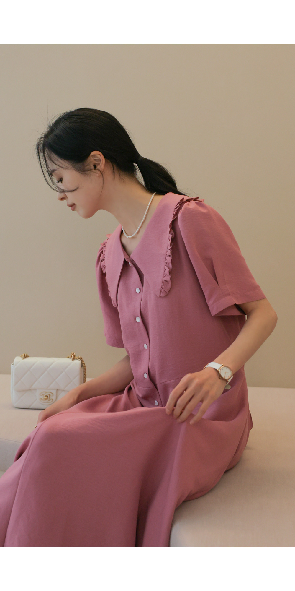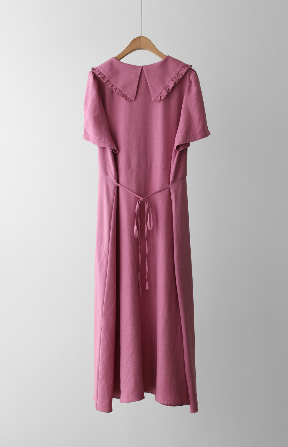 단 한 벌로도 충분히 로맨틱한 무드를 완성할 수 있는 원피스예요. 큼지막한 세일러 카라 디자인이 어깨 라인을 작아 보이게 해주고, 카라 끝단을 따라 섬세하게 더해진 프릴 디테일이 얼굴을 더욱 화사하고 입체적으로 연출해 준답니다.