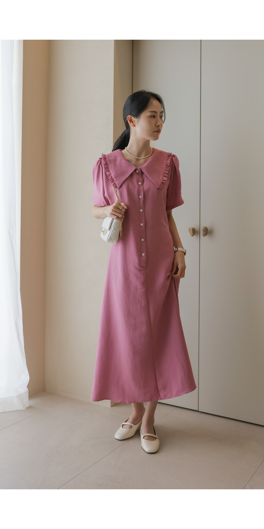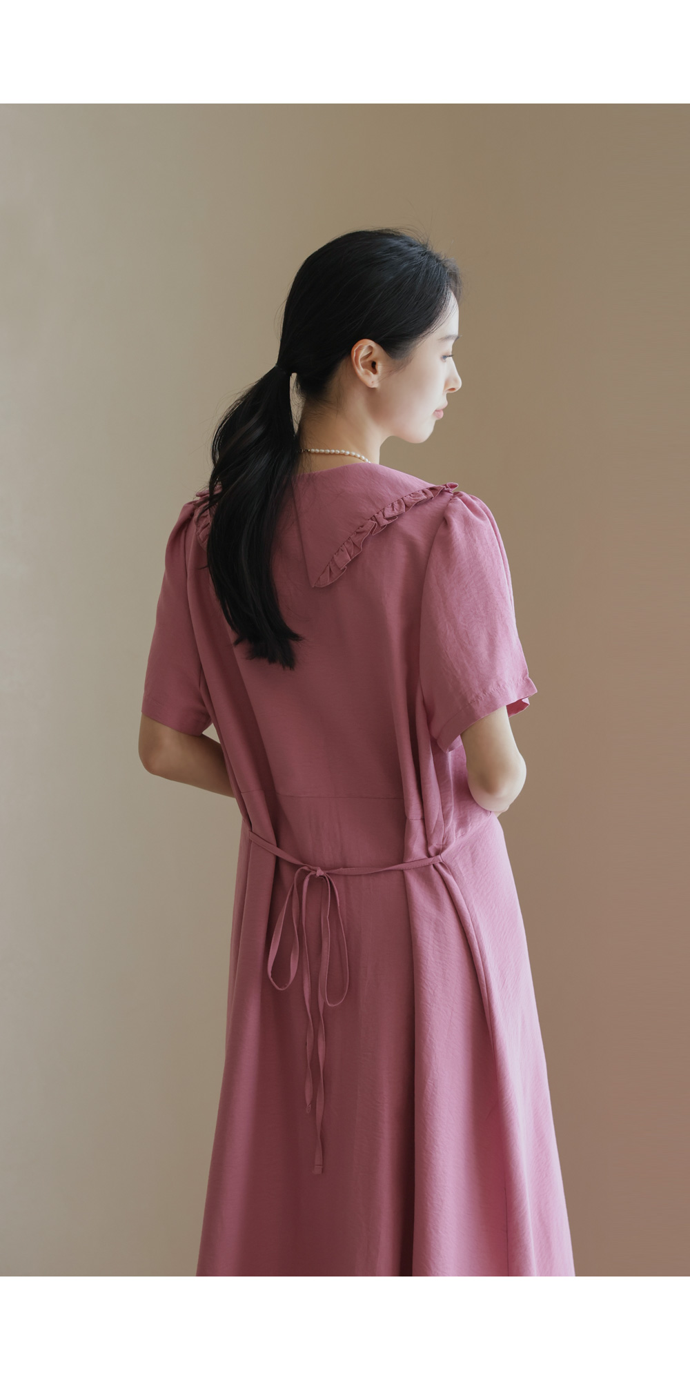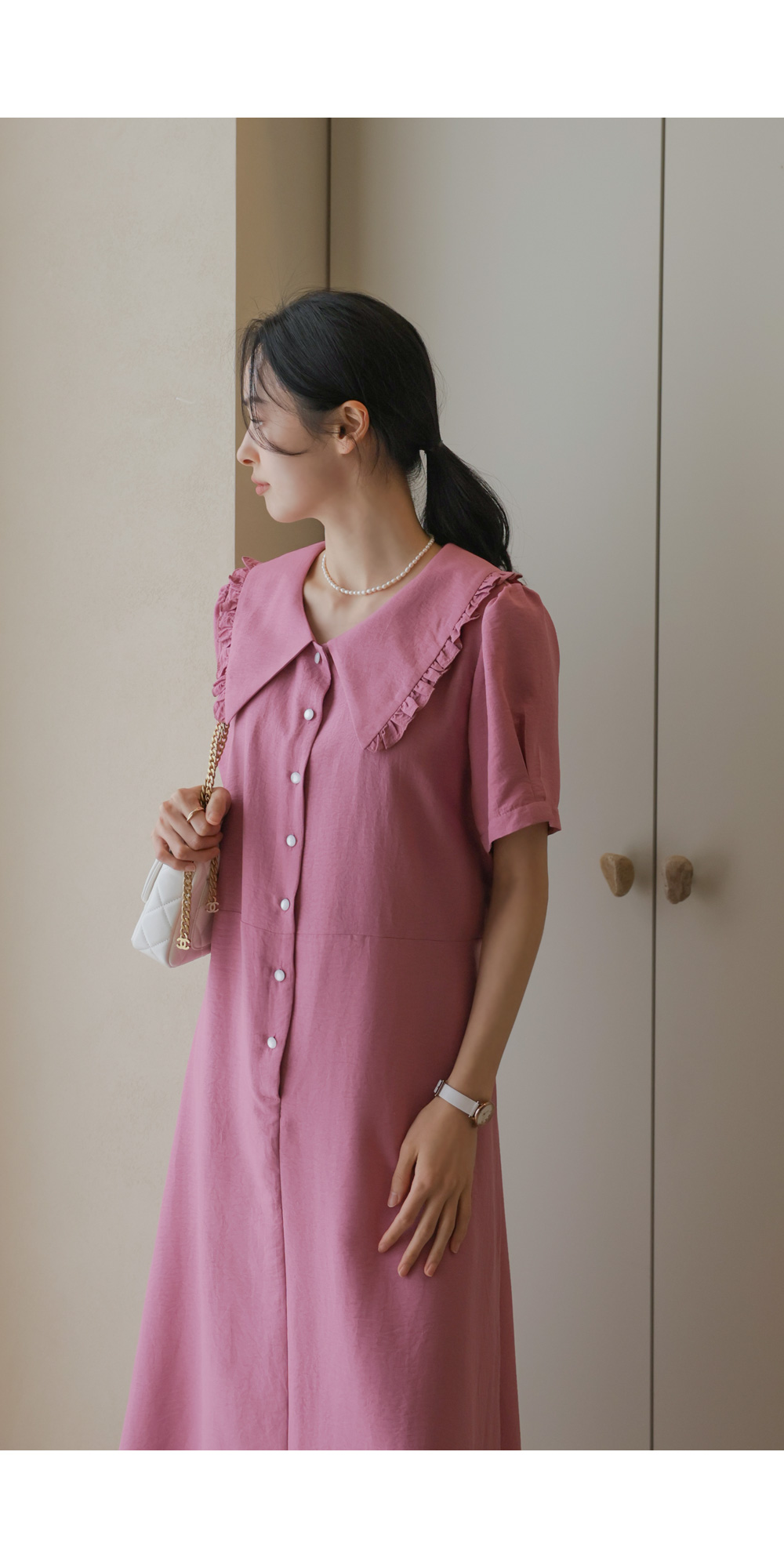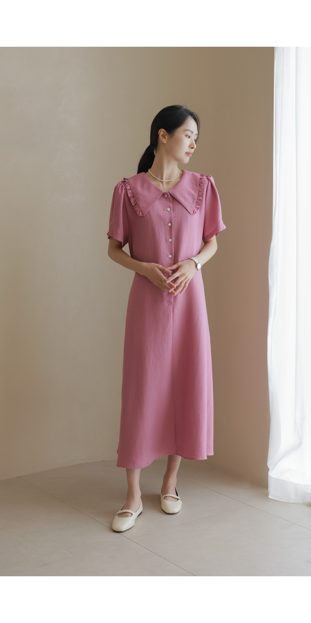 단 한 벌로도 충분히 로맨틱한 무드를 완성할 수 있는 원피스예요. 큼지막한 세일러 카라 디자인이 어깨 라인을 작아 보이게 해주고, 카라 끝단을 따라 섬세하게 더해진 프릴 디테일이 얼굴을 더욱 화사하고 입체적으로 연출해 준답니다.