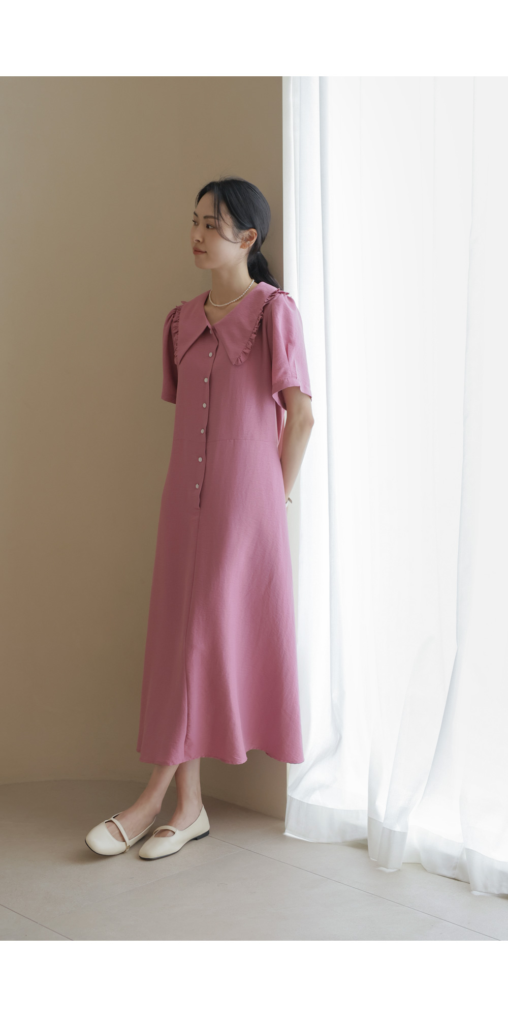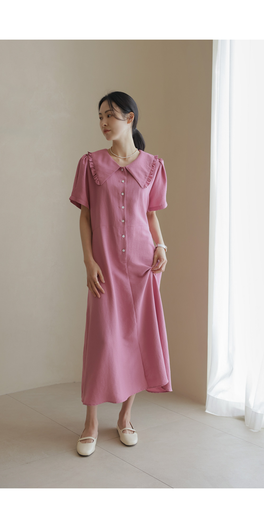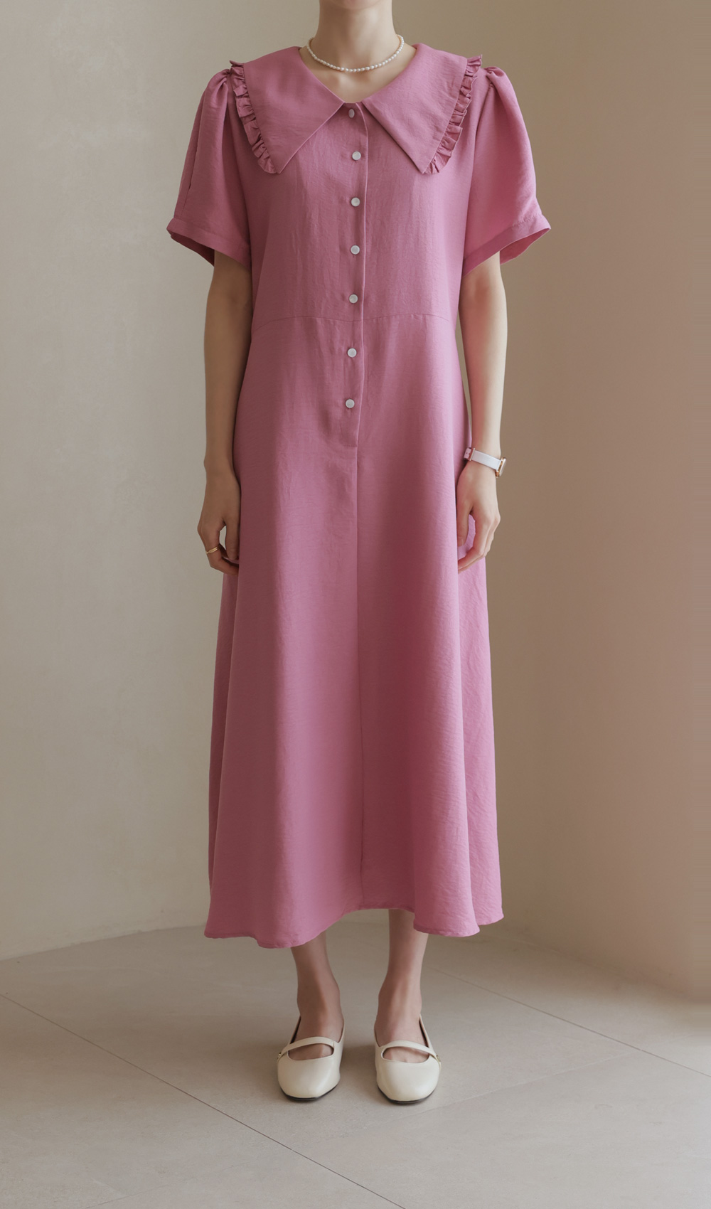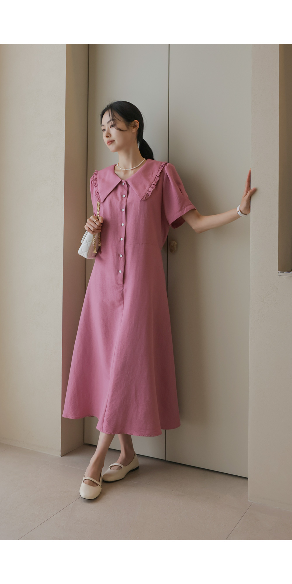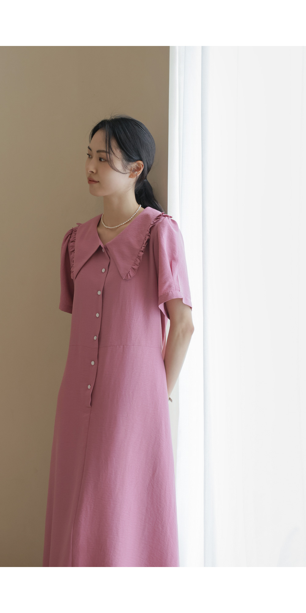 단 한 벌로도 충분히 로맨틱한 무드를 완성할 수 있는 원피스예요. 큼지막한 세일러 카라 디자인이 어깨 라인을 작아 보이게 해주고, 카라 끝단을 따라 섬세하게 더해진 프릴 디테일이 얼굴을 더욱 화사하고 입체적으로 연출해 준답니다.