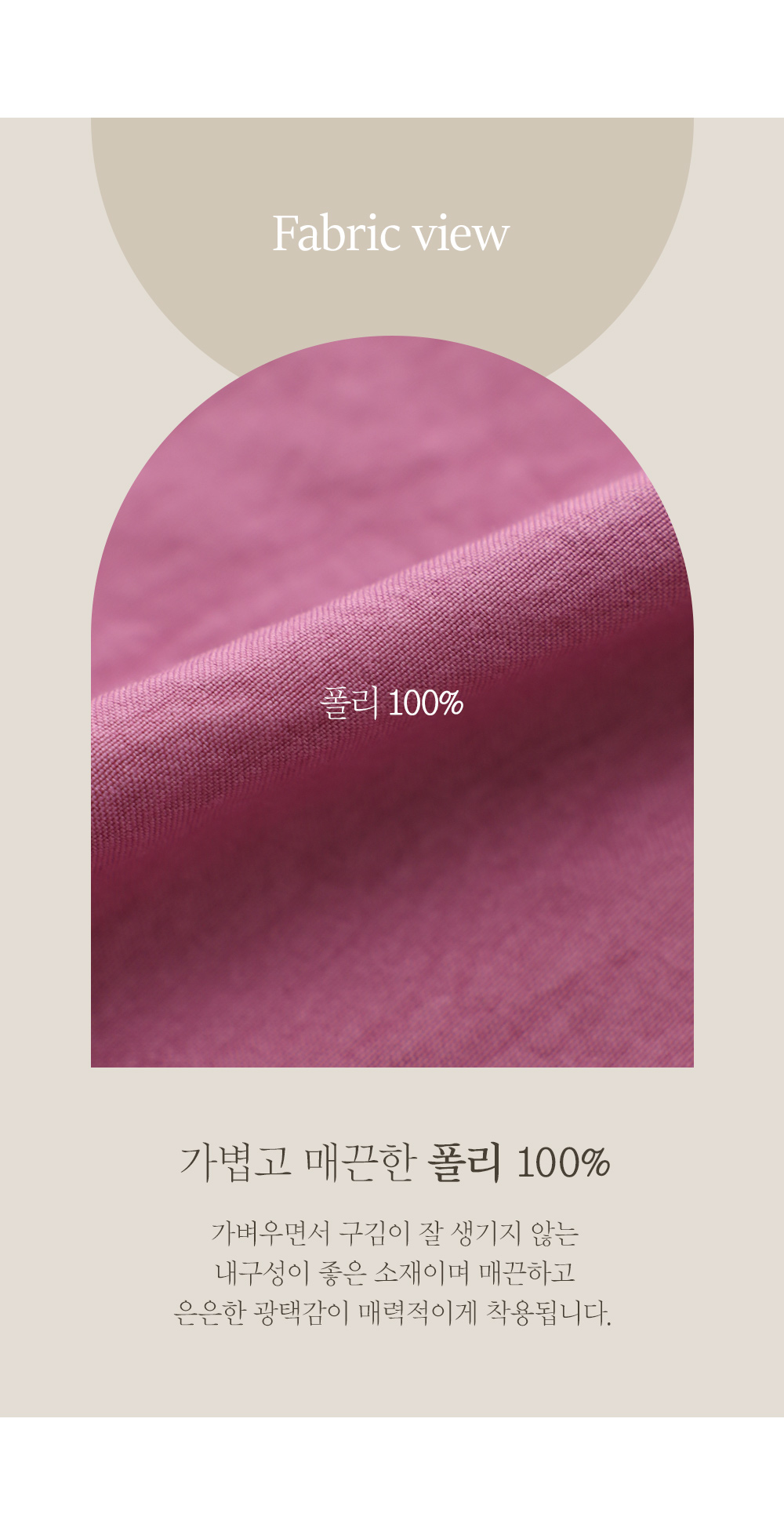 매끄럽고 유연한 텍스처를 가진 폴리 원단으로 구김 걱정이 적고 관리가 매우 수월해요. 피부에 달라붙지 않는 소프트한 촉감 덕분에 장시간 착용해도 쾌적함이 유지되며, 은은하게 감도는 광택감이 원단 특유의 고급스러움을 잘 살려준답니다. ![]() MD가 답하는 안심 Q&A