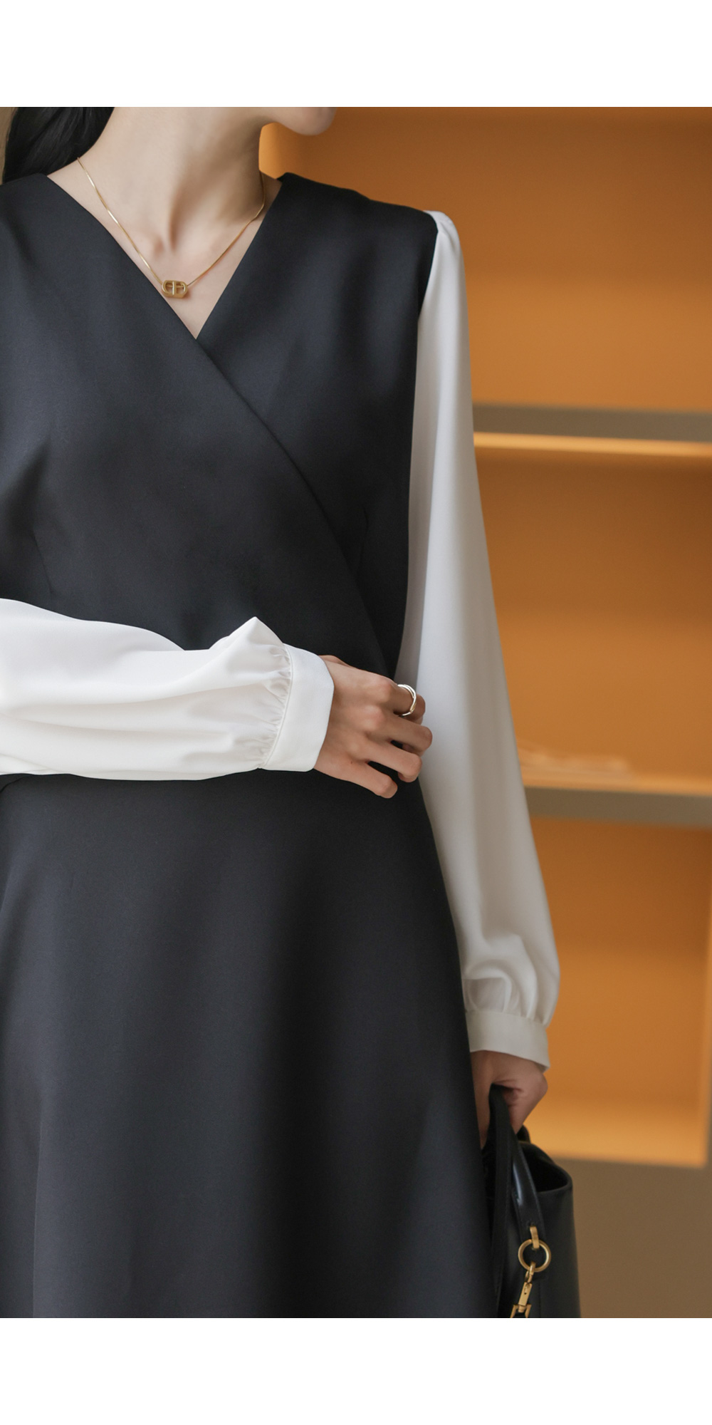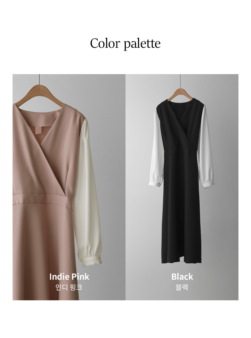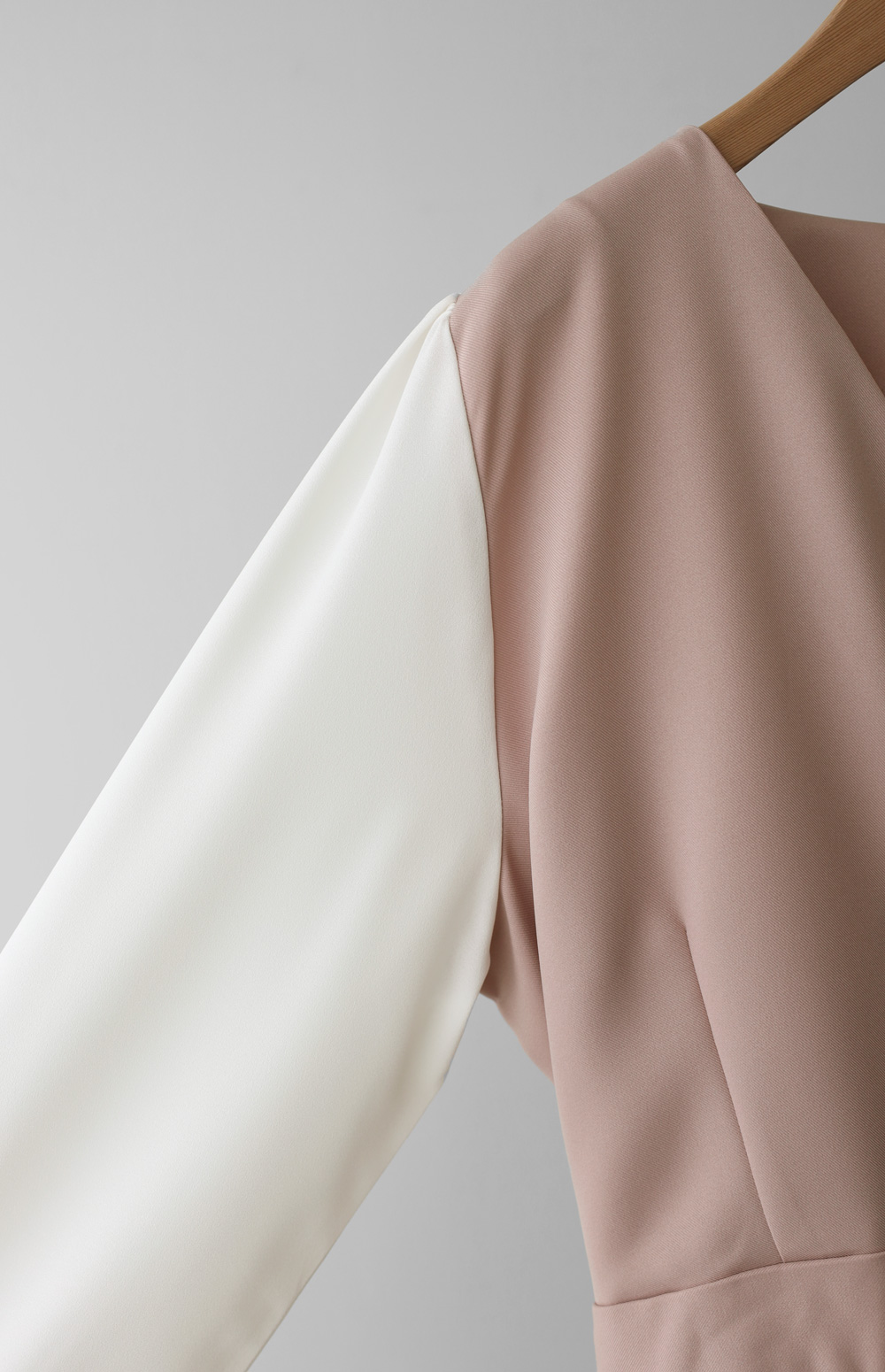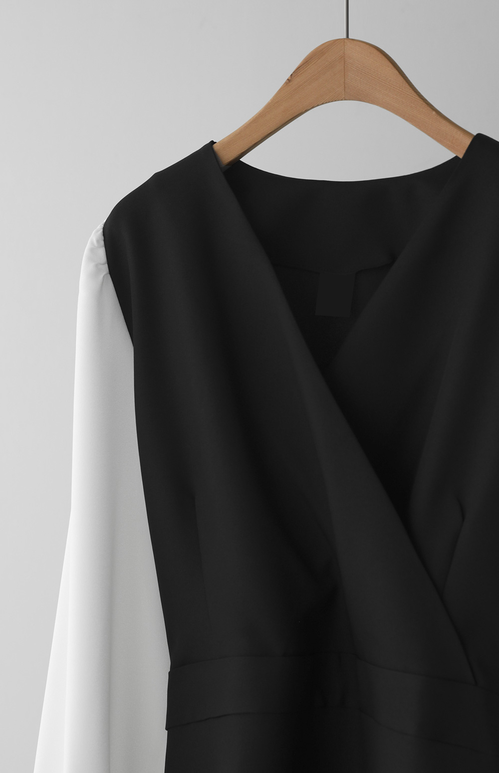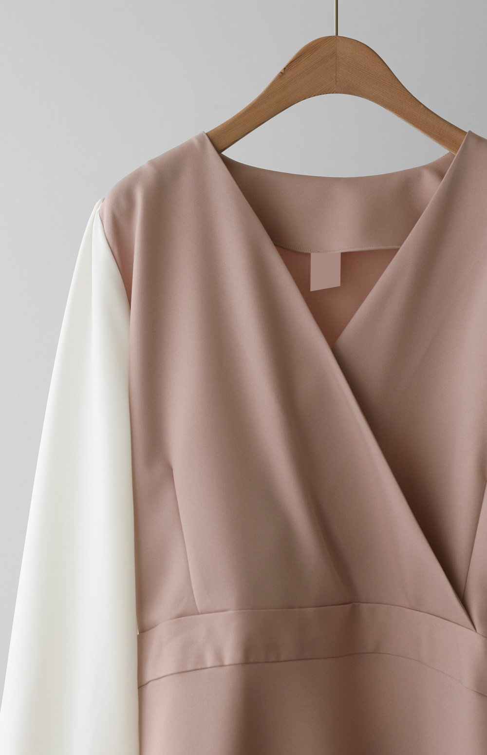 가장 눈에 띄는 특징은 랩 스타일의 V넥 라인이에요. 자연스럽게 겹쳐지는 네크라인이 가슴 라인을 안정적으로 잡아주면서도 얼굴형을 갸름해 보이게 만들어 드려요. 어깨선에서 소매로 이어지는 부분에는 배색 소재를 사용하여 블라우스와 원피스를 레이어드해 입은 듯한 입체감을 더했답니다.