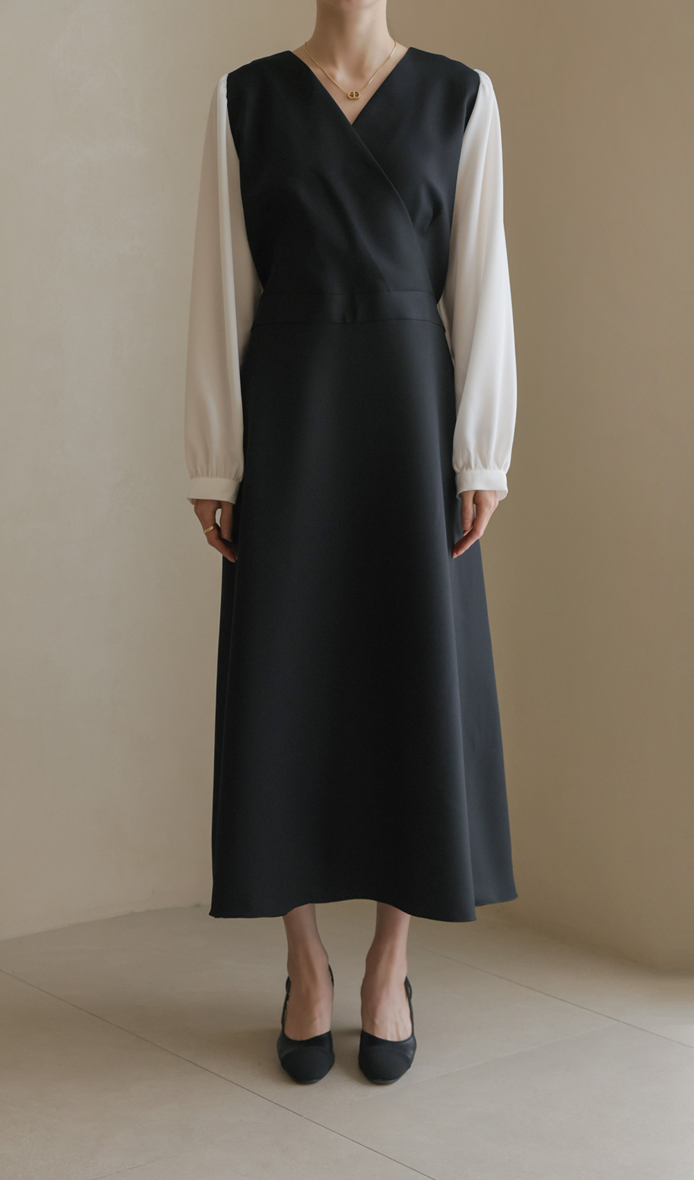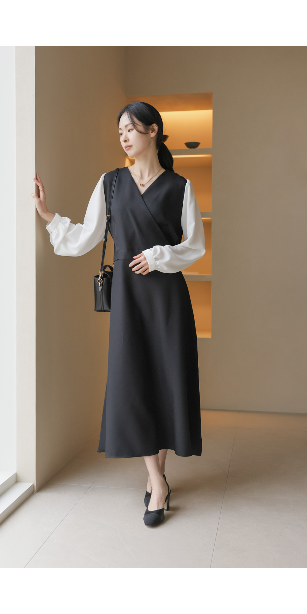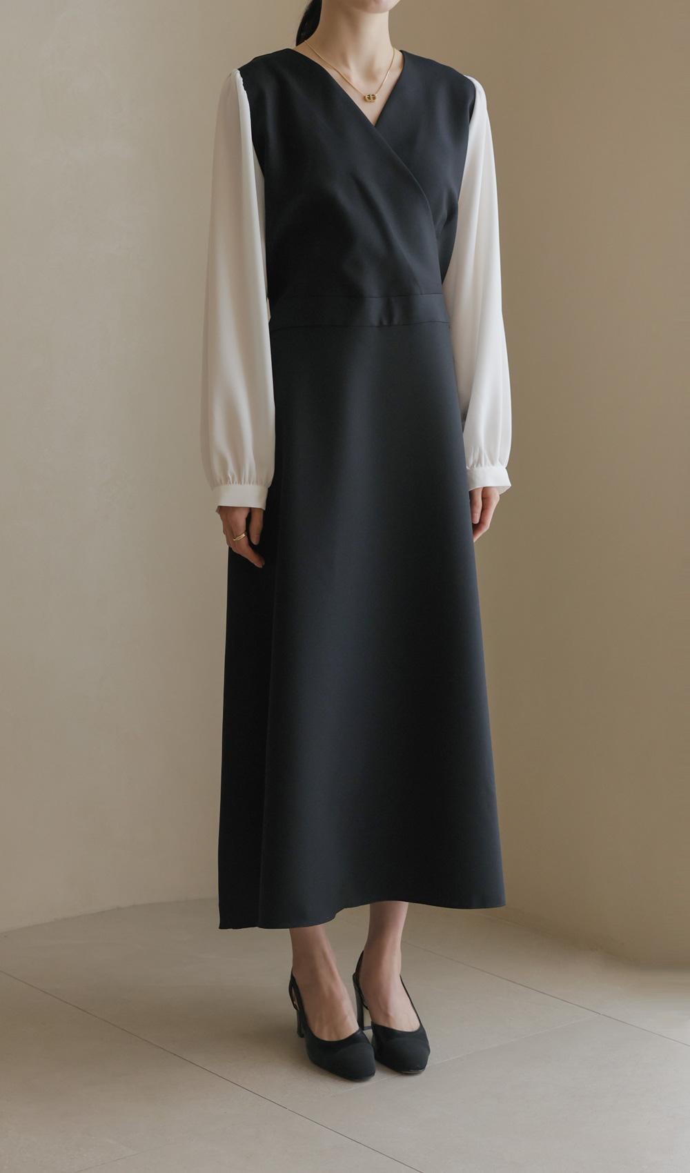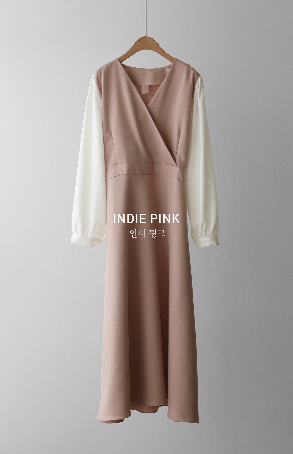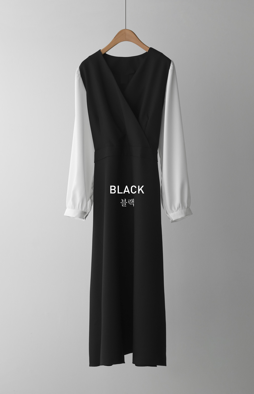 가장 눈에 띄는 특징은 랩 스타일의 V넥 라인이에요. 자연스럽게 겹쳐지는 네크라인이 가슴 라인을 안정적으로 잡아주면서도 얼굴형을 갸름해 보이게 만들어 드려요. 어깨선에서 소매로 이어지는 부분에는 배색 소재를 사용하여 블라우스와 원피스를 레이어드해 입은 듯한 입체감을 더했답니다.