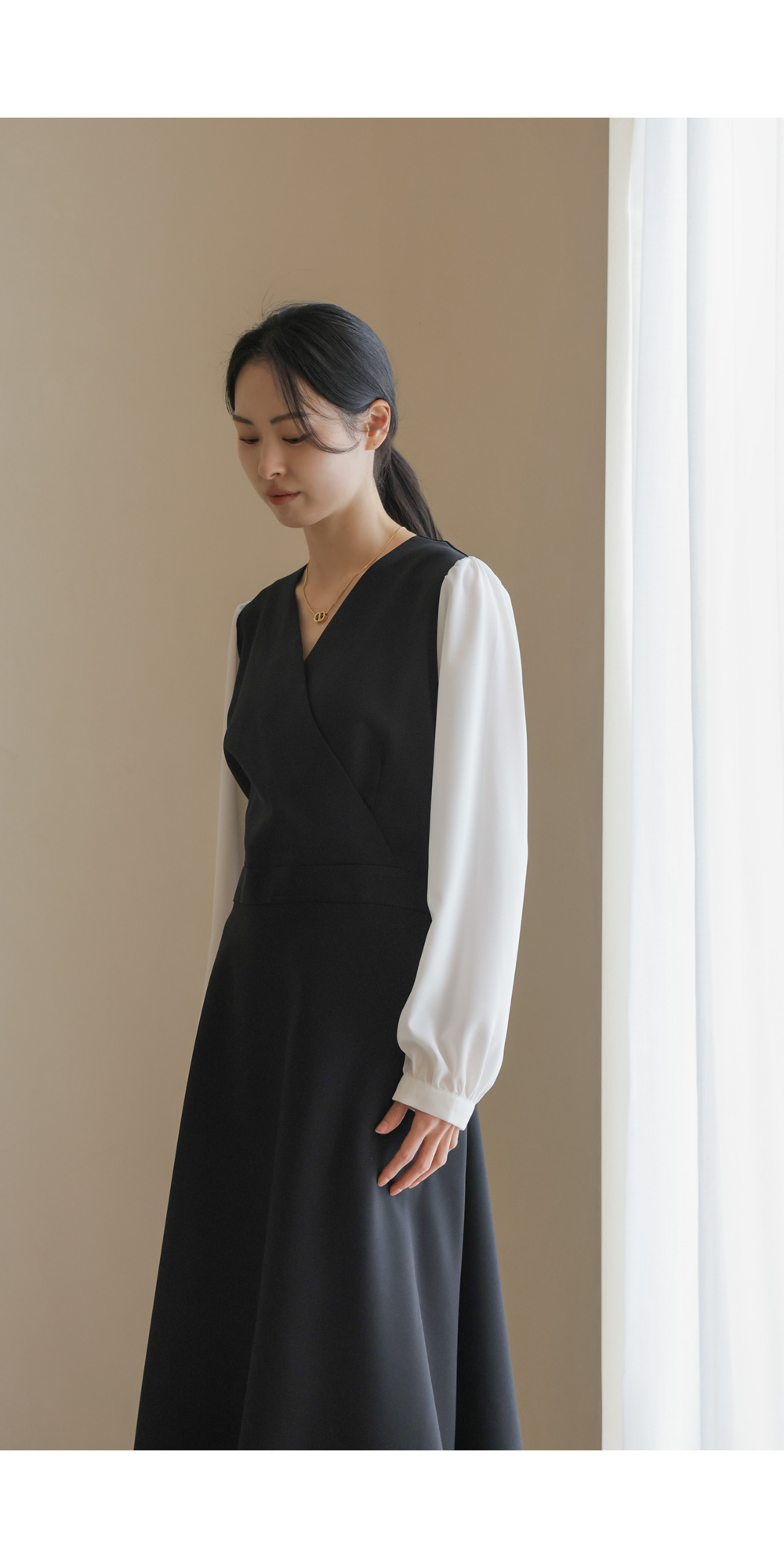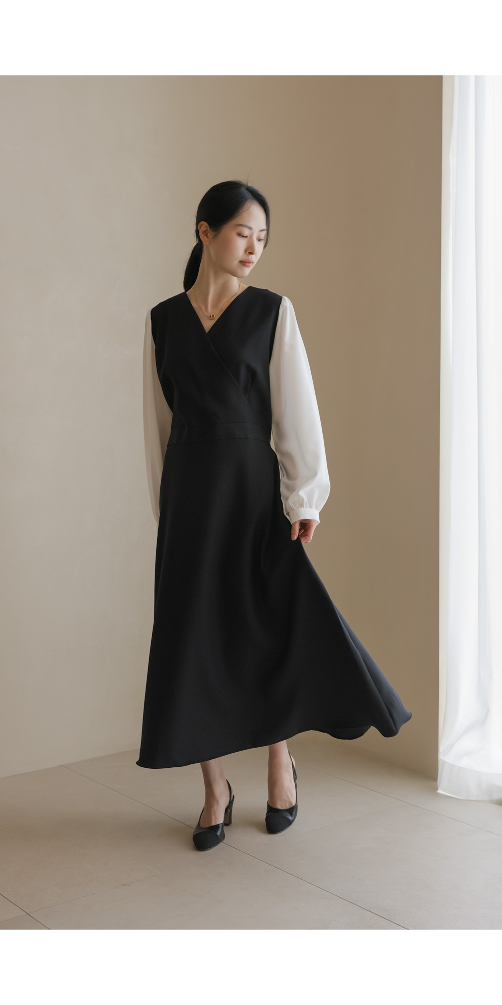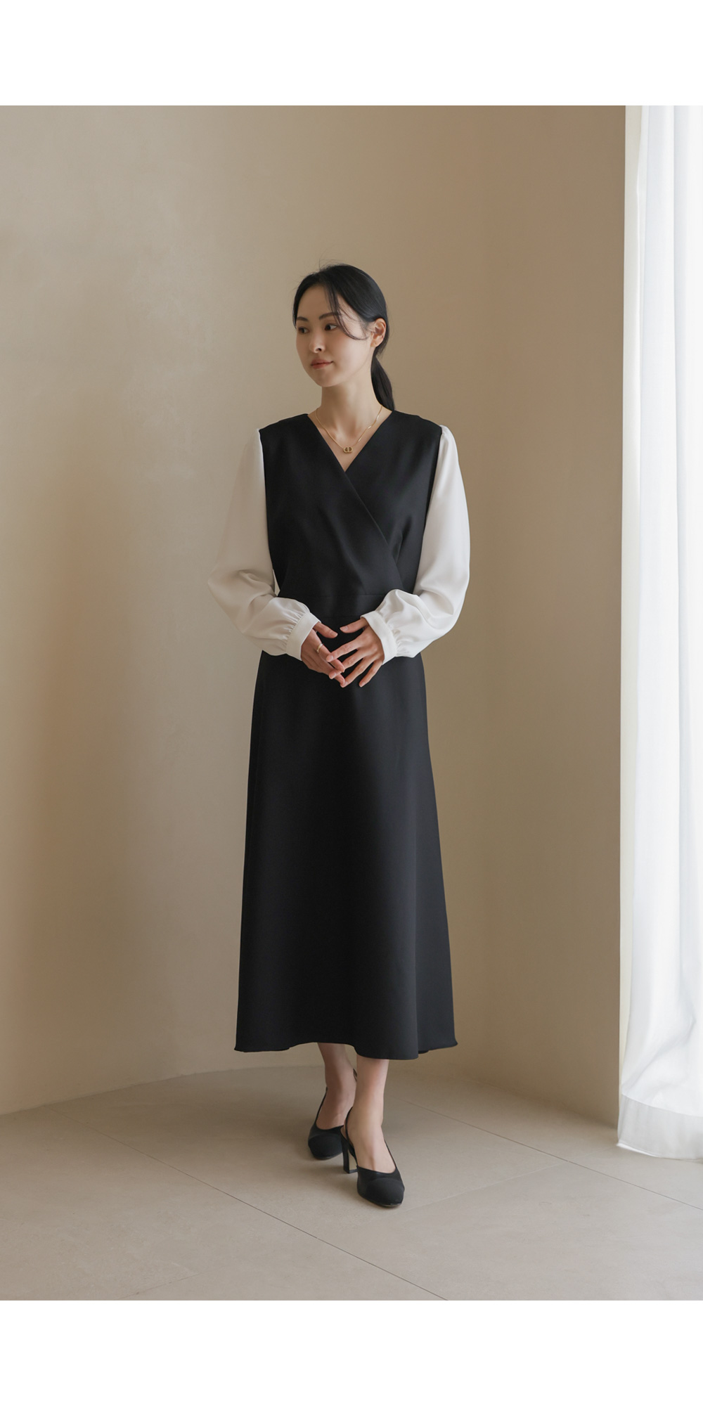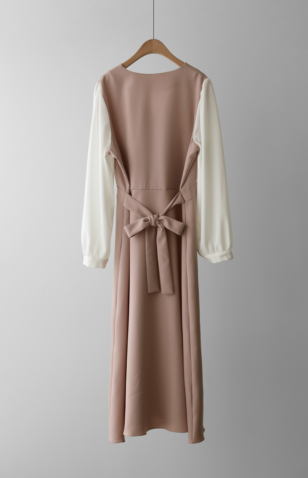 가장 눈에 띄는 특징은 랩 스타일의 V넥 라인이에요. 자연스럽게 겹쳐지는 네크라인이 가슴 라인을 안정적으로 잡아주면서도 얼굴형을 갸름해 보이게 만들어 드려요. 어깨선에서 소매로 이어지는 부분에는 배색 소재를 사용하여 블라우스와 원피스를 레이어드해 입은 듯한 입체감을 더했답니다.