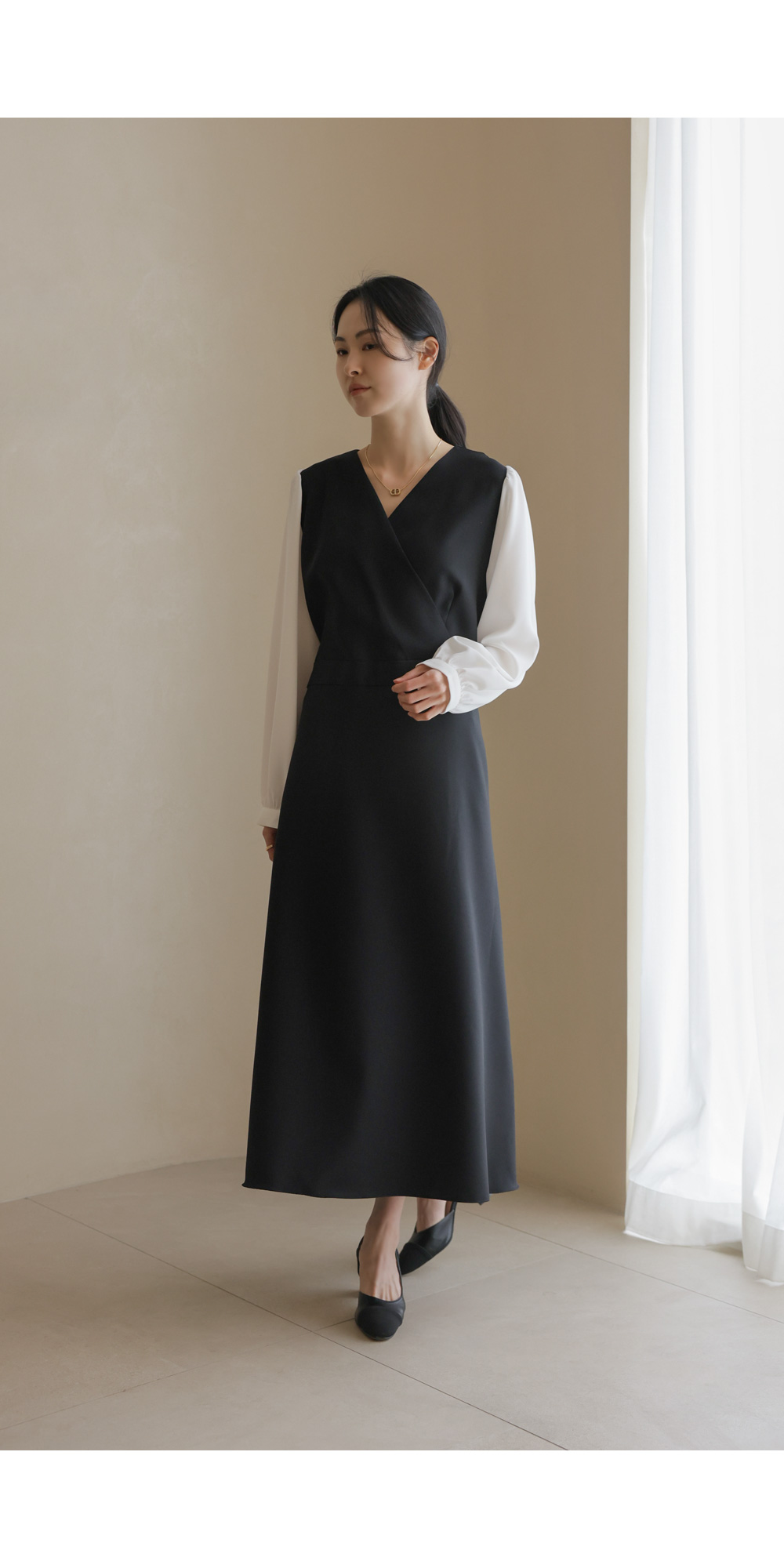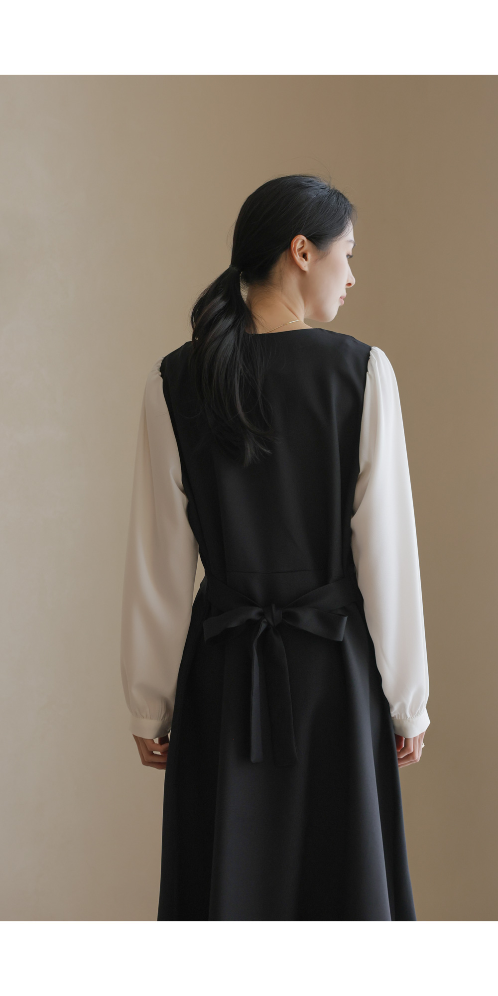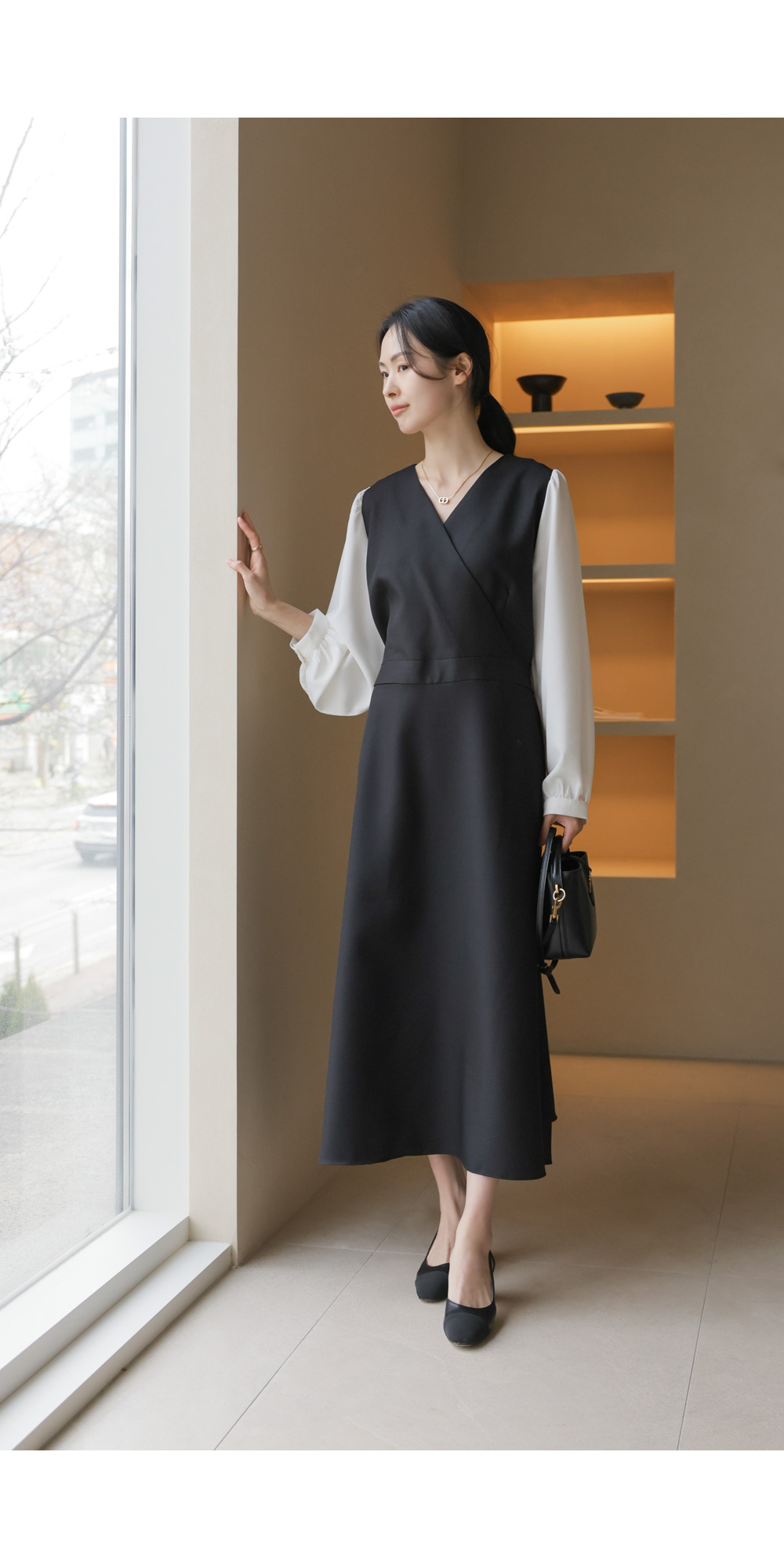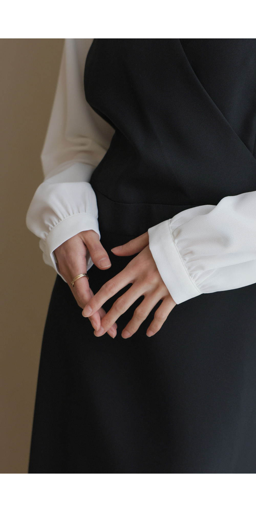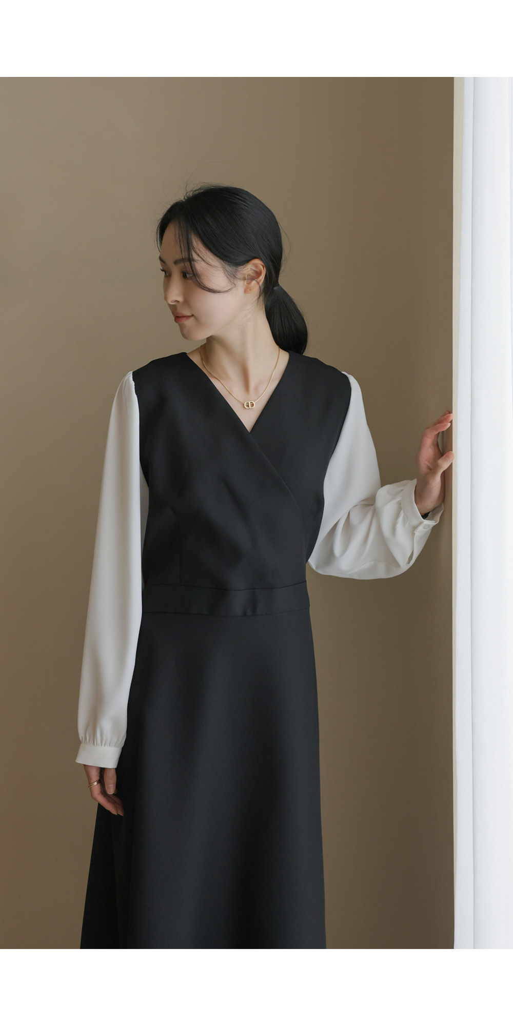 가장 눈에 띄는 특징은 랩 스타일의 V넥 라인이에요. 자연스럽게 겹쳐지는 네크라인이 가슴 라인을 안정적으로 잡아주면서도 얼굴형을 갸름해 보이게 만들어 드려요. 어깨선에서 소매로 이어지는 부분에는 배색 소재를 사용하여 블라우스와 원피스를 레이어드해 입은 듯한 입체감을 더했답니다.