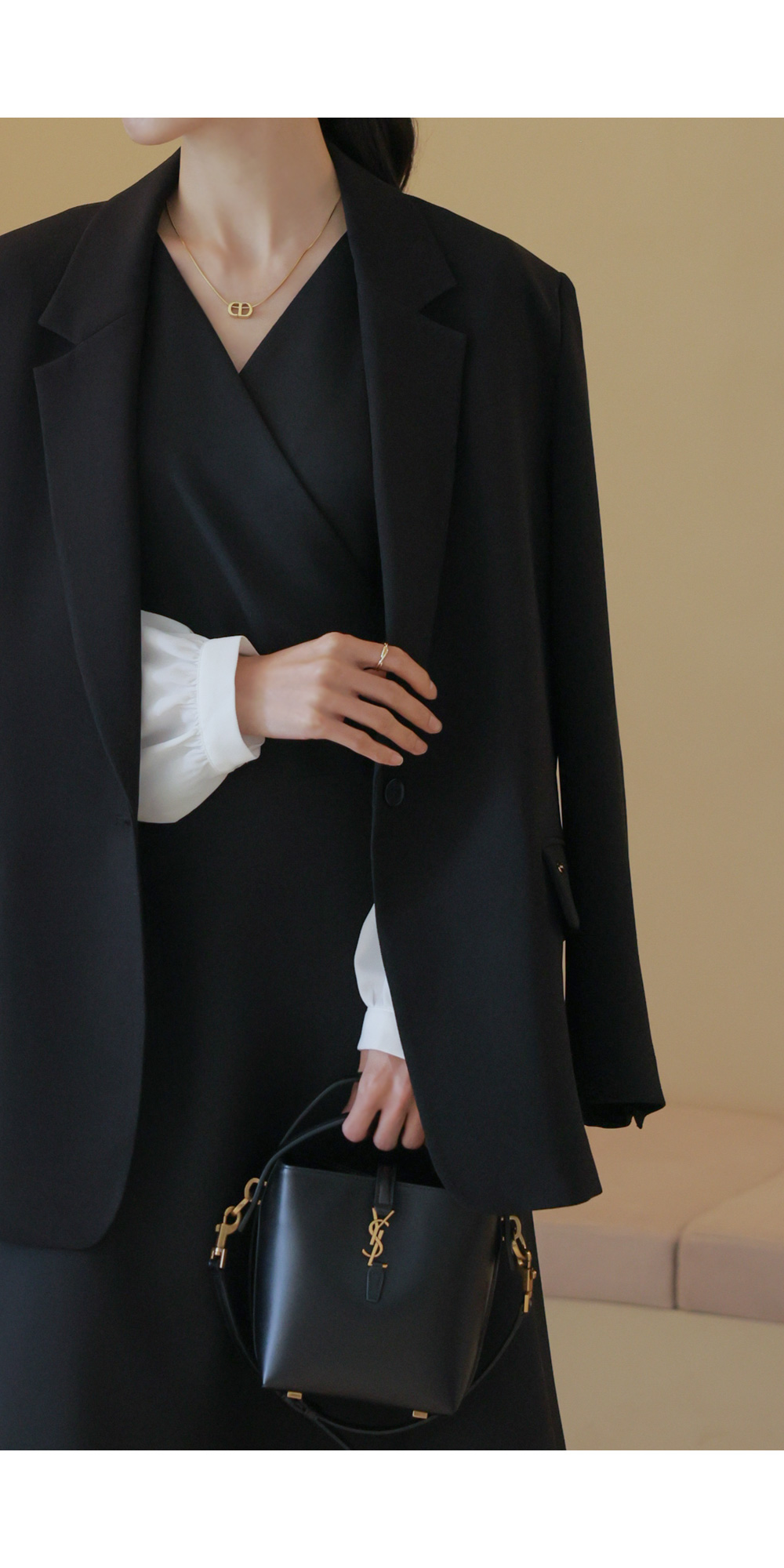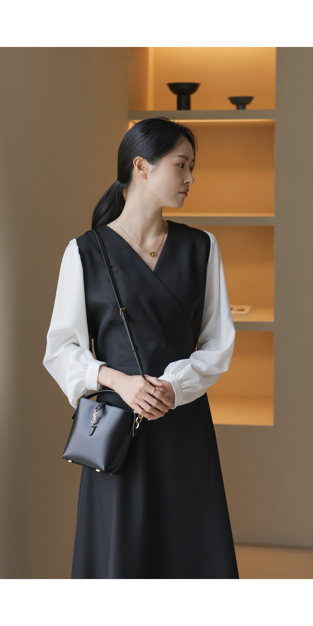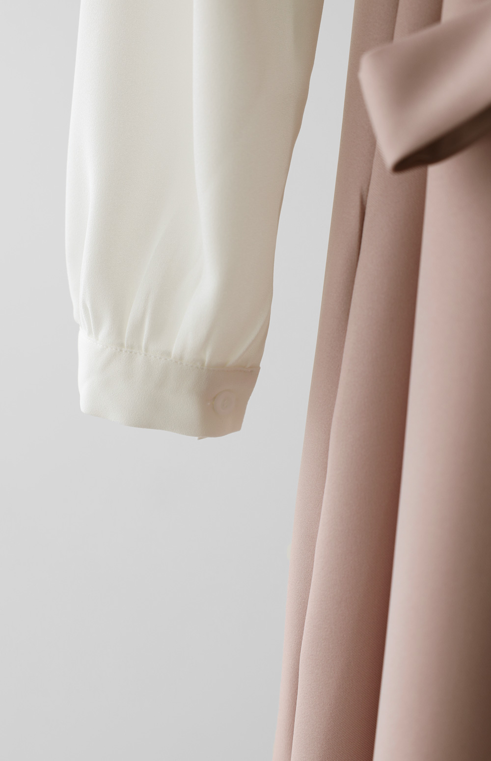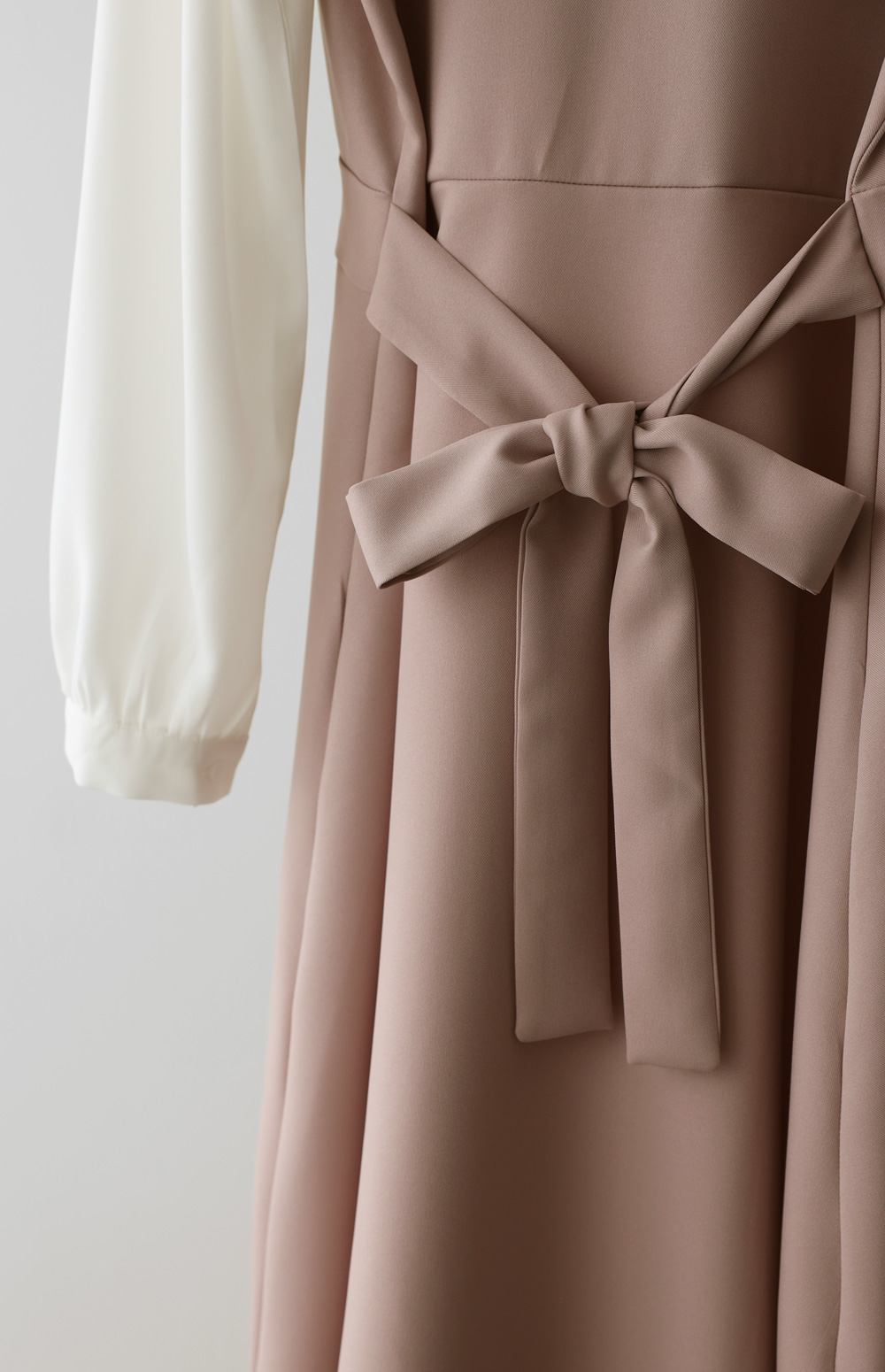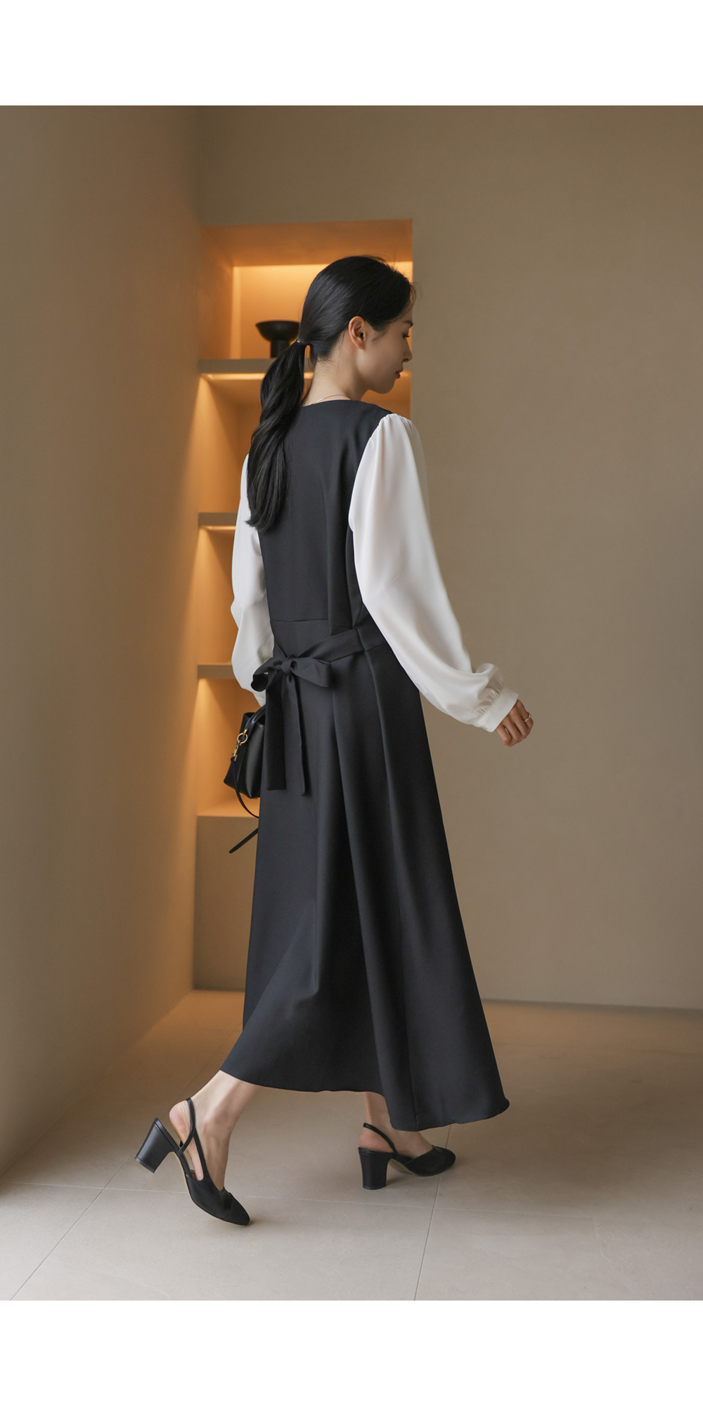 가장 눈에 띄는 특징은 랩 스타일의 V넥 라인이에요. 자연스럽게 겹쳐지는 네크라인이 가슴 라인을 안정적으로 잡아주면서도 얼굴형을 갸름해 보이게 만들어 드려요. 어깨선에서 소매로 이어지는 부분에는 배색 소재를 사용하여 블라우스와 원피스를 레이어드해 입은 듯한 입체감을 더했답니다.
