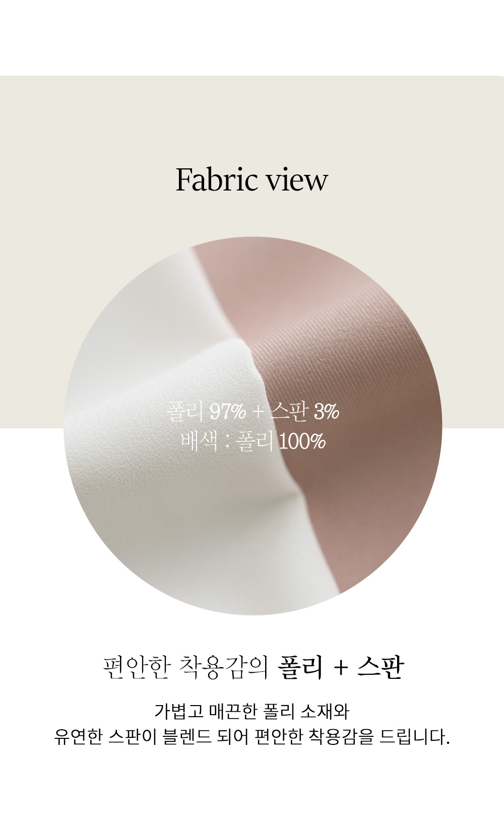 매끈한 터칭감과 적당한 힘이 느껴지는 탄탄한 폴리 소재로 전체적인 실루엣이 무너지지 않고 고급스럽게 유지돼요. 은은한 광택감이 감도는 소재감이 빛에 따라 우아한 결을 살려주며, 소매 부분은 부드럽고 유연한 배색 소재를 사용하여 활동 시 불편함 없이 가벼운 착용감을 느끼실 수 있답니다.