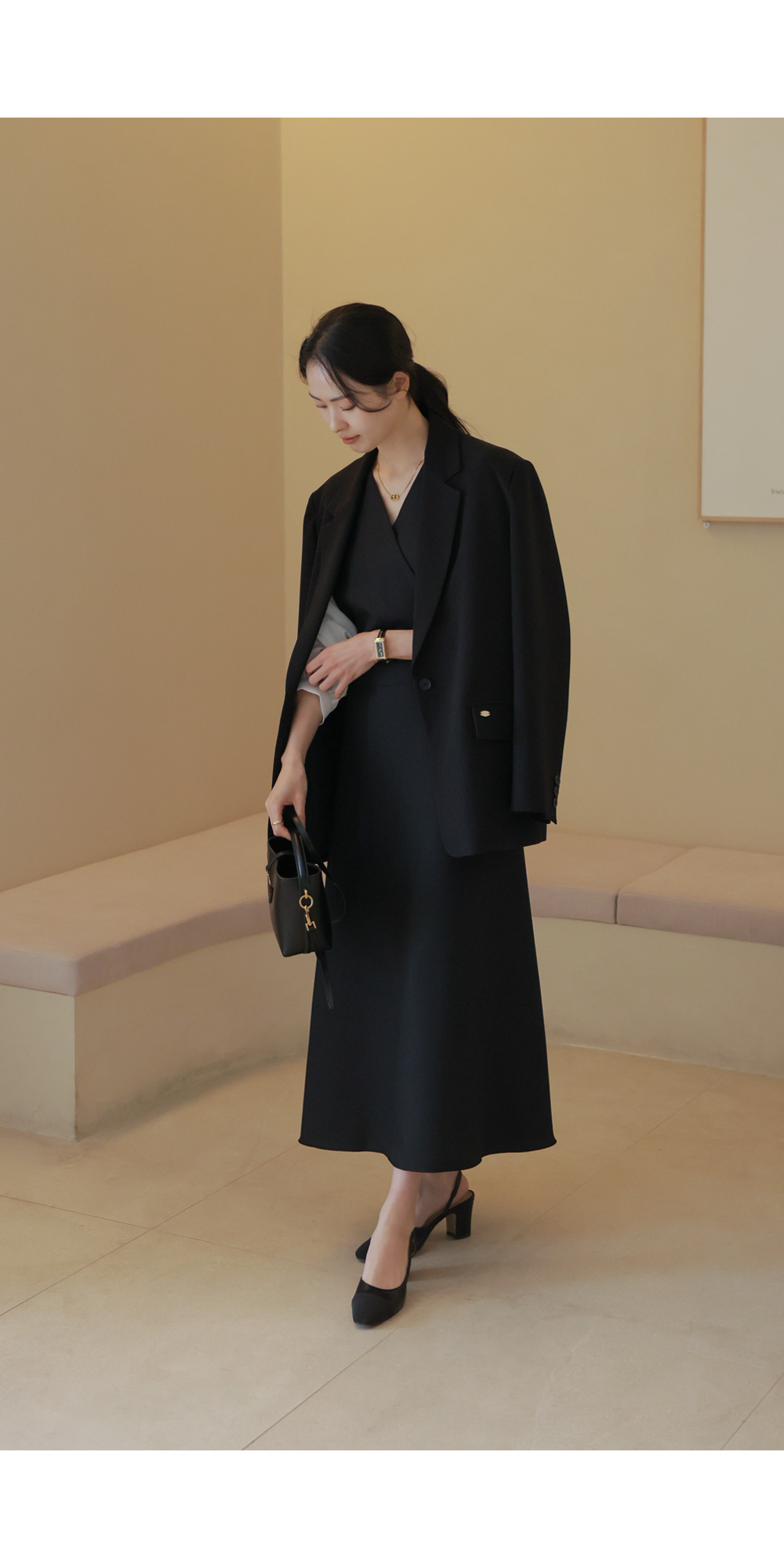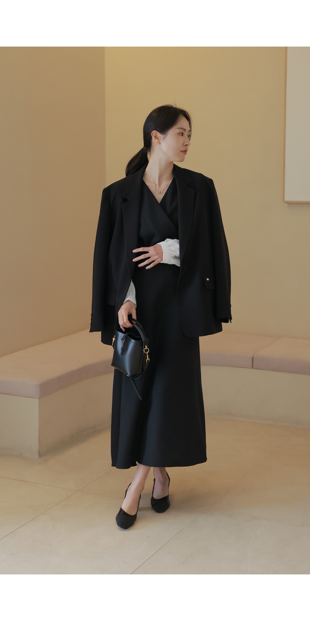 A:롱한 기장감이 세로 선을 살려주어 키가 더 커 보여요. 발목 위로 우아하게 떨어지는 기장이라 여리여리 여성스러운 무드를 더 해준답니다.