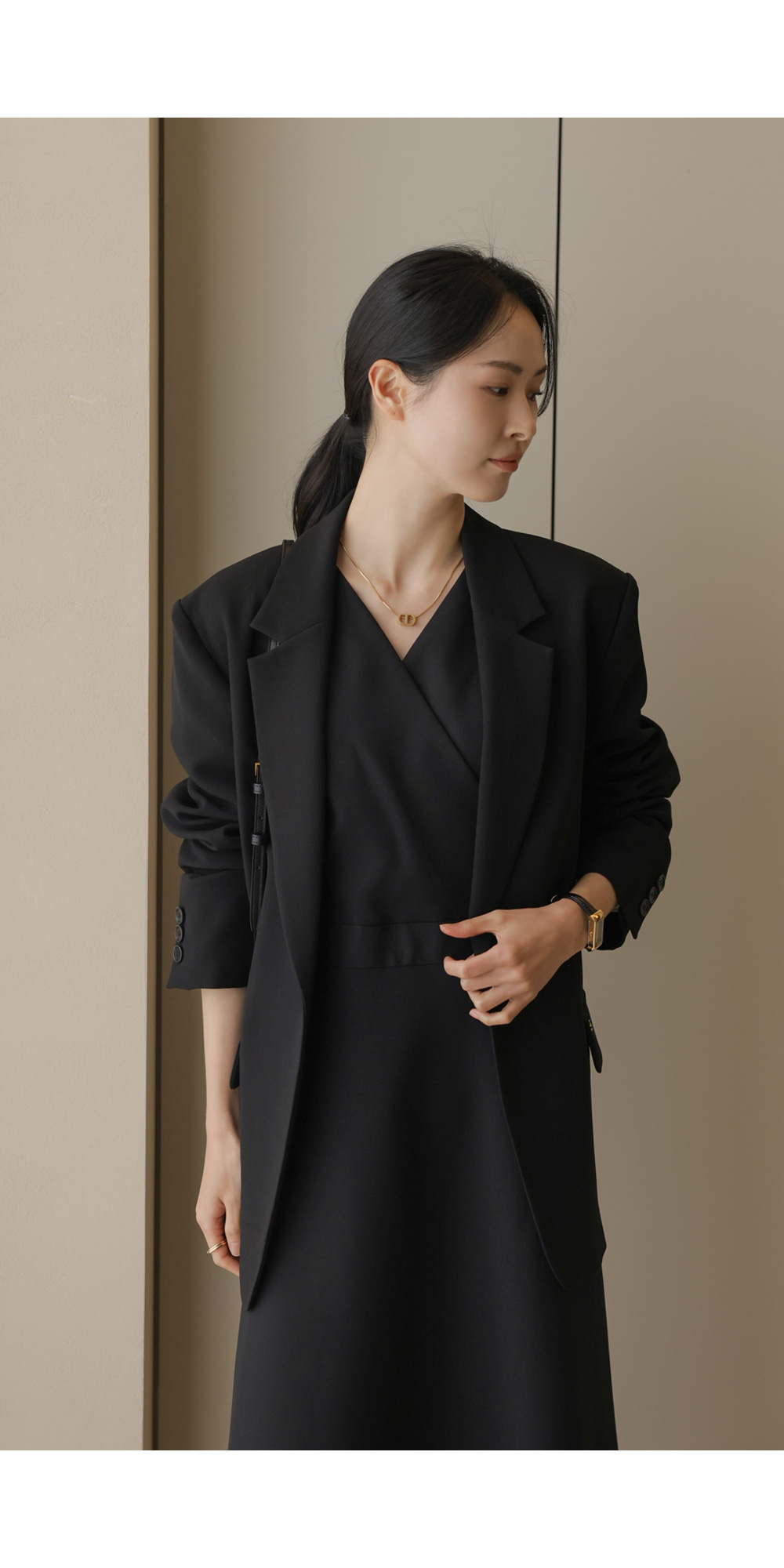 원피스 하나만으로도 완벽하게 차려입은 듯한 세련미를 선사하는 아이템이에요. 깊게 파이지 않은 단정한 V넥 라인이 랩 스타일로 겹쳐져 목선을 길고 슬림하게 연출해 주며, 소매 부분에 더해진 배색 디테일이 시각적인 포인트를 주어 밋밋함 없이 고급스러운 무드를 자아낸답니다.