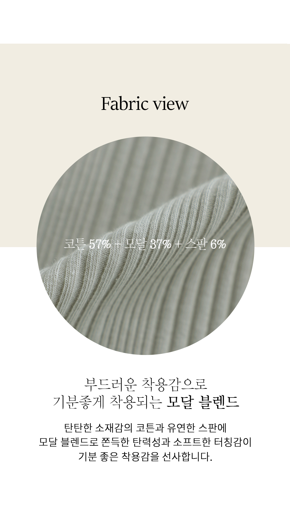 코튼의 쾌적함과 모달의 부드러움, 그리고 스판의 쫀쫀함이 최적의 비율로 섞여 최상의 컨디션을 보여주는 소재예요. 유연하게 흐르는 소재감이 몸의 움직임에 따라 자연스럽게 반응하며, 세로 골지 조직이 원단에 적당한 힘을 실어주어 세탁 후에도 쉽게 늘어지지 않는 탄탄함을 느끼실 수 있습니다.