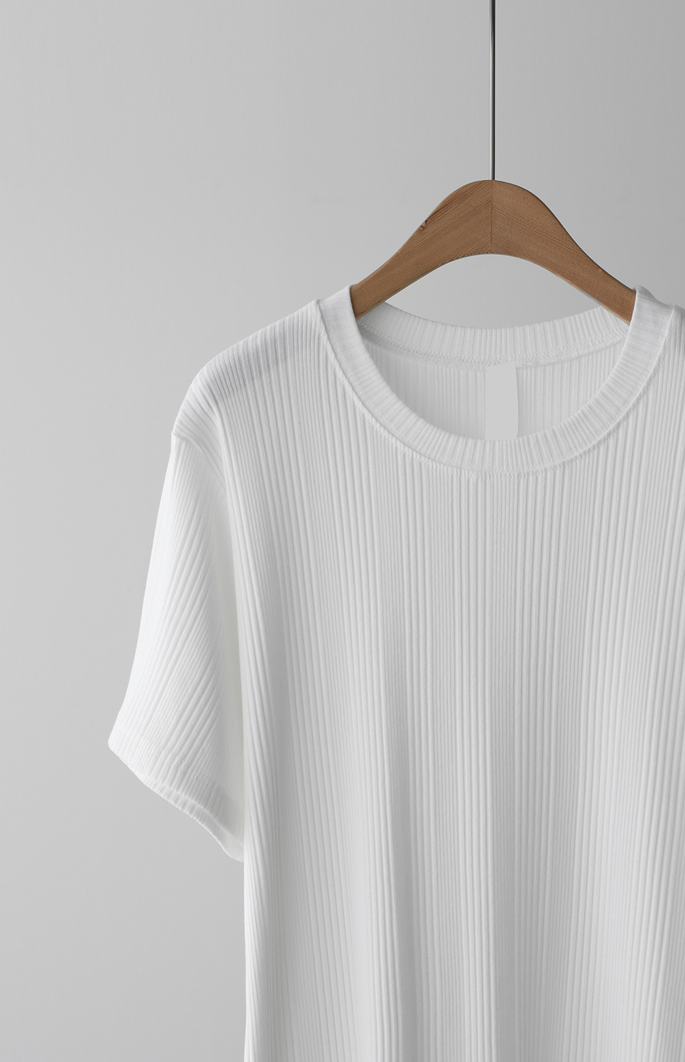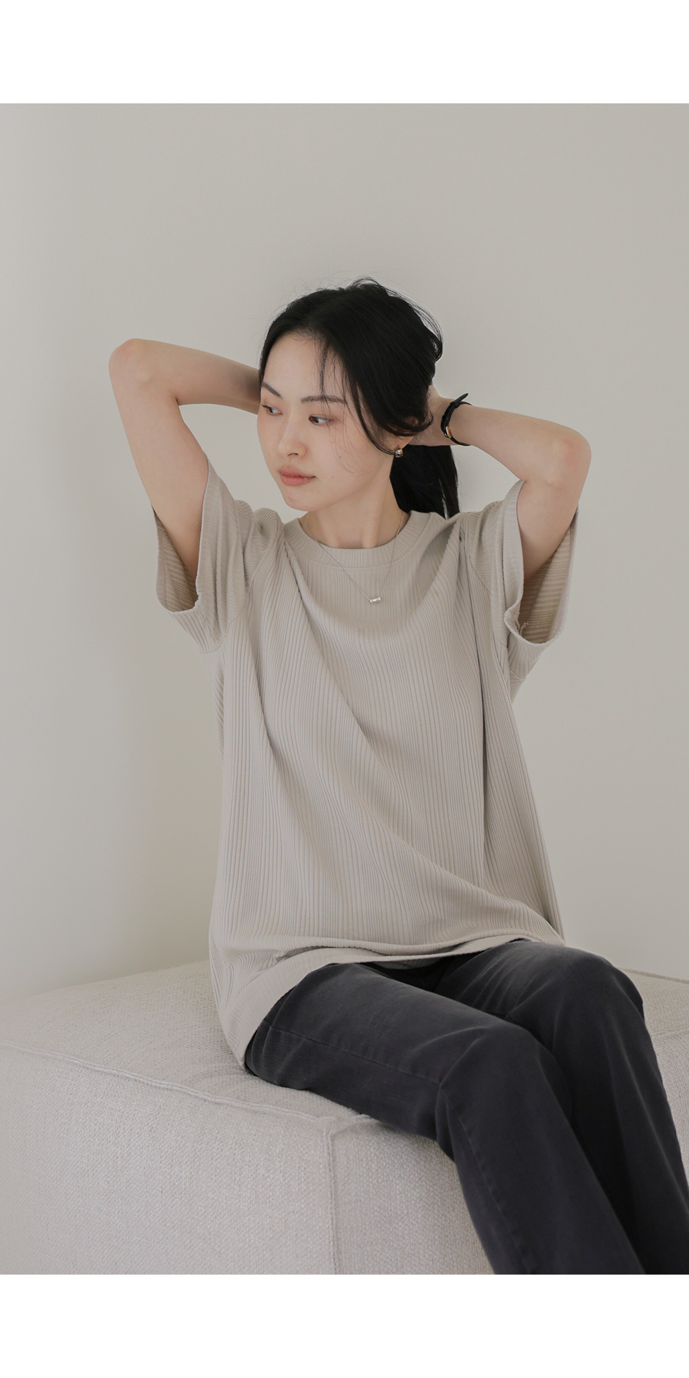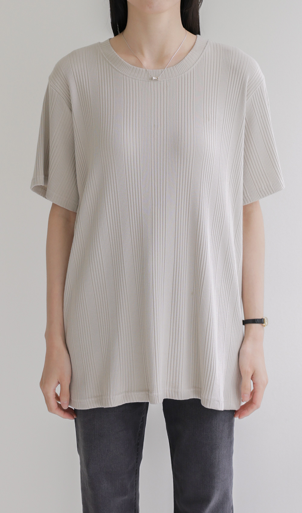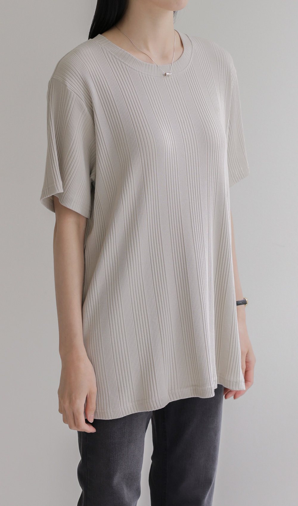 A:골지 텍스처 자체가 입체감을 주기 때문에 평면적인 티셔츠보다 속옷 라인 부각이 훨씬 덜해요. 적당히 탄탄한 두께감이 살결을 잡아주어 안정적으로 입으실 수 있어요.