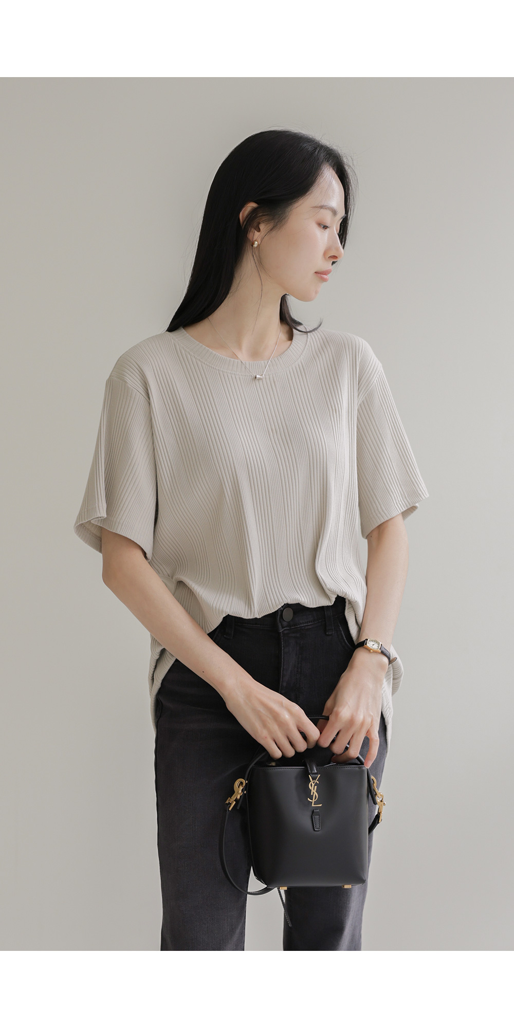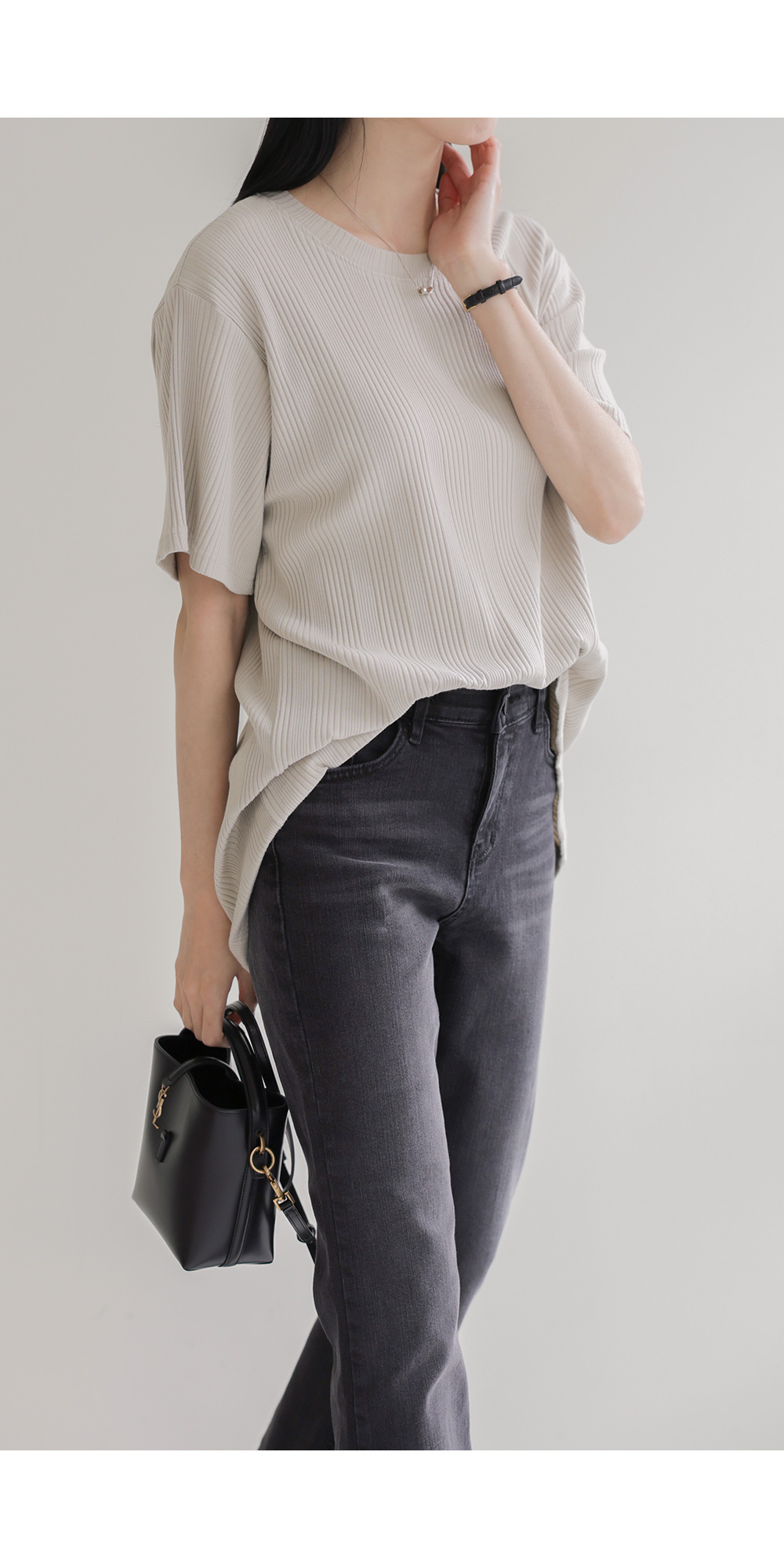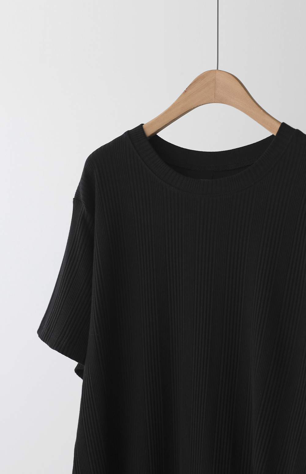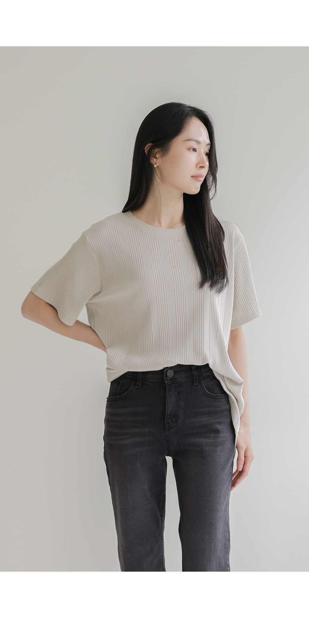 A:골지 텍스처 자체가 입체감을 주기 때문에 평면적인 티셔츠보다 속옷 라인 부각이 훨씬 덜해요. 적당히 탄탄한 두께감이 살결을 잡아주어 안정적으로 입으실 수 있어요.
