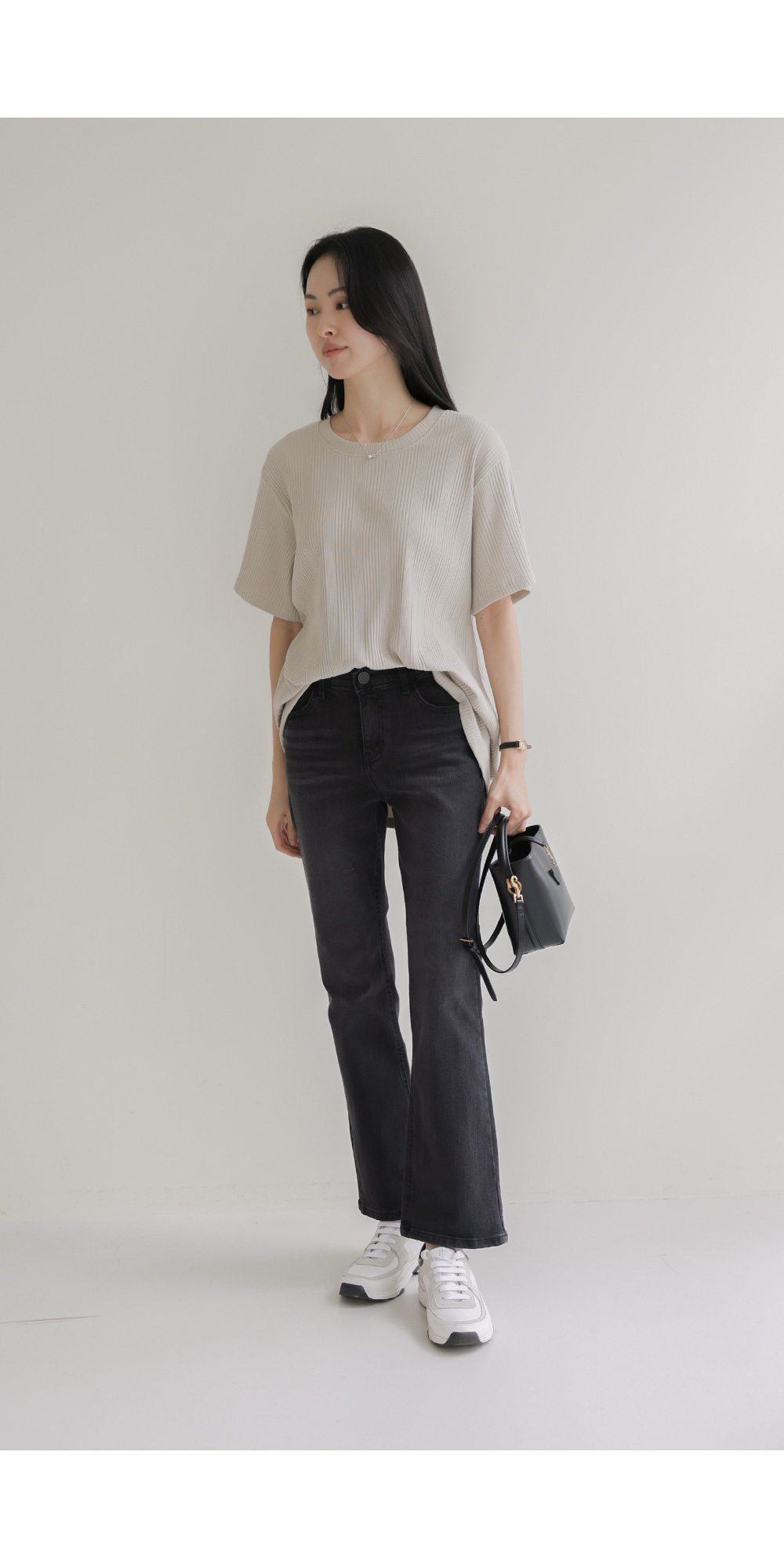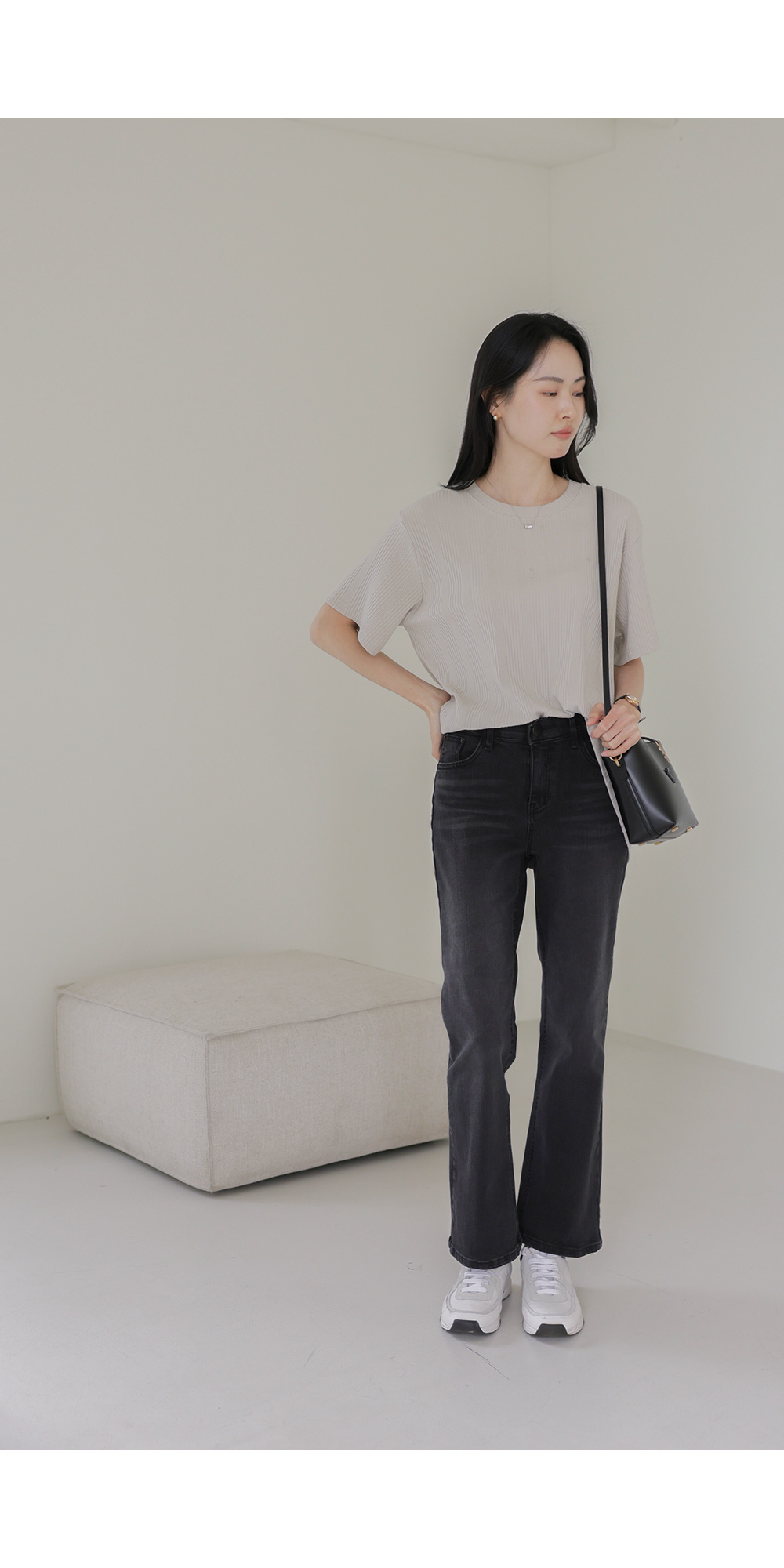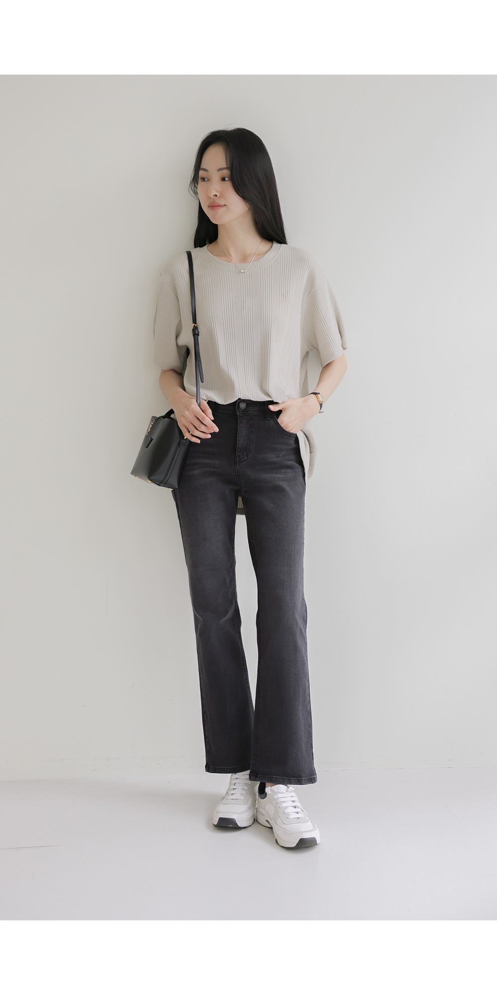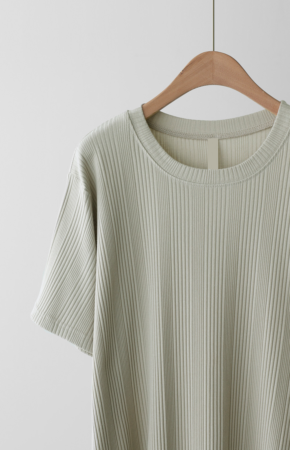 A:골지 텍스처 자체가 입체감을 주기 때문에 평면적인 티셔츠보다 속옷 라인 부각이 훨씬 덜해요. 적당히 탄탄한 두께감이 살결을 잡아주어 안정적으로 입으실 수 있어요.
