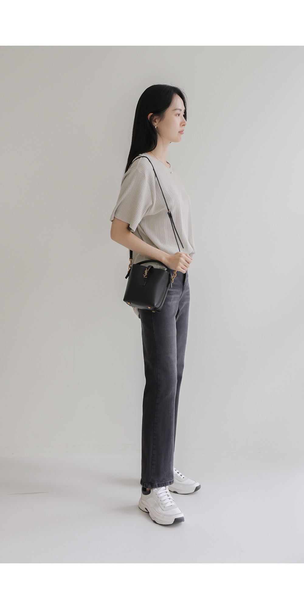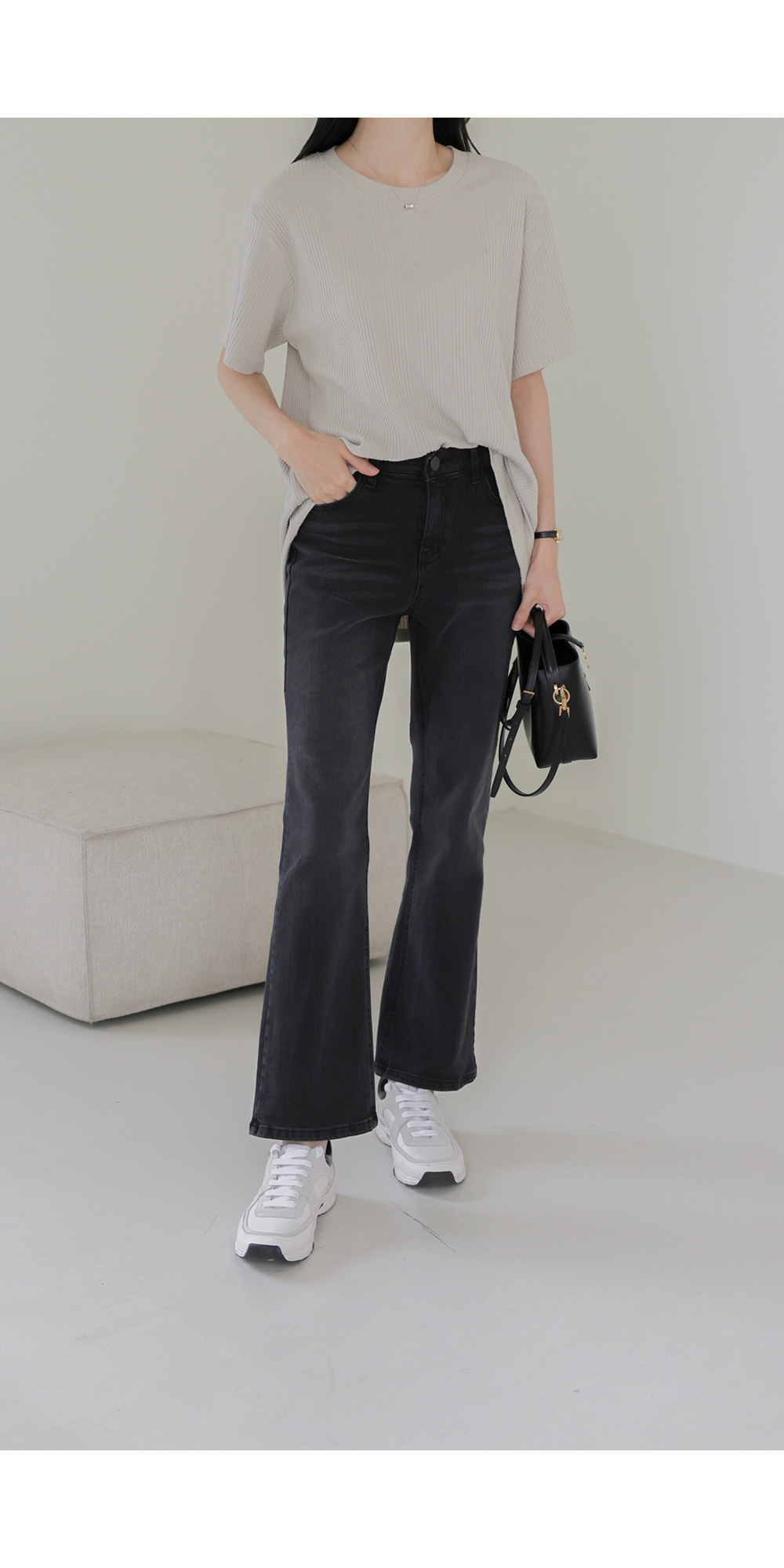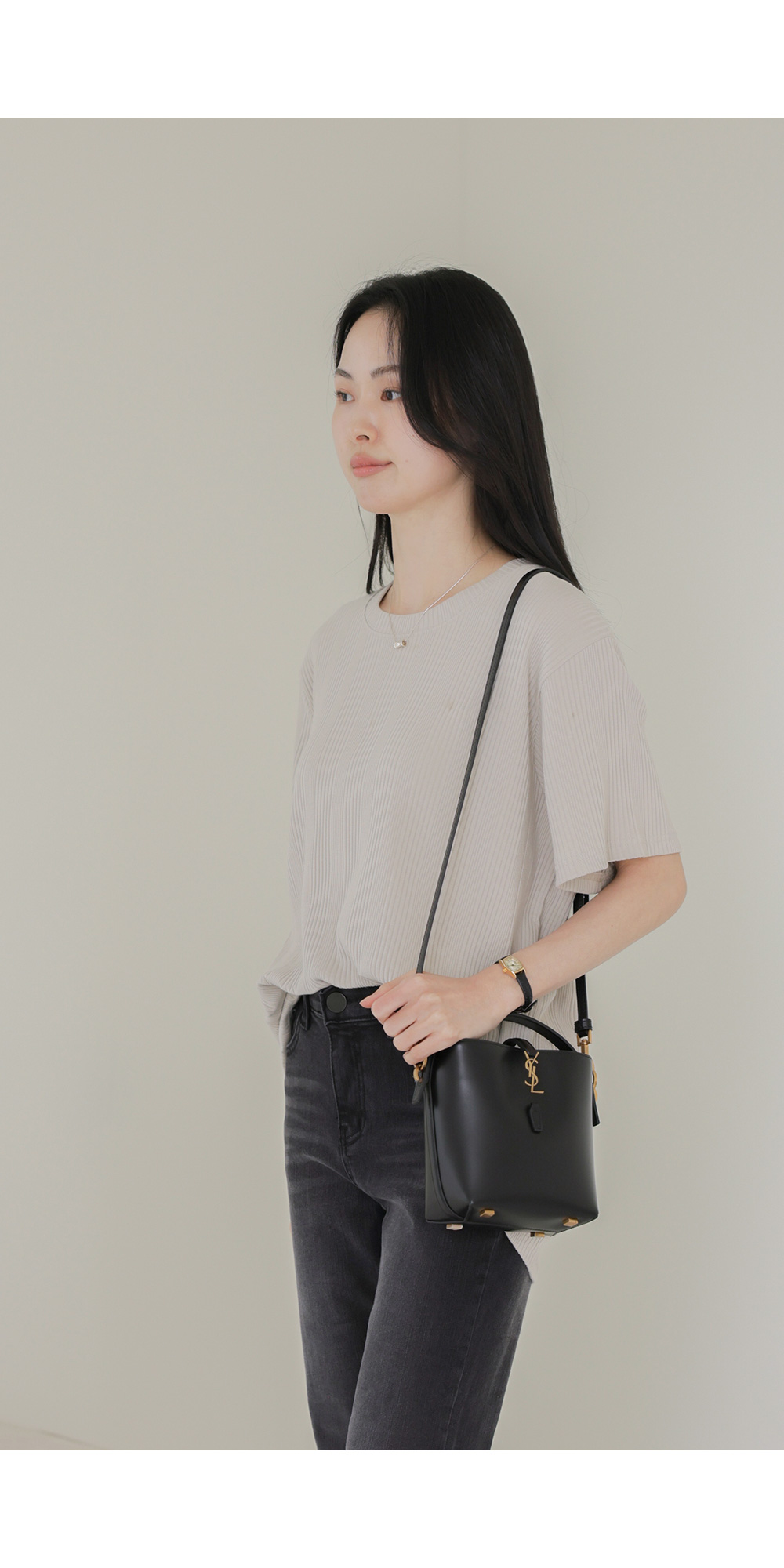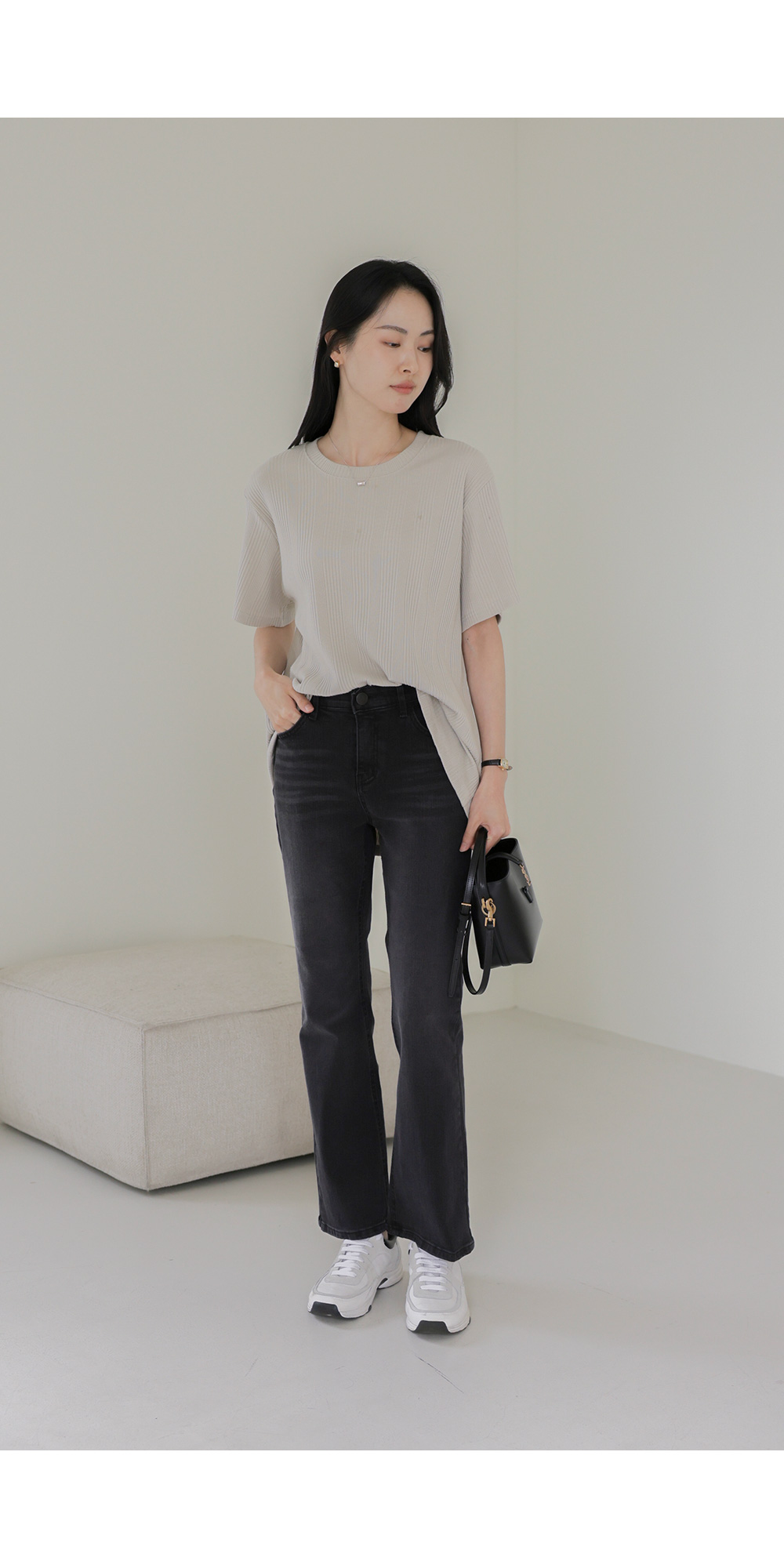 A:골지 텍스처 자체가 입체감을 주기 때문에 평면적인 티셔츠보다 속옷 라인 부각이 훨씬 덜해요. 적당히 탄탄한 두께감이 살결을 잡아주어 안정적으로 입으실 수 있어요.