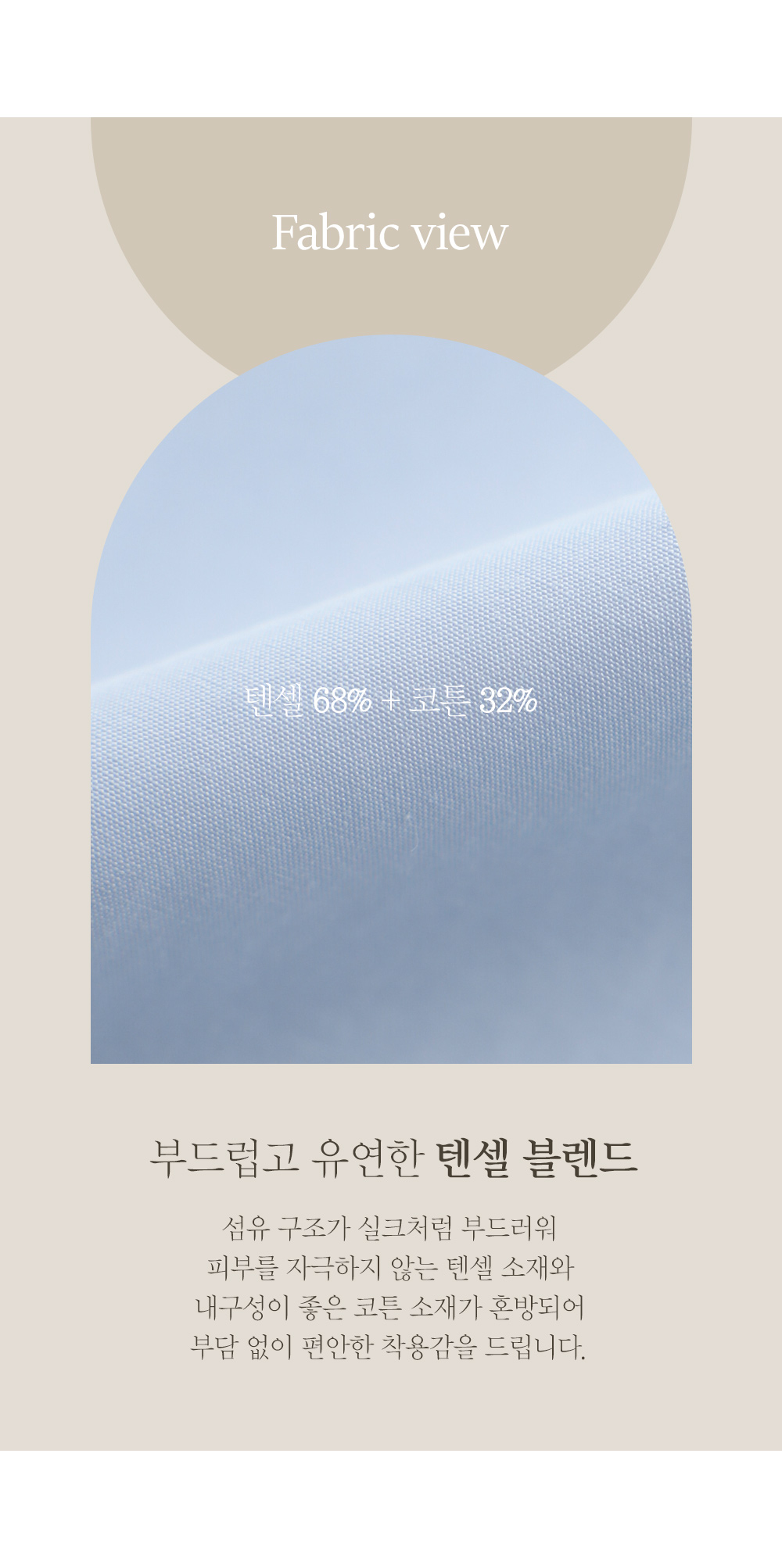 텐셀의 실크 같은 부드러움과 코튼의 내추럴하고 탄탄한 조직감이 결합된 고급 원단이에요. 피부 자극이 거의 없는 소프트한 터칭감 덕분에 이너 없이 단독으로 입어도 포근하구요. 원단 자체가 주는 은은한 광택감과 힘 있는 텍스처 덕분에 구김이 가도 자연스러운 멋이 느껴지는 소재입니다. ![]() MD가 답하는 안심 Q&A