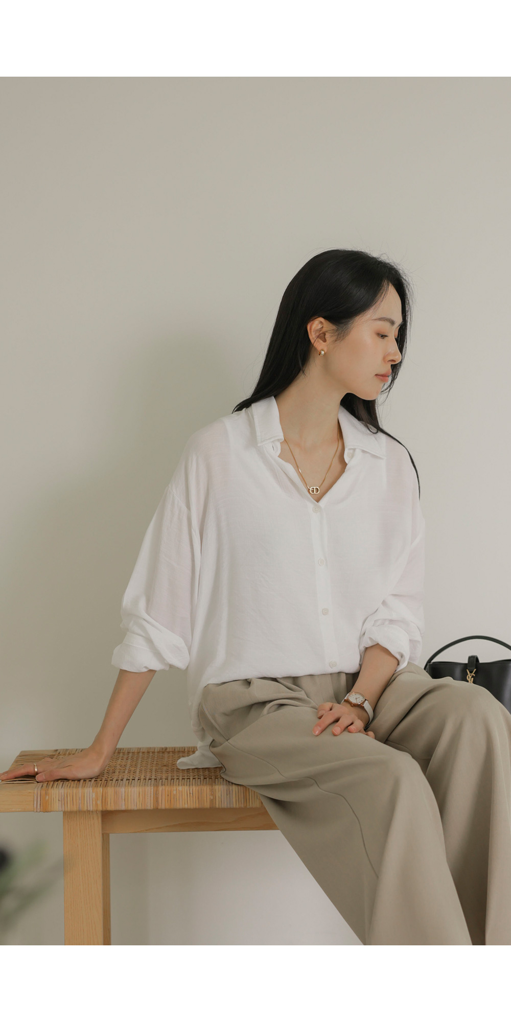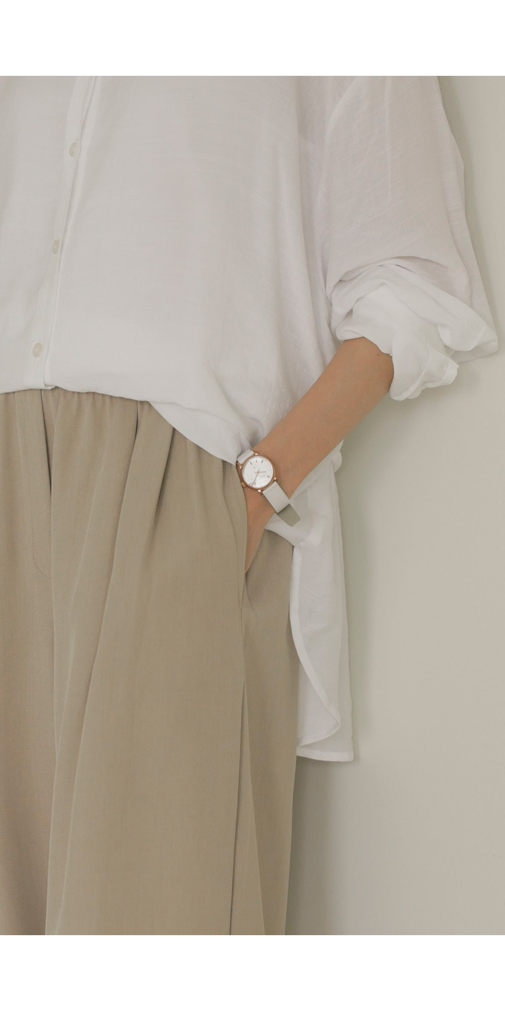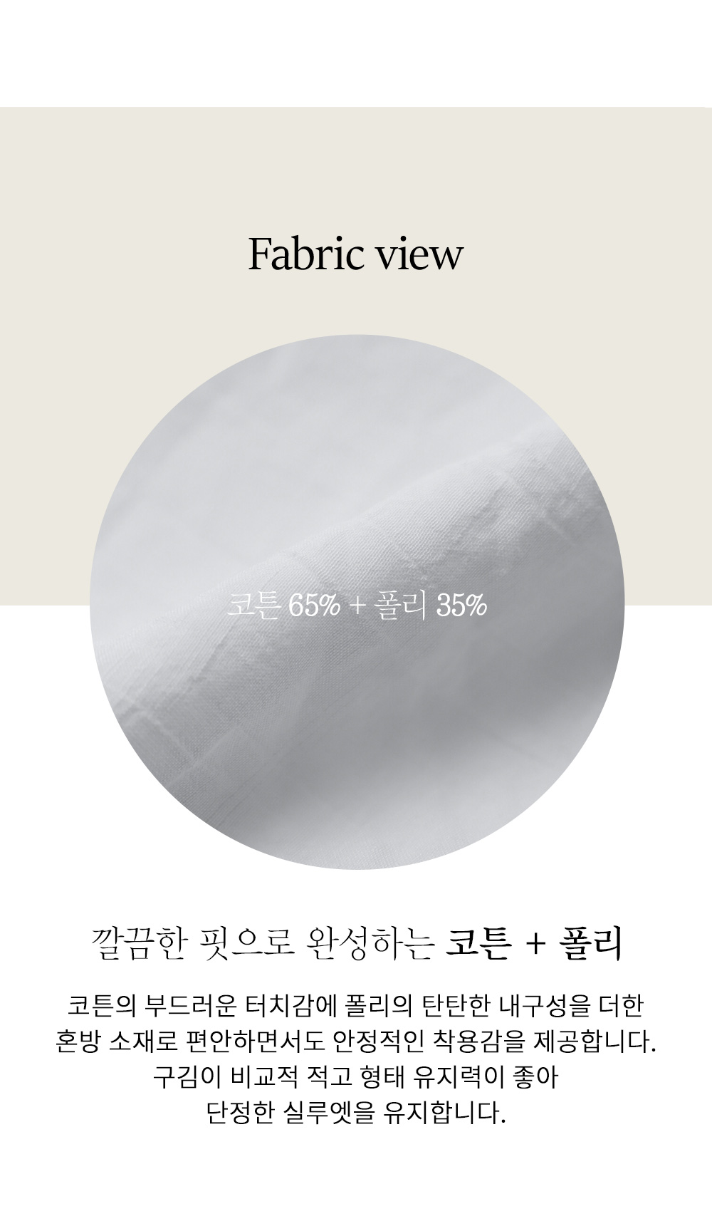탄탄한 조직감이 느껴지는 코튼 베이스 소재를 사용하여 피부에 닿는 느낌이 매우 산뜻하고 쾌적합니다. 적절한 폴리 혼방으로 구김 현상을 줄여주어 관리가 용이하며, 소재 자체가 힘이 있어 실루엣을 무너뜨리지 않고 예쁘게 잡아줍니다. 가벼운 무게감 덕분에 장시간 착용 시에도 피로감이 적으며 쾌적한 피팅감을 오래도록 유지해 주는 원단입니다. ![]() MD가 답하는 안심 Q&A