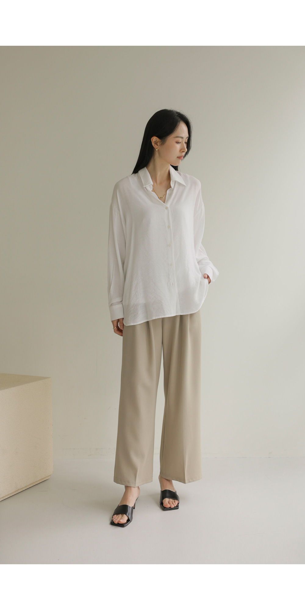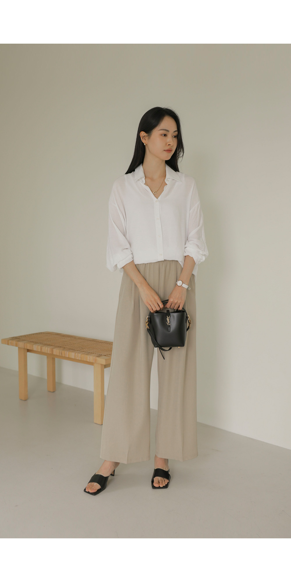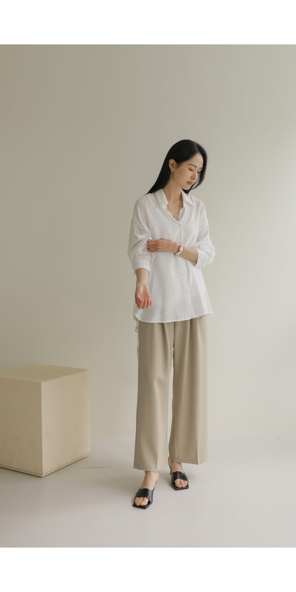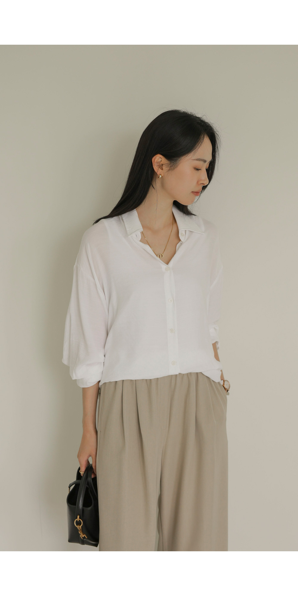 탄탄한 조직감이 느껴지는 코튼 베이스 소재를 사용하여 피부에 닿는 느낌이 매우 산뜻하고 쾌적합니다. 적절한 폴리 혼방으로 구김 현상을 줄여주어 관리가 용이하며, 소재 자체가 힘이 있어 실루엣을 무너뜨리지 않고 예쁘게 잡아줍니다. 가벼운 무게감 덕분에 장시간 착용 시에도 피로감이 적으며 쾌적한 피팅감을 오래도록 유지해 주는 원단입니다. ![]() MD가 답하는 안심 Q&A