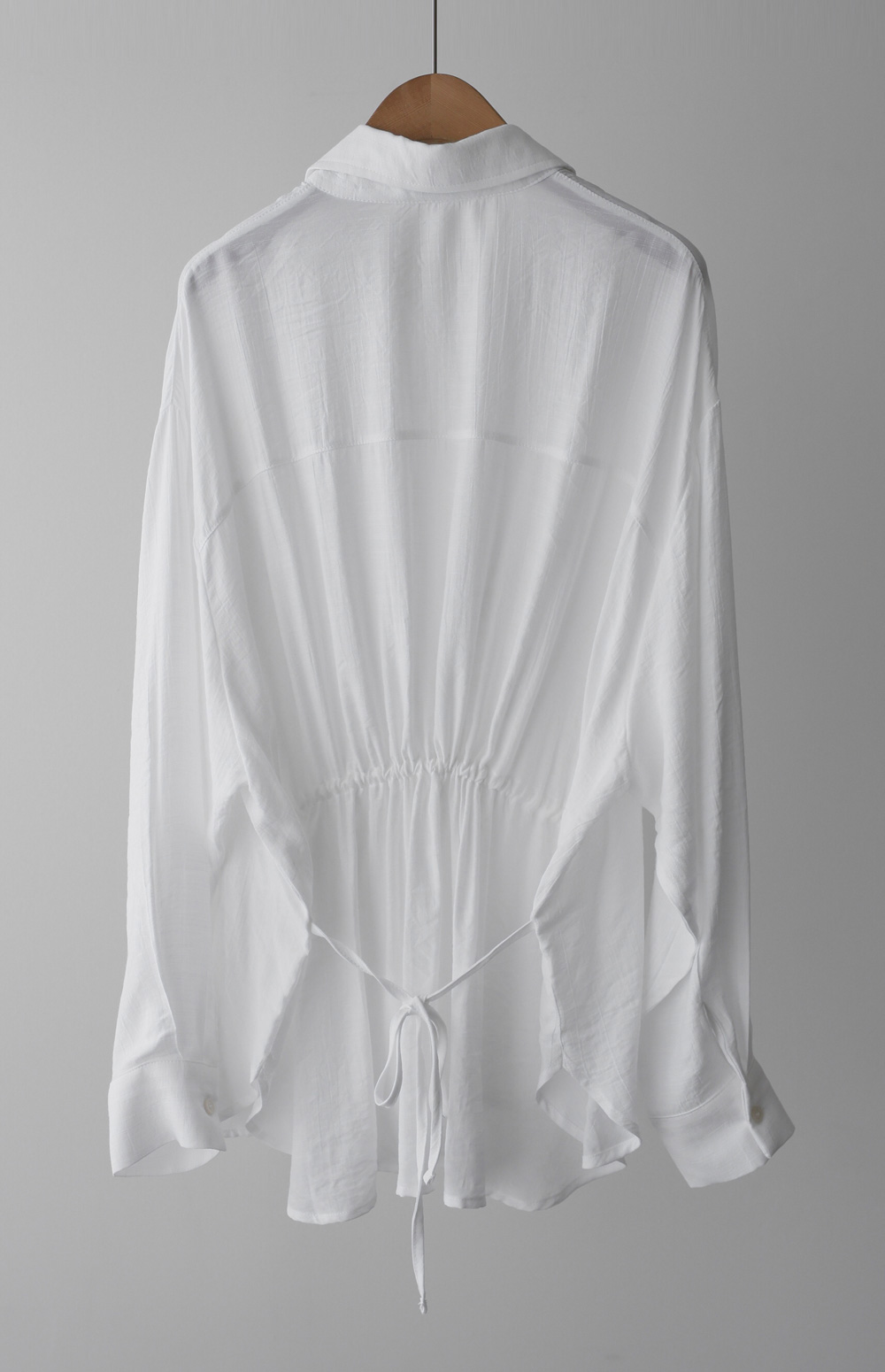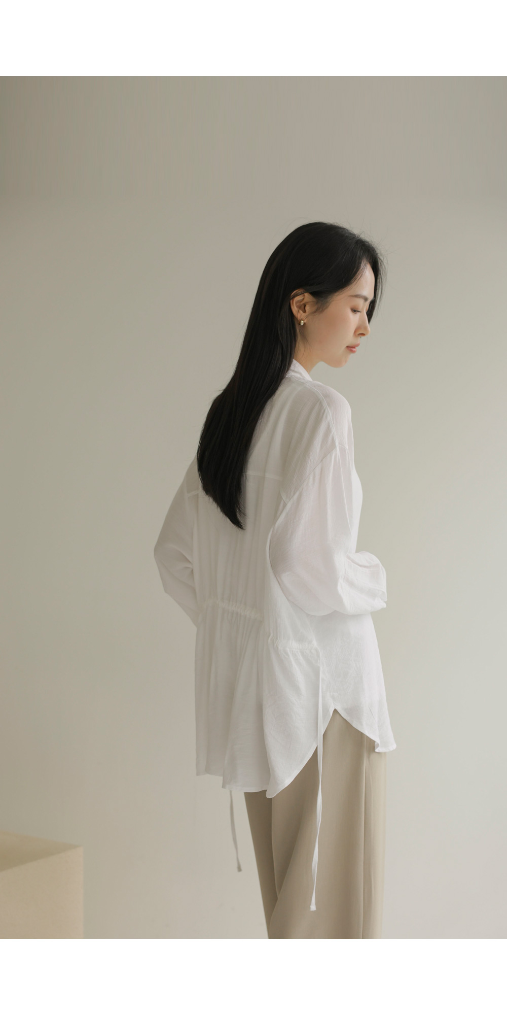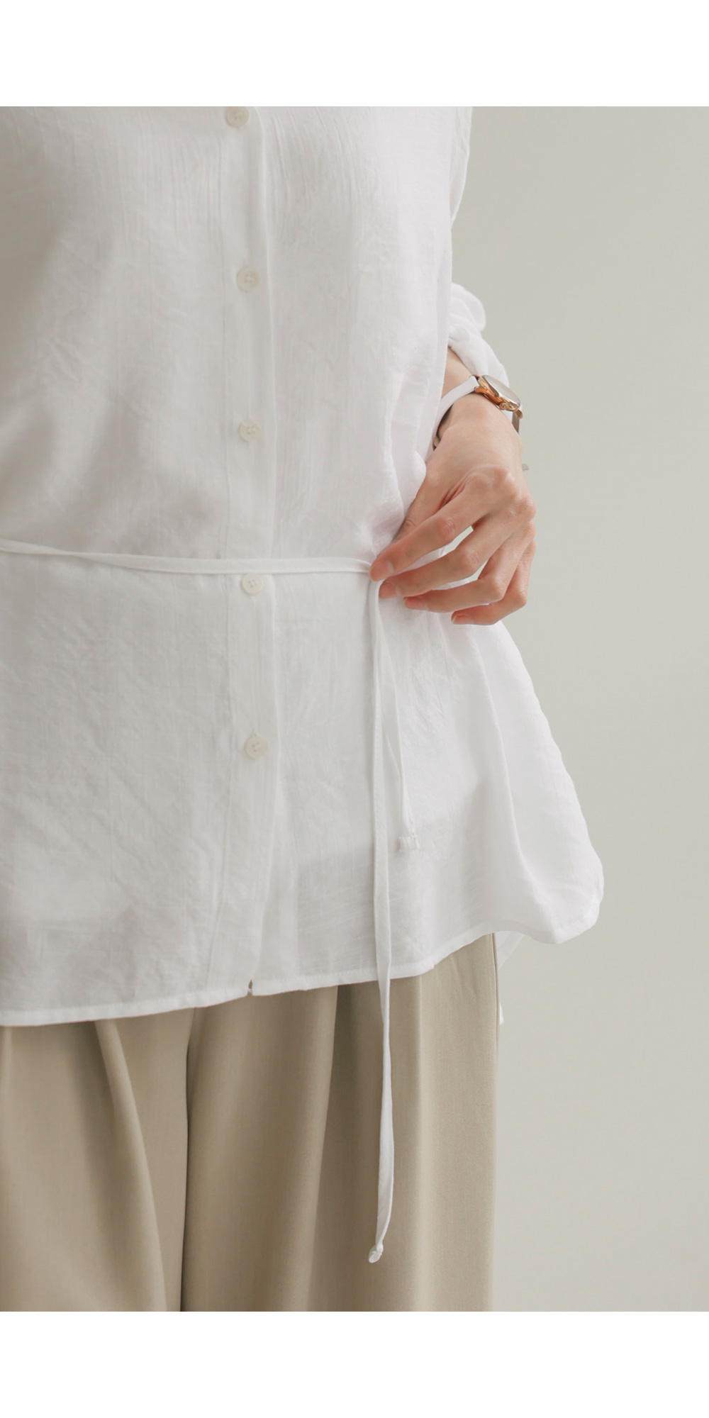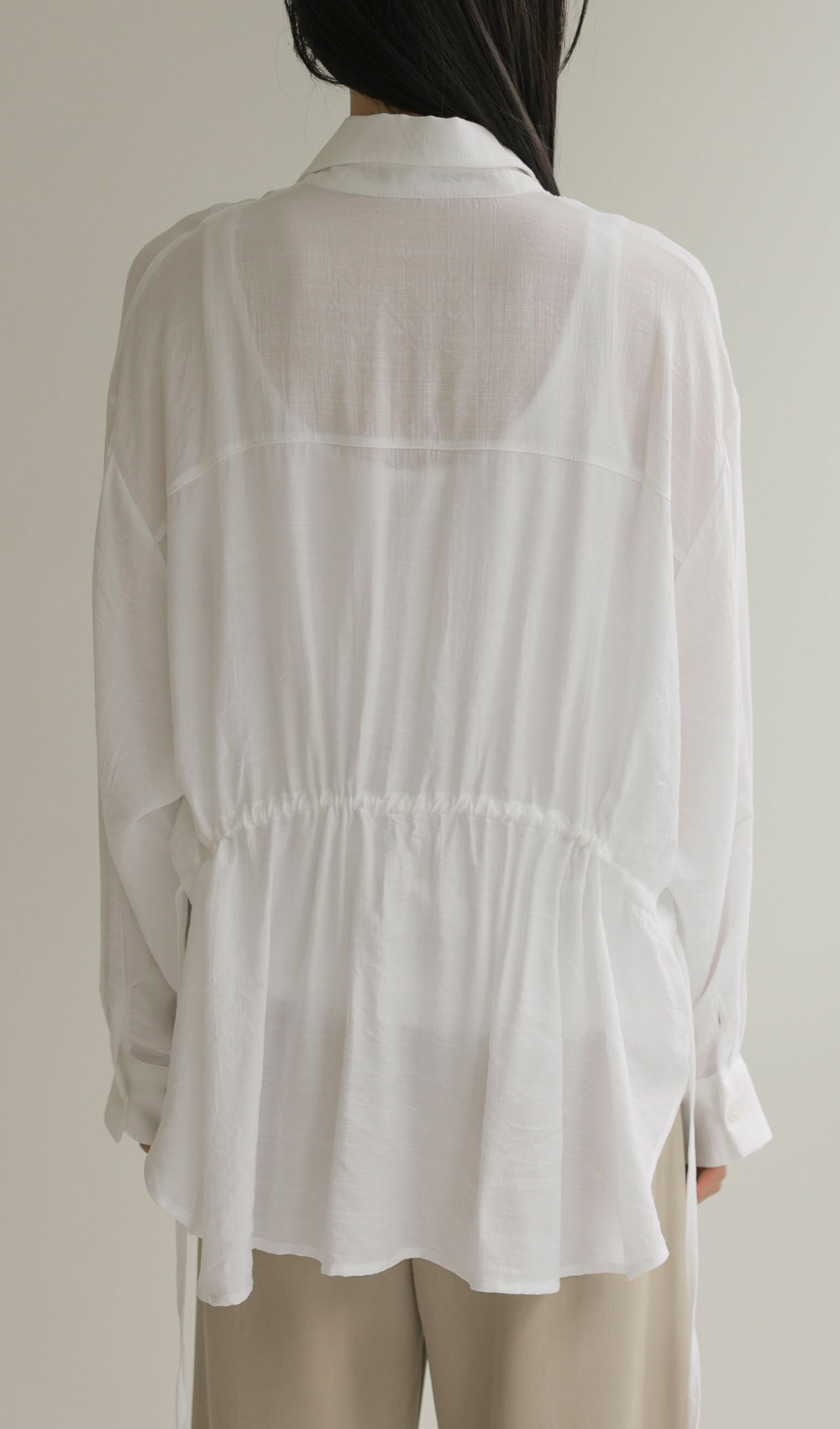 단정한 카라 디자인에 허리 뒤 스트링 디테일을 더해 세련된 실루엣을 연출해 드리는 셔츠 아이템이에요. 이 셔츠는 코튼과 폴리가 적절히 혼방되어 피부에 닿는 감촉이 쾌적하며, 허리 뒷부분에 스트링이 있어 본인의 체형에 맞게 품을 조절할 수 있다는 점이 가장 큰 매력이랍니다.