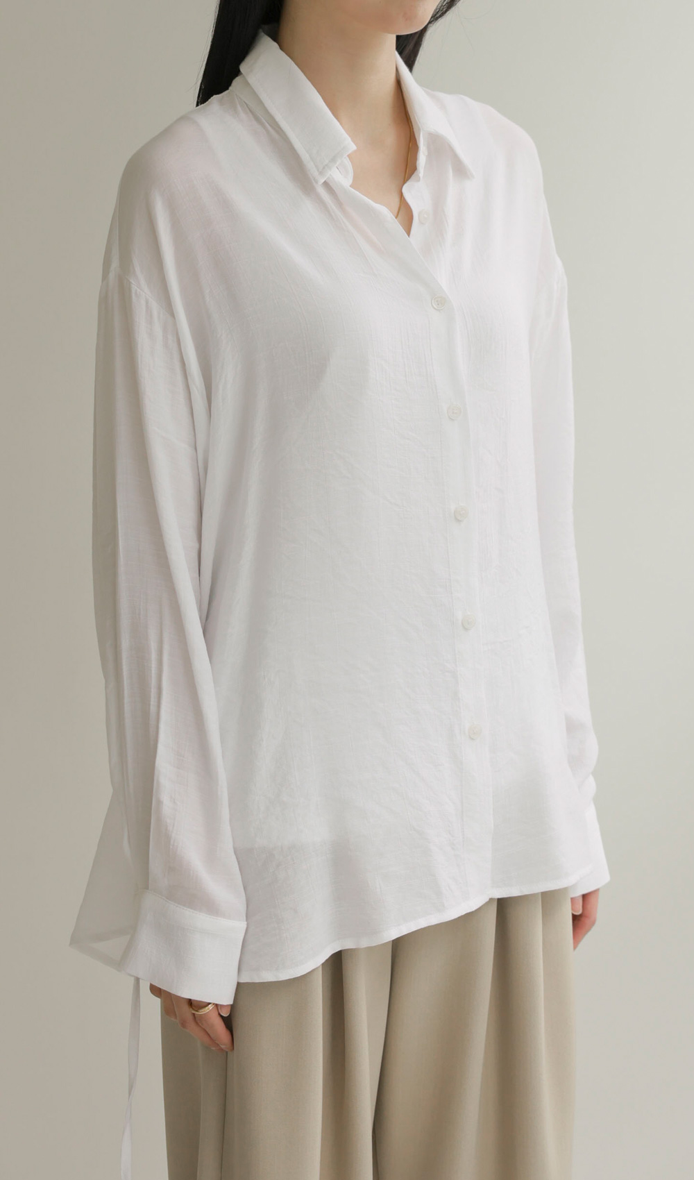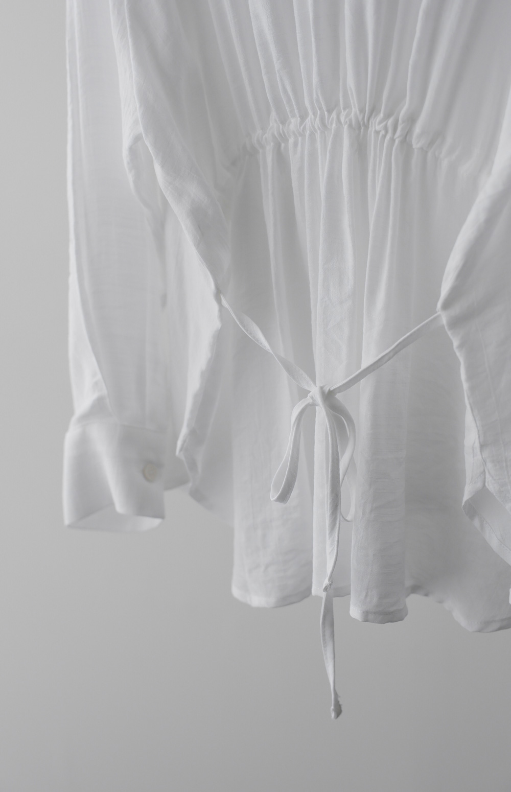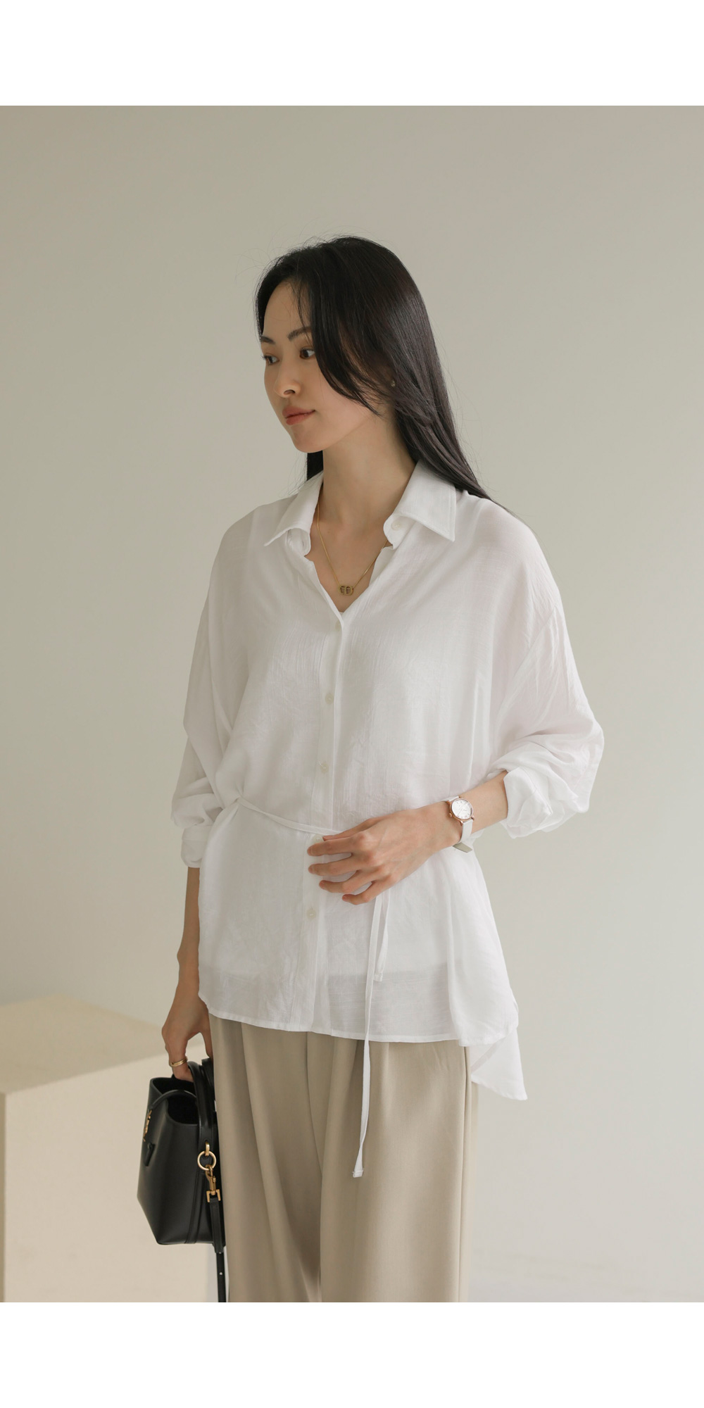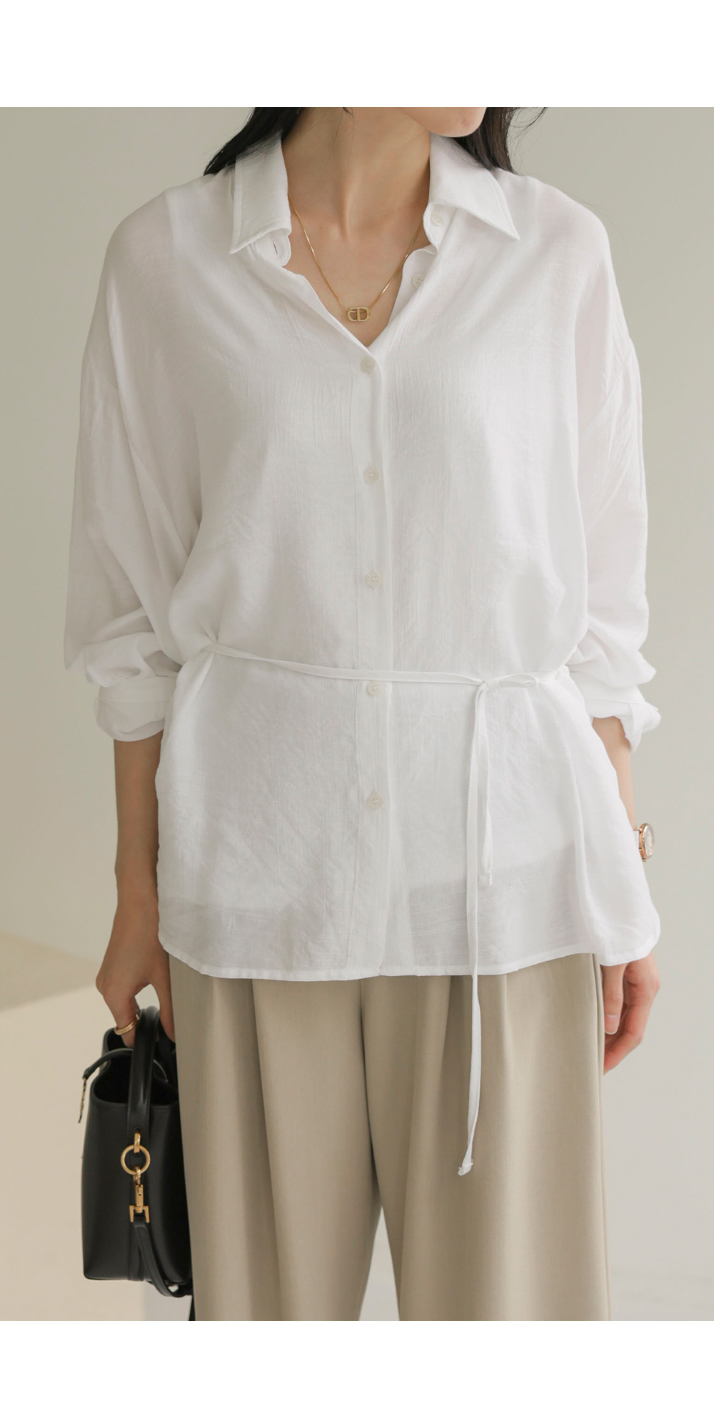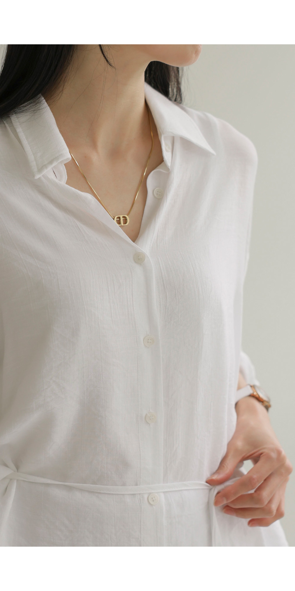 단정한 카라 디자인에 허리 뒤 스트링 디테일을 더해 세련된 실루엣을 연출해 드리는 셔츠 아이템이에요. 이 셔츠는 코튼과 폴리가 적절히 혼방되어 피부에 닿는 감촉이 쾌적하며, 허리 뒷부분에 스트링이 있어 본인의 체형에 맞게 품을 조절할 수 있다는 점이 가장 큰 매력이랍니다.