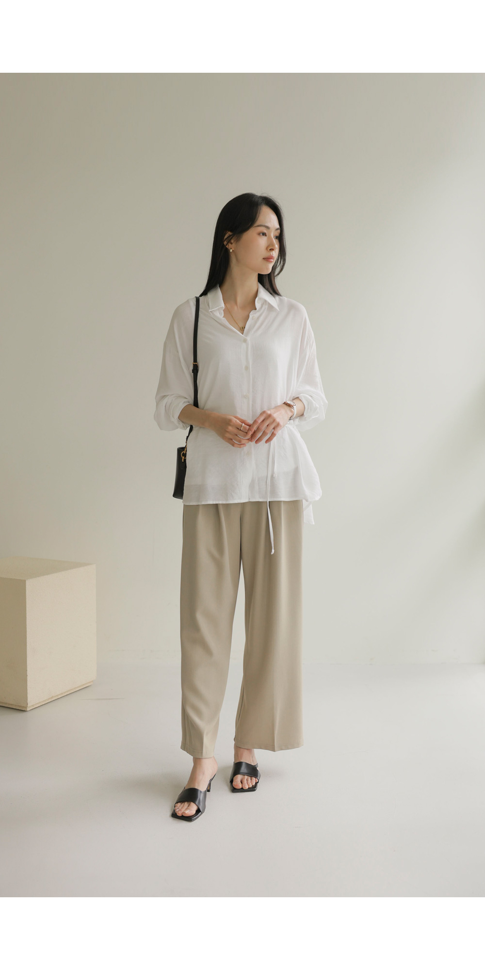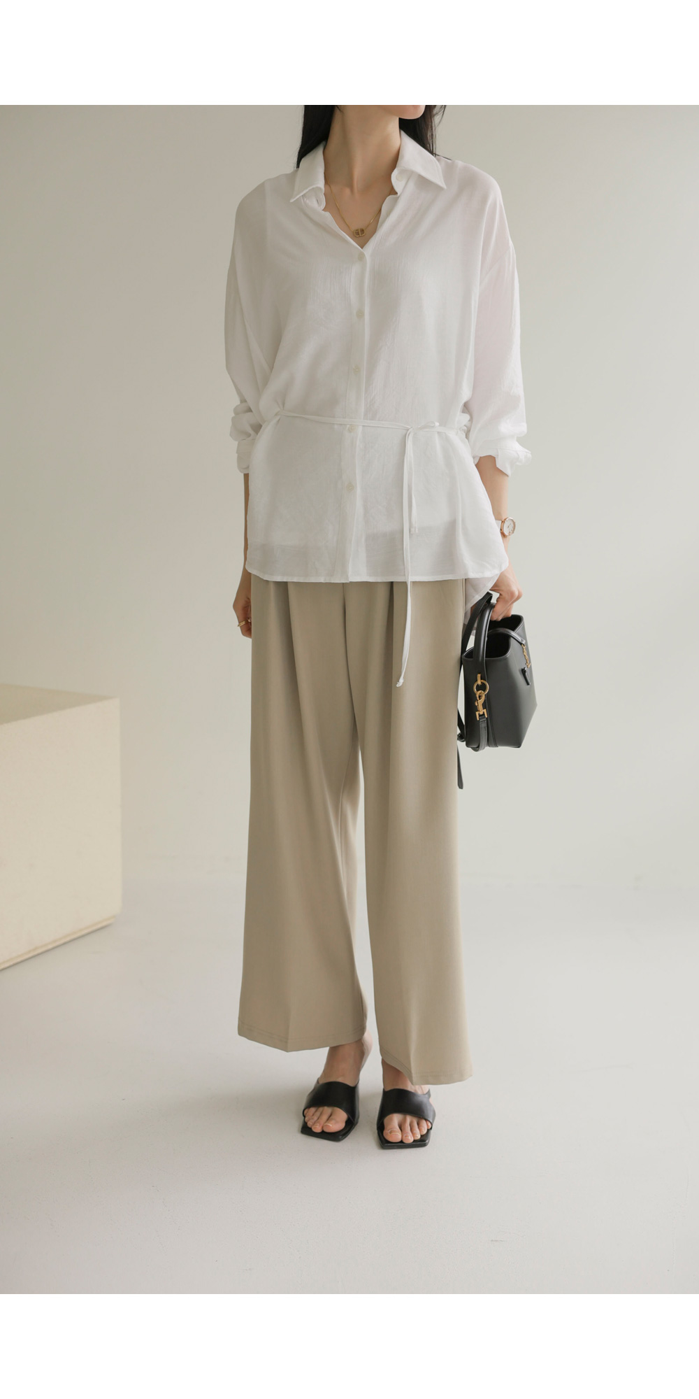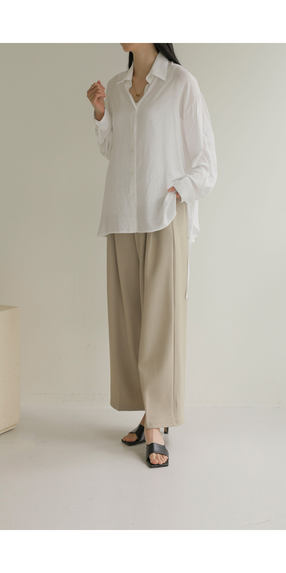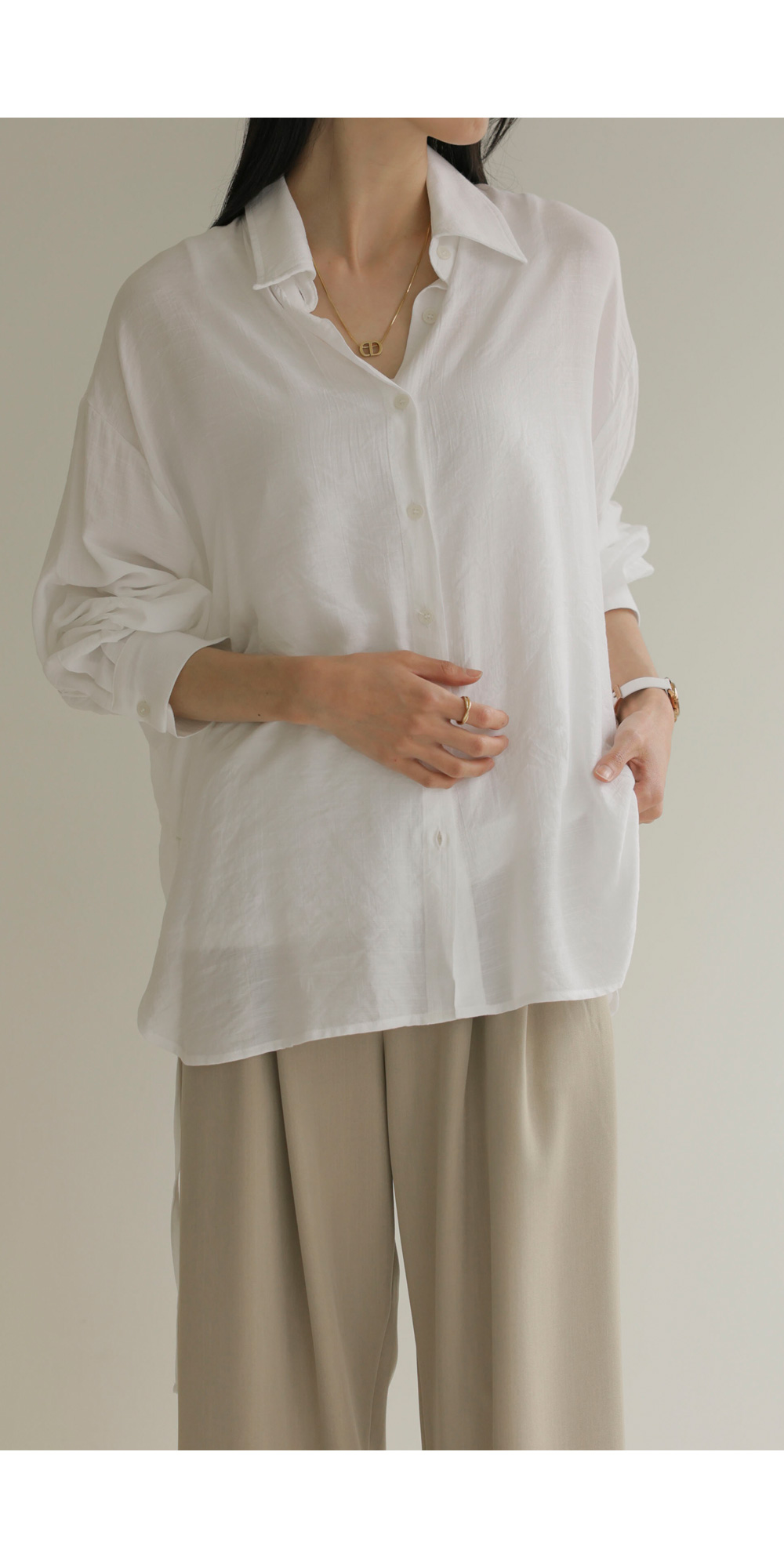 단정한 카라 디자인에 허리 뒤 스트링 디테일을 더해 세련된 실루엣을 연출해 드리는 셔츠 아이템이에요. 이 셔츠는 코튼과 폴리가 적절히 혼방되어 피부에 닿는 감촉이 쾌적하며, 허리 뒷부분에 스트링이 있어 본인의 체형에 맞게 품을 조절할 수 있다는 점이 가장 큰 매력이랍니다.