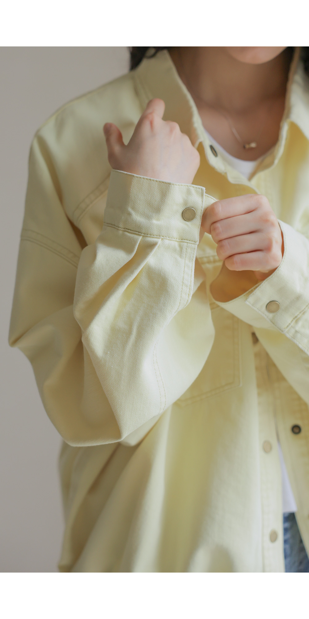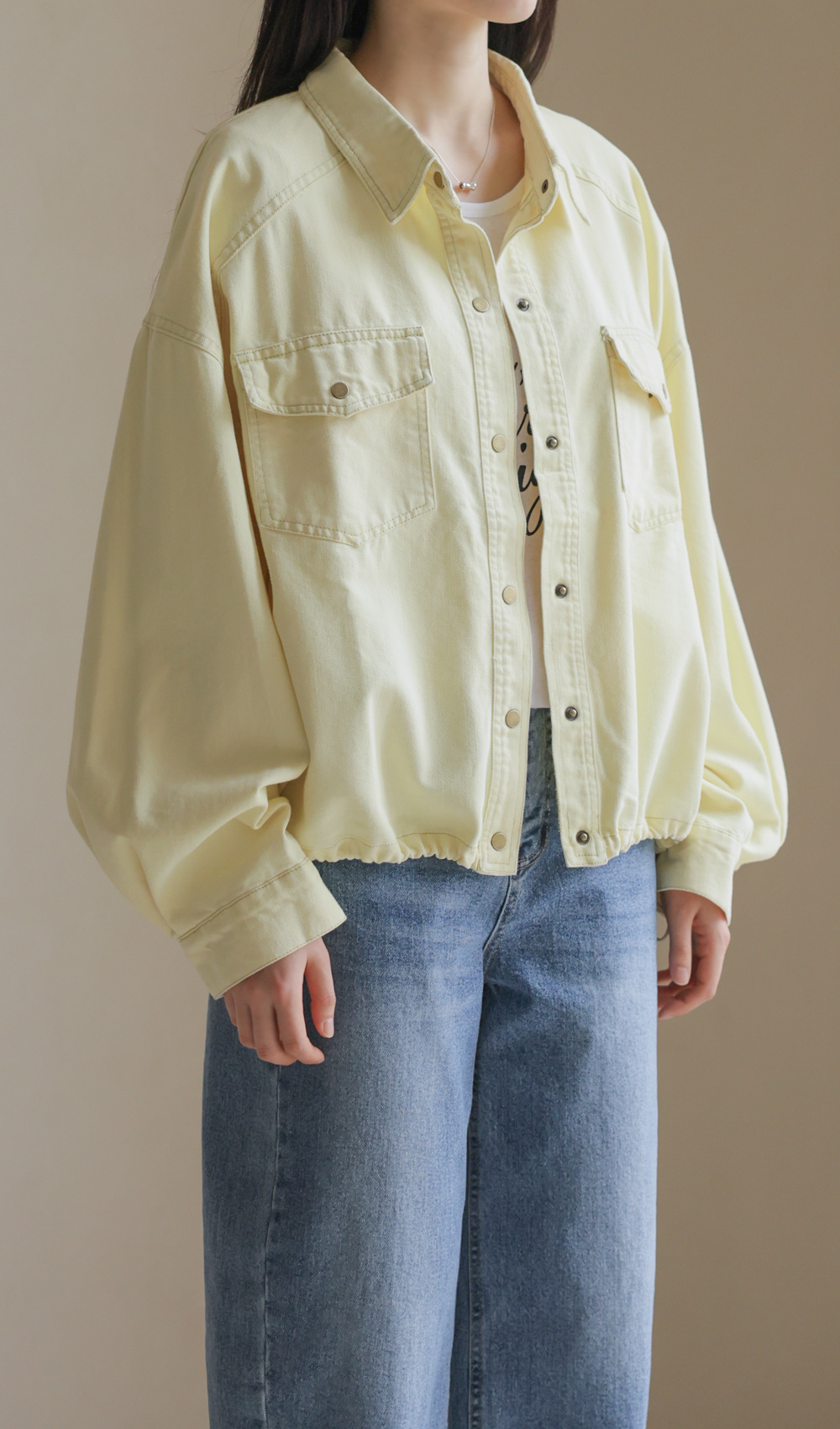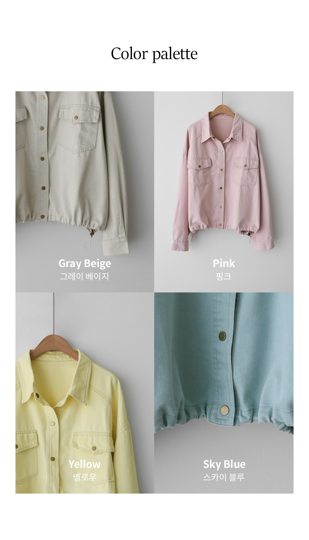 간절기 시즌부터 초여름까지 가볍고 산뜻하게 즐기기 좋은 데님 자켓 아이템이에요. 옐로우, 스카이블루, 핑크, 그리고 차분한 그레이베이지까지 총 4가지의 화사하고 감각적인 컬러 구성으로 준비했답니다.