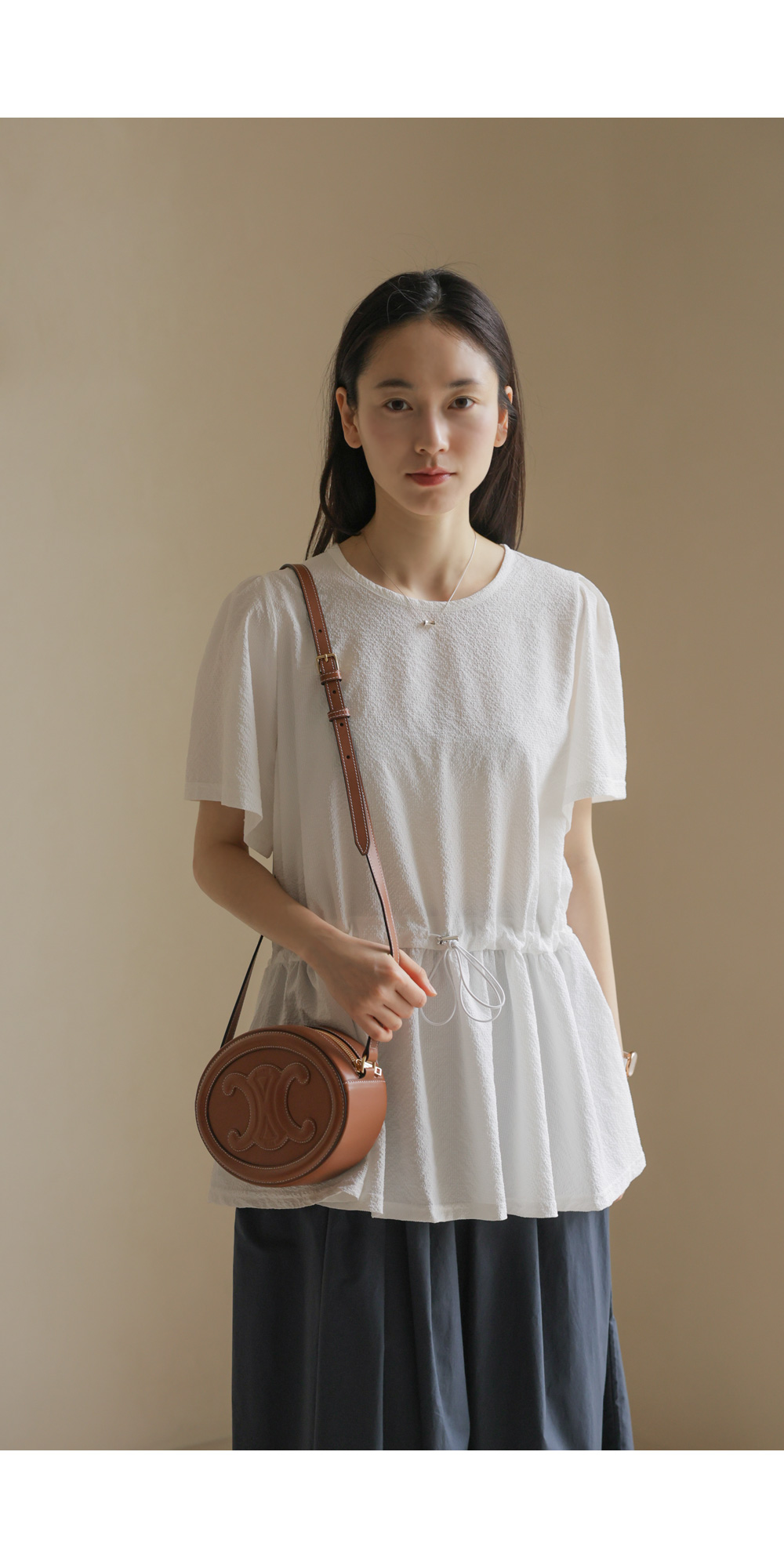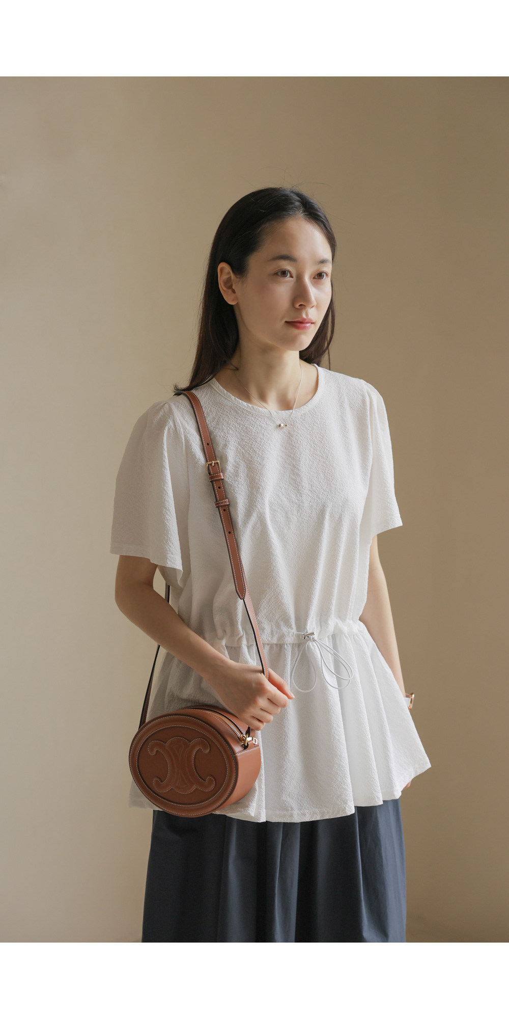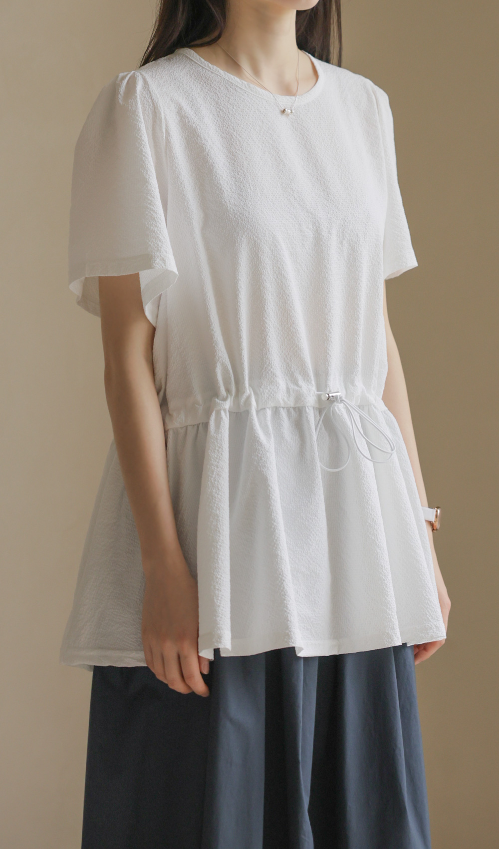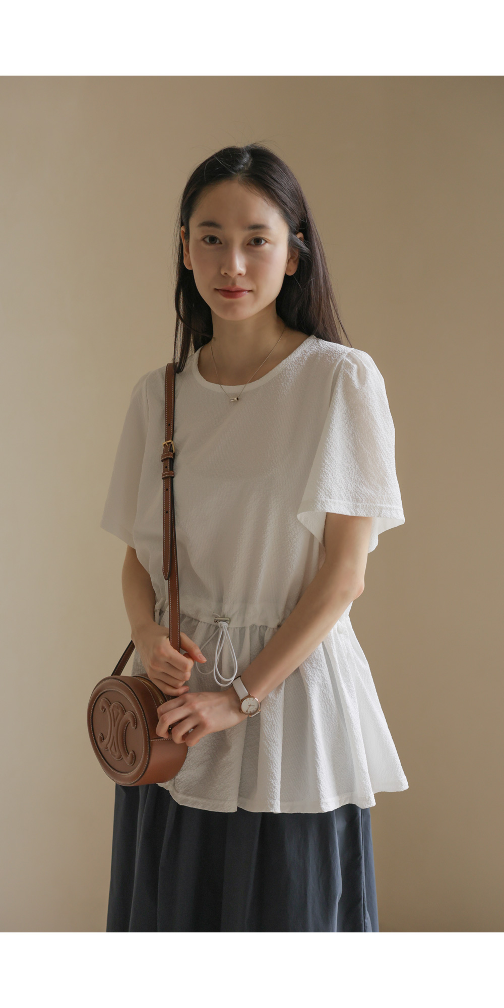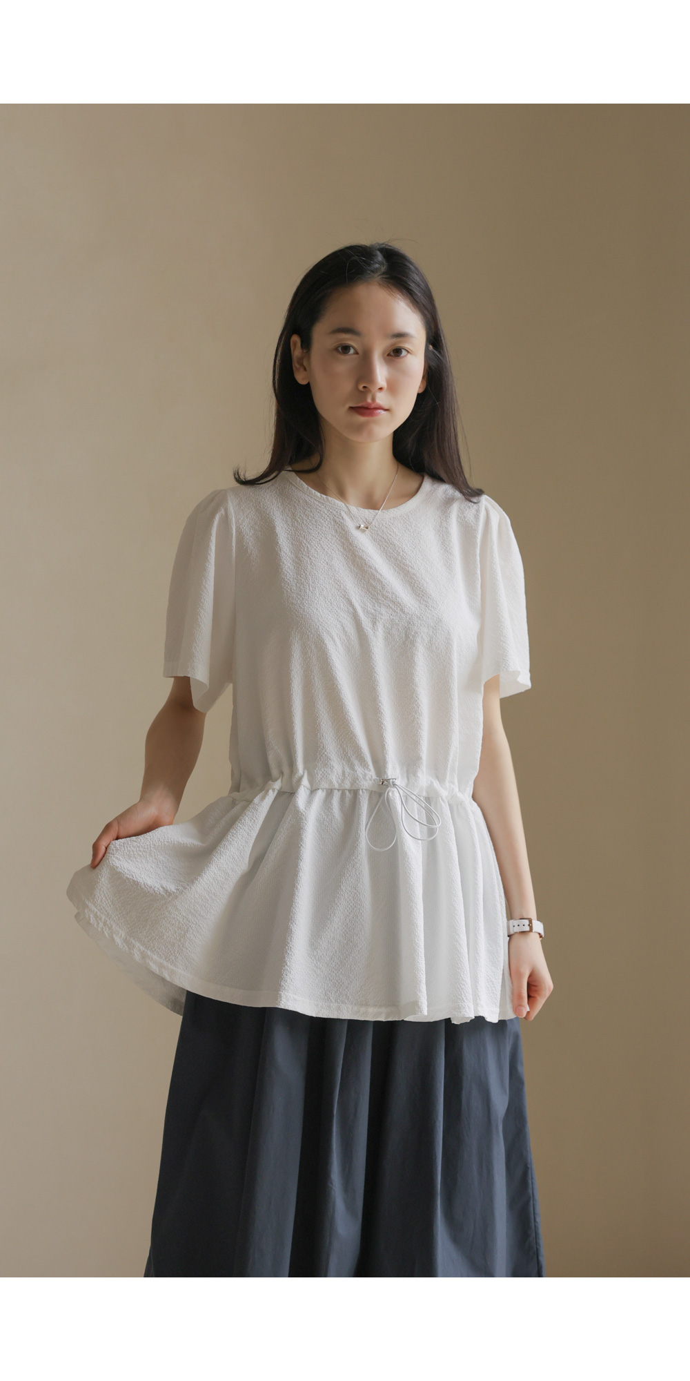 은은하고 입체적인 텍스처가 돋보이는 원단으로 제작되어 밋밋함 없이 고급스러운 무드를 전해주는 블라우스 소개드려요.