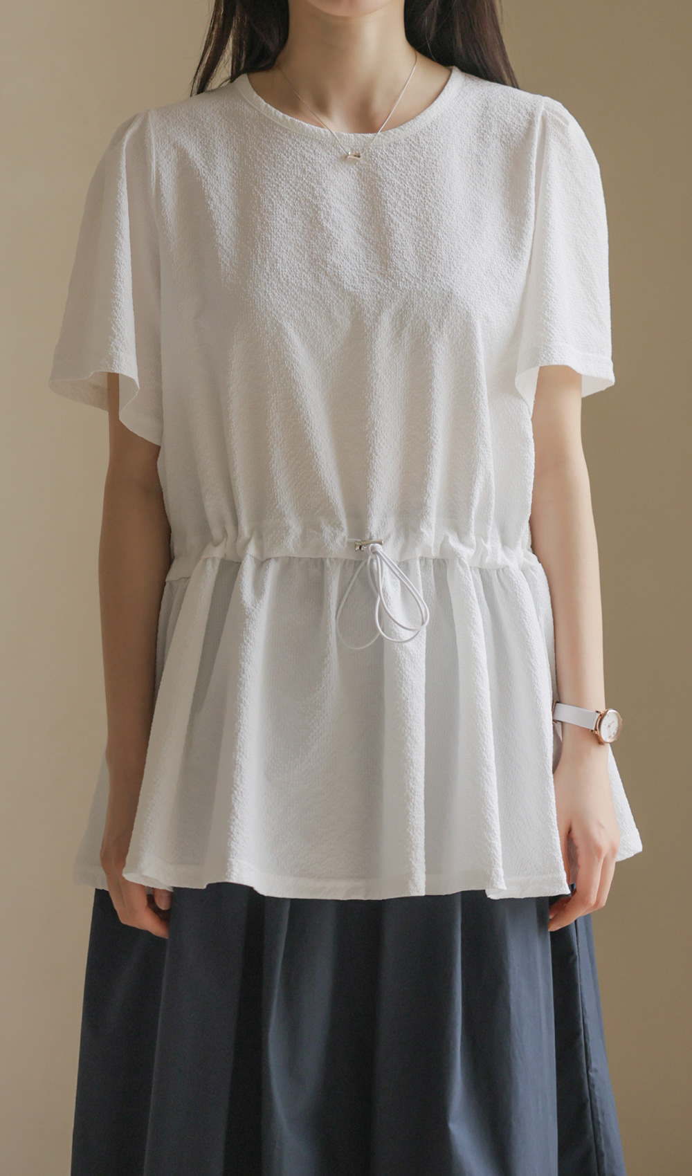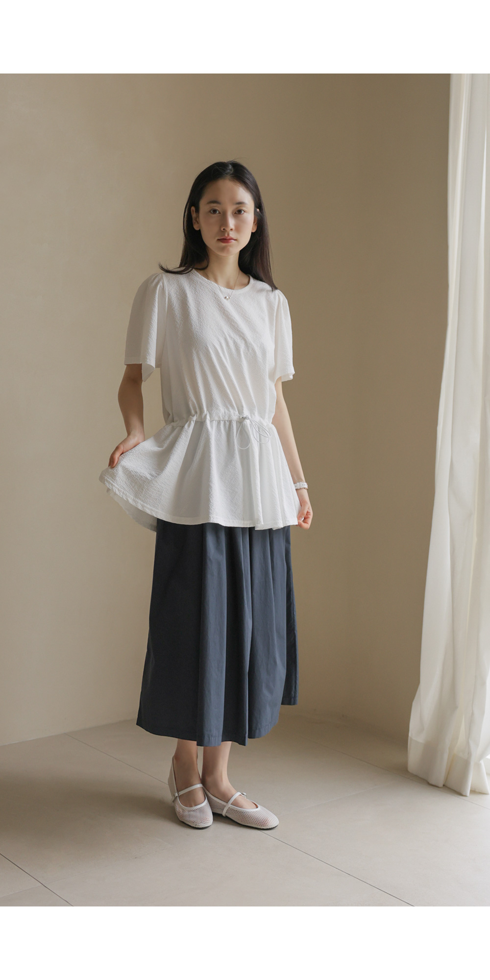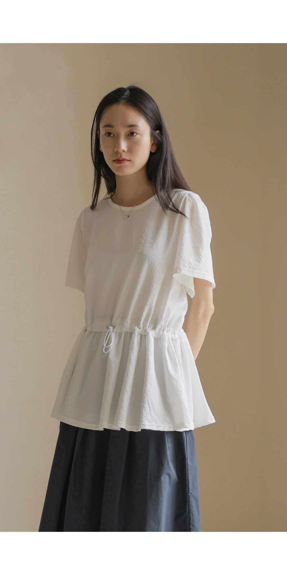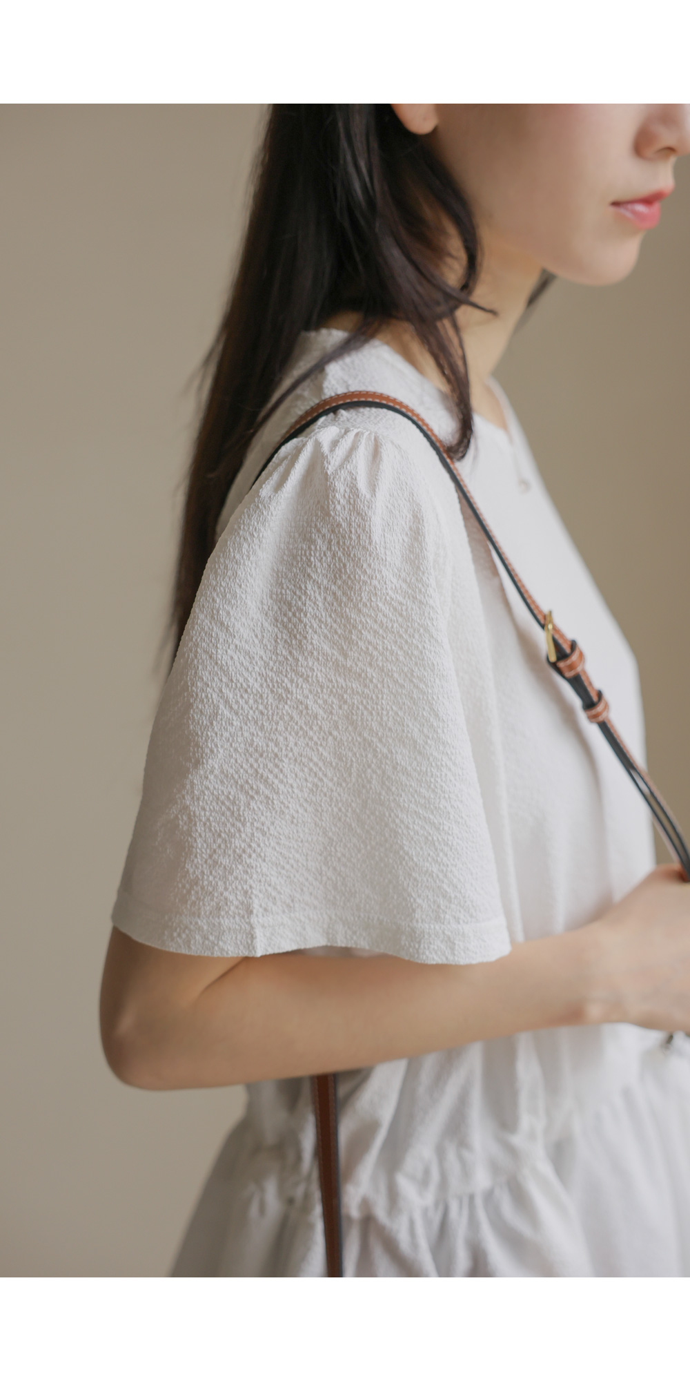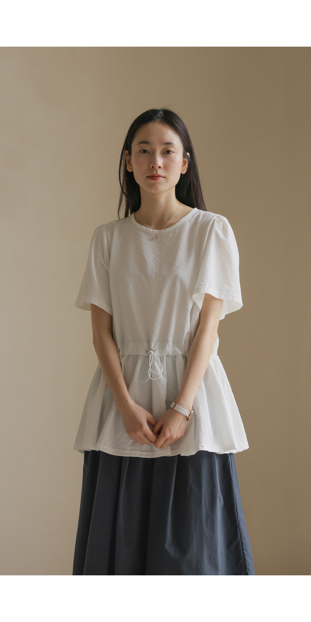 은은하고 입체적인 텍스처가 돋보이는 원단으로 제작되어 밋밋함 없이 고급스러운 무드를 전해주는 블라우스 소개드려요.