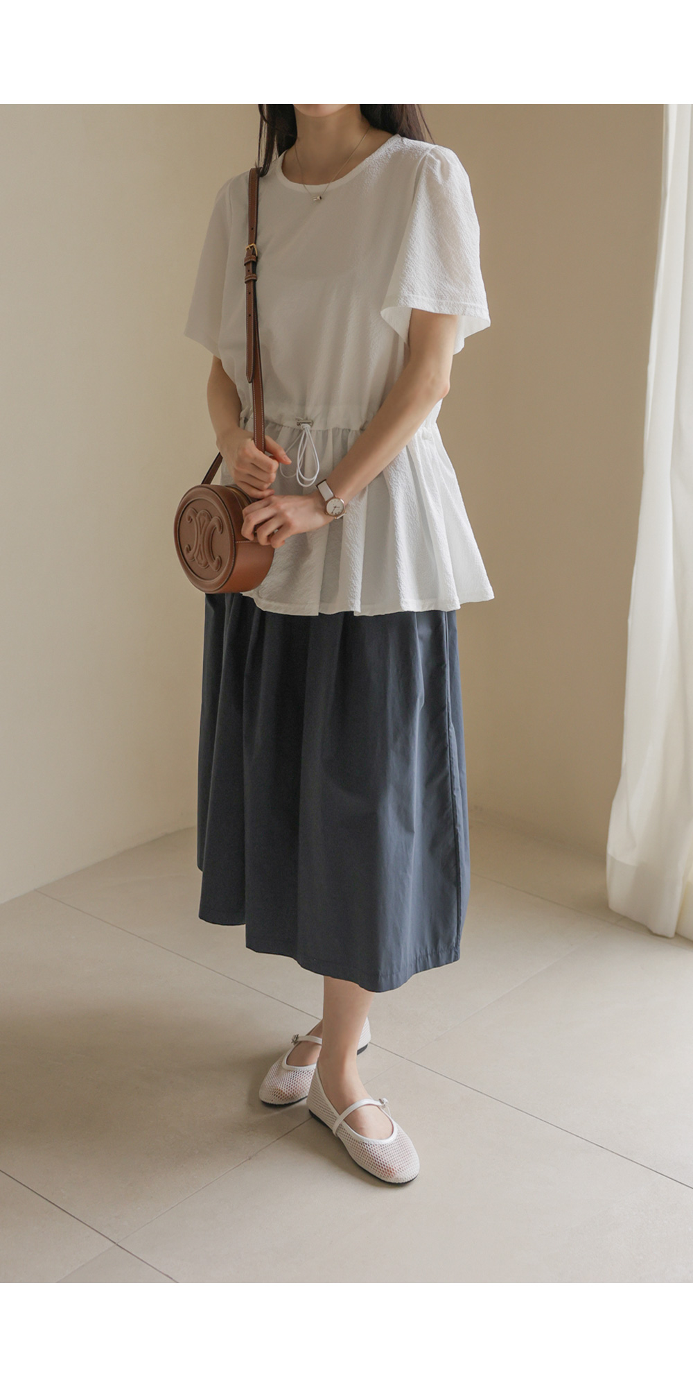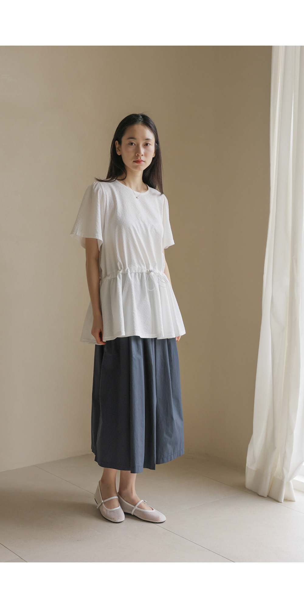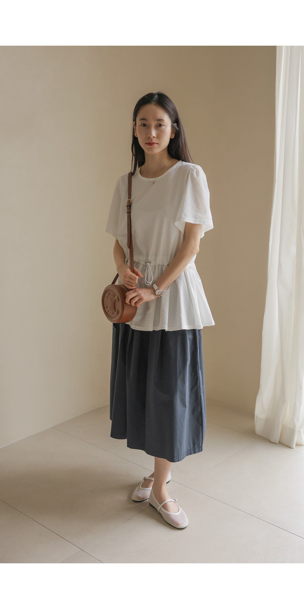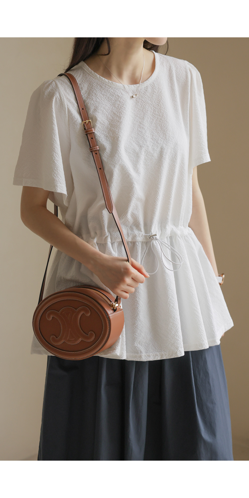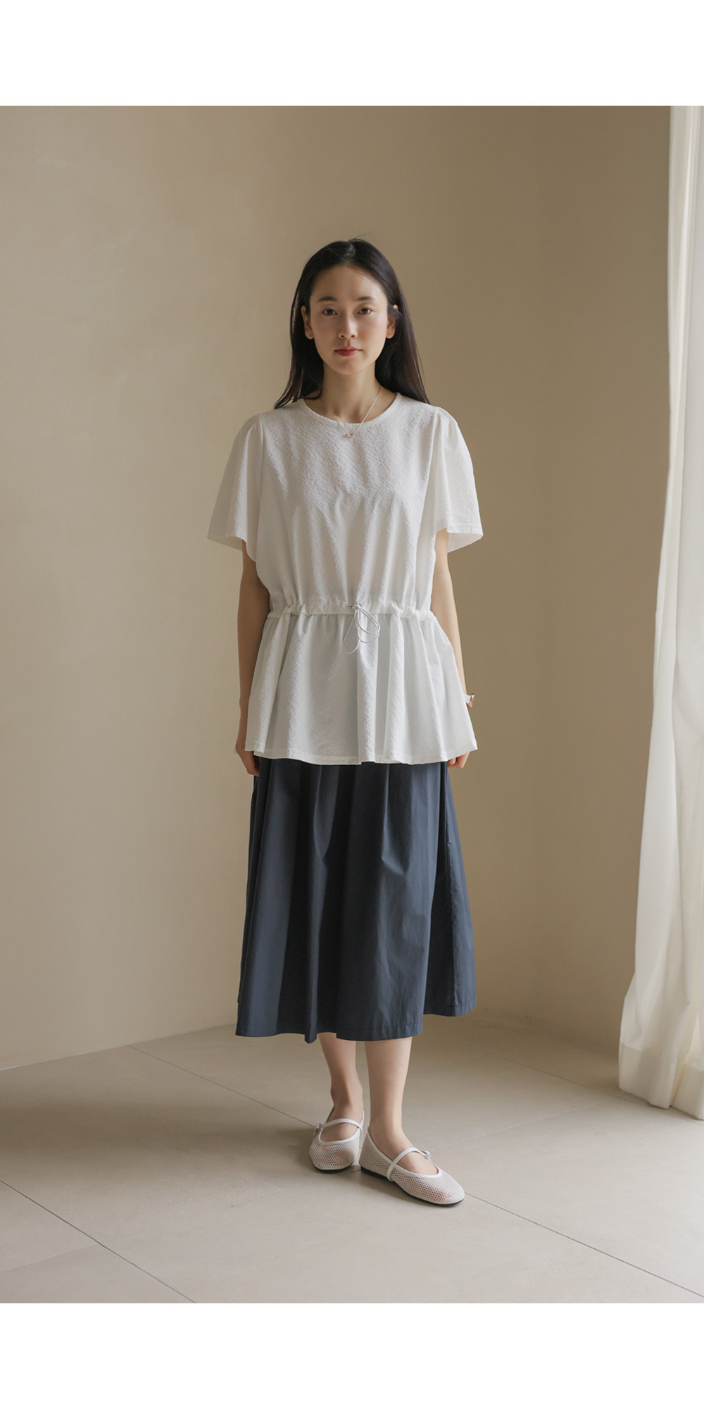 은은하고 입체적인 텍스처가 돋보이는 원단으로 제작되어 밋밋함 없이 고급스러운 무드를 전해주는 블라우스 소개드려요.