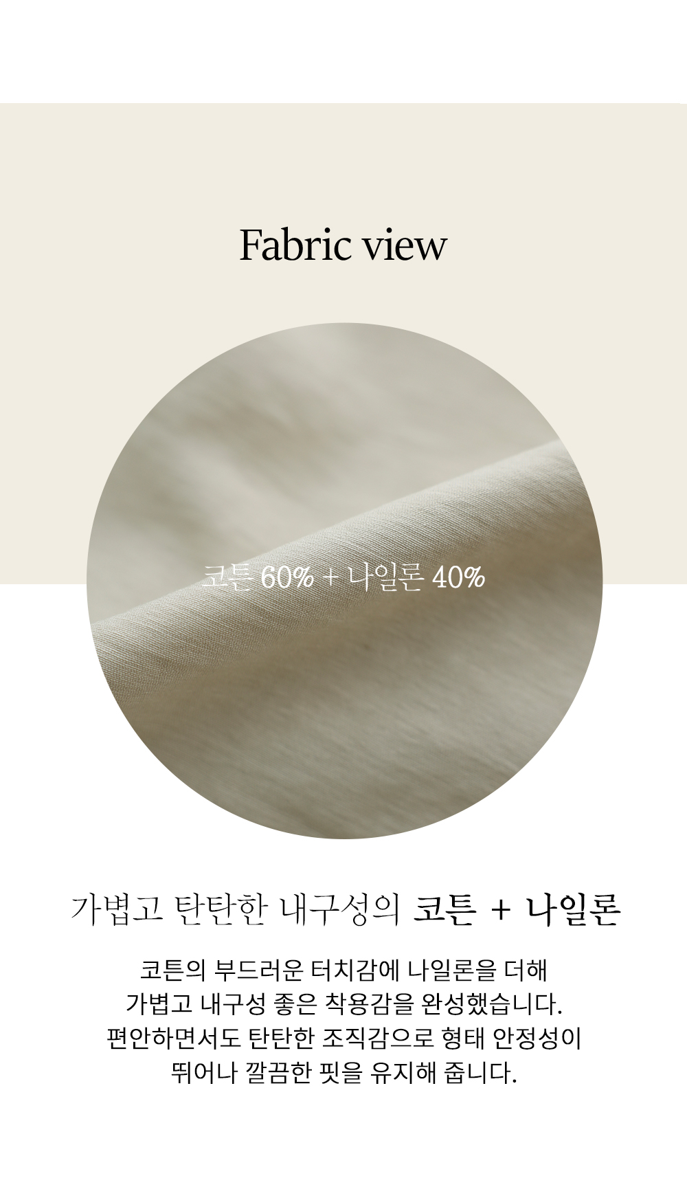 코튼의 부드러움과 나일론의 탄탄하고 가벼운 성질이 적절히 섞인 원단을 사용했어요. 구김이 심하게 가지 않으면서도 은은한 광택감이 감돌아 고급스러워 보이며, 바람을 잘 막아주어 간절기 아우터로 최적의 쾌적함을 선사해요. ![]() MD가 답하는 안심 Q&A