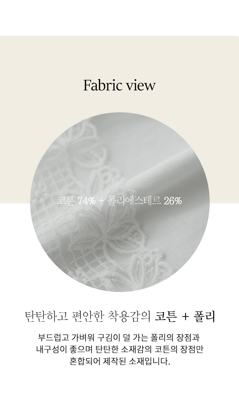 코튼과 폴리가 최적의 비율로 혼합되어 가볍고 부드러운 터칭감의 소재감을 자랑해요. 피부에 닿을 때 끈적임 없이 보들보들한 촉감을 유지해 주며, 얇은 두께감 덕분에 통기성이 매우 우수하답니다. 레이스 부분 역시 빳빳하지 않고 유연한 원단을 사용하여 장시간 착용해도 피부에 자극 없이 편안한 컨디션을 선사해 줘요. ![]() ![]() MD가 답하는 안심 Q&A
