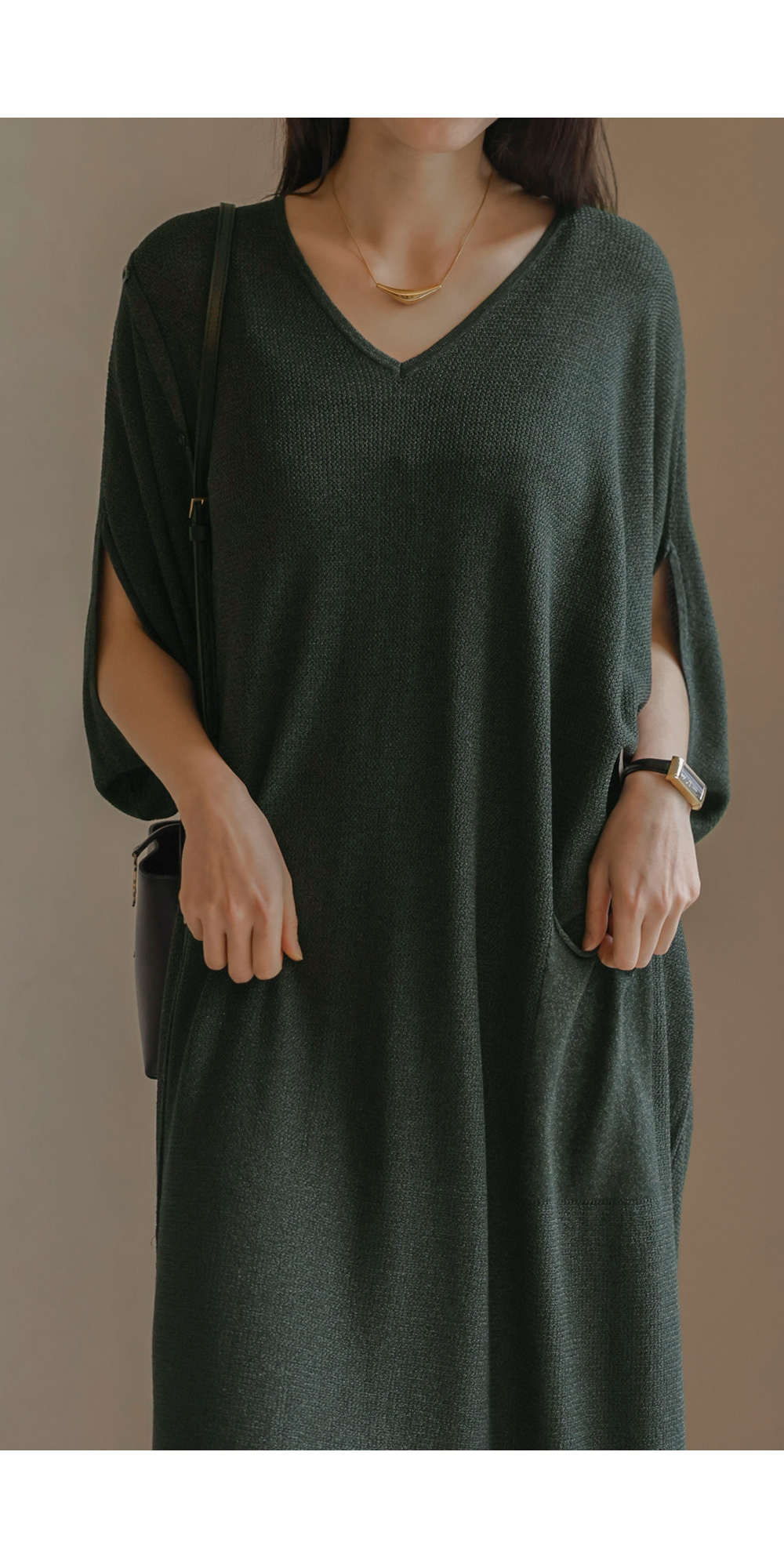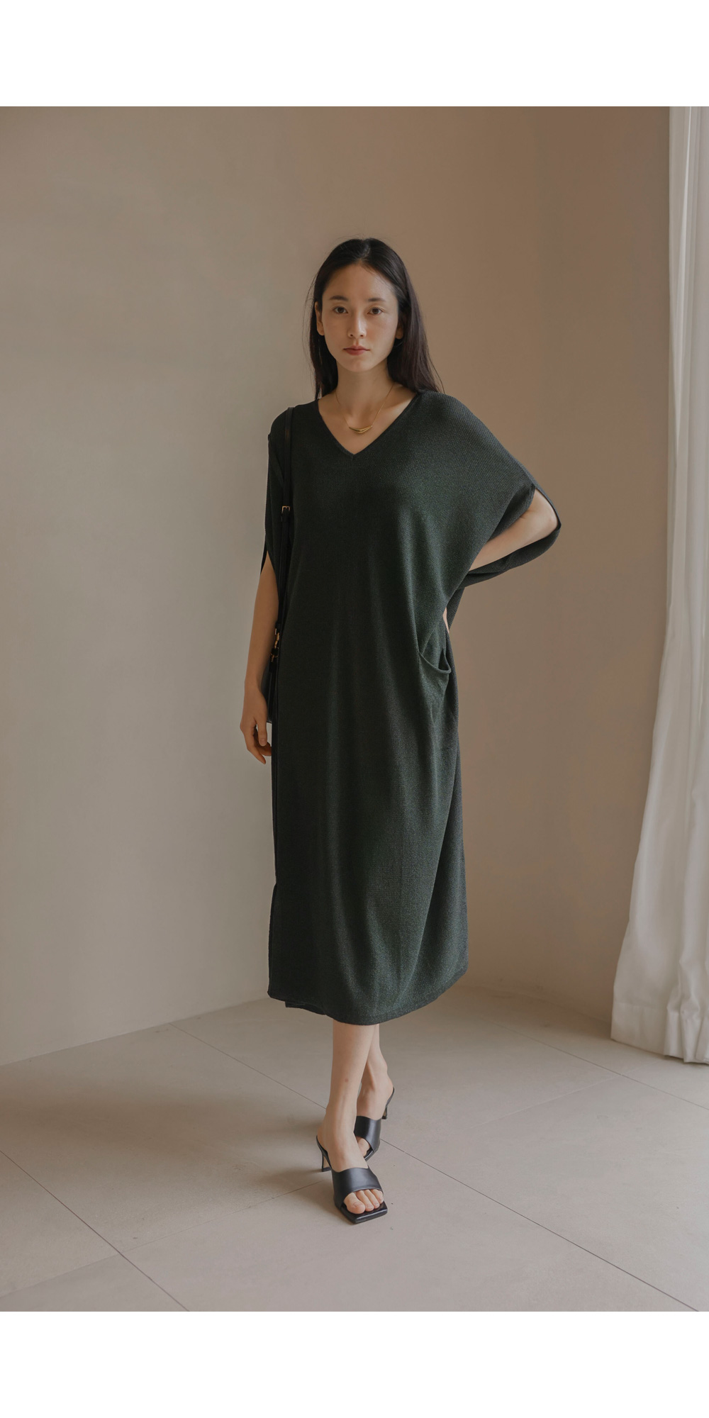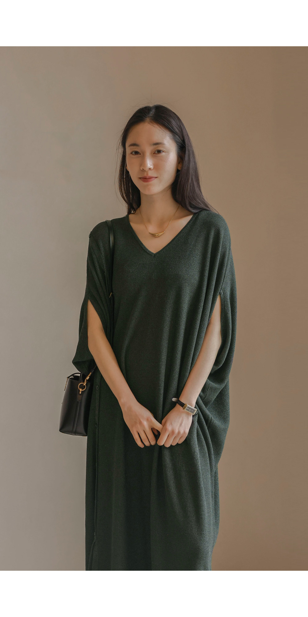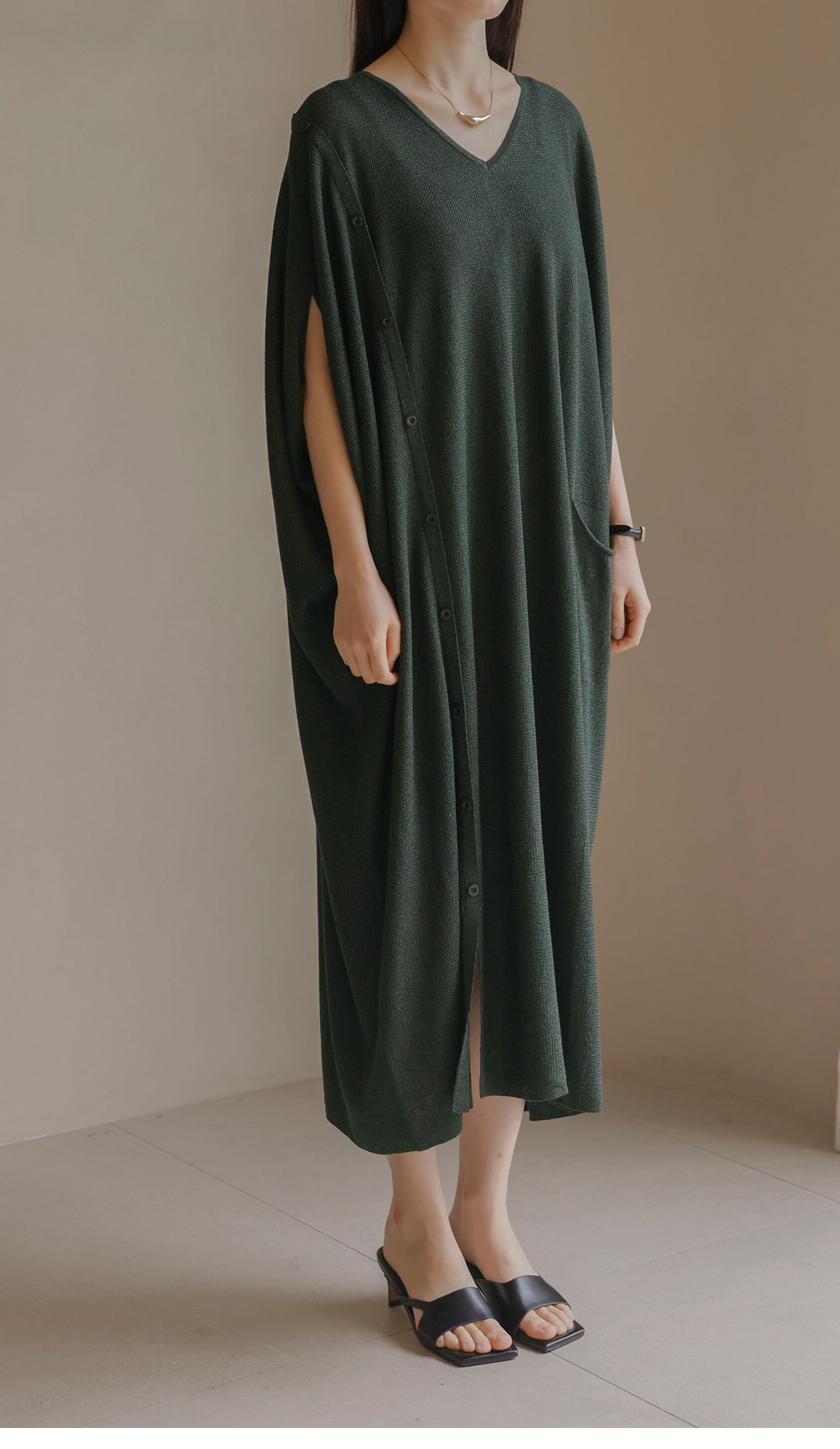 한 장만 툭 걸쳐도 드레시한 분위기가 완성되는 니트 원피스예요. 여유로운 사이즈 덕분에 라인이 드러날까 걱정하셨던 분들도 안심하고 즐기실 수 있구요.