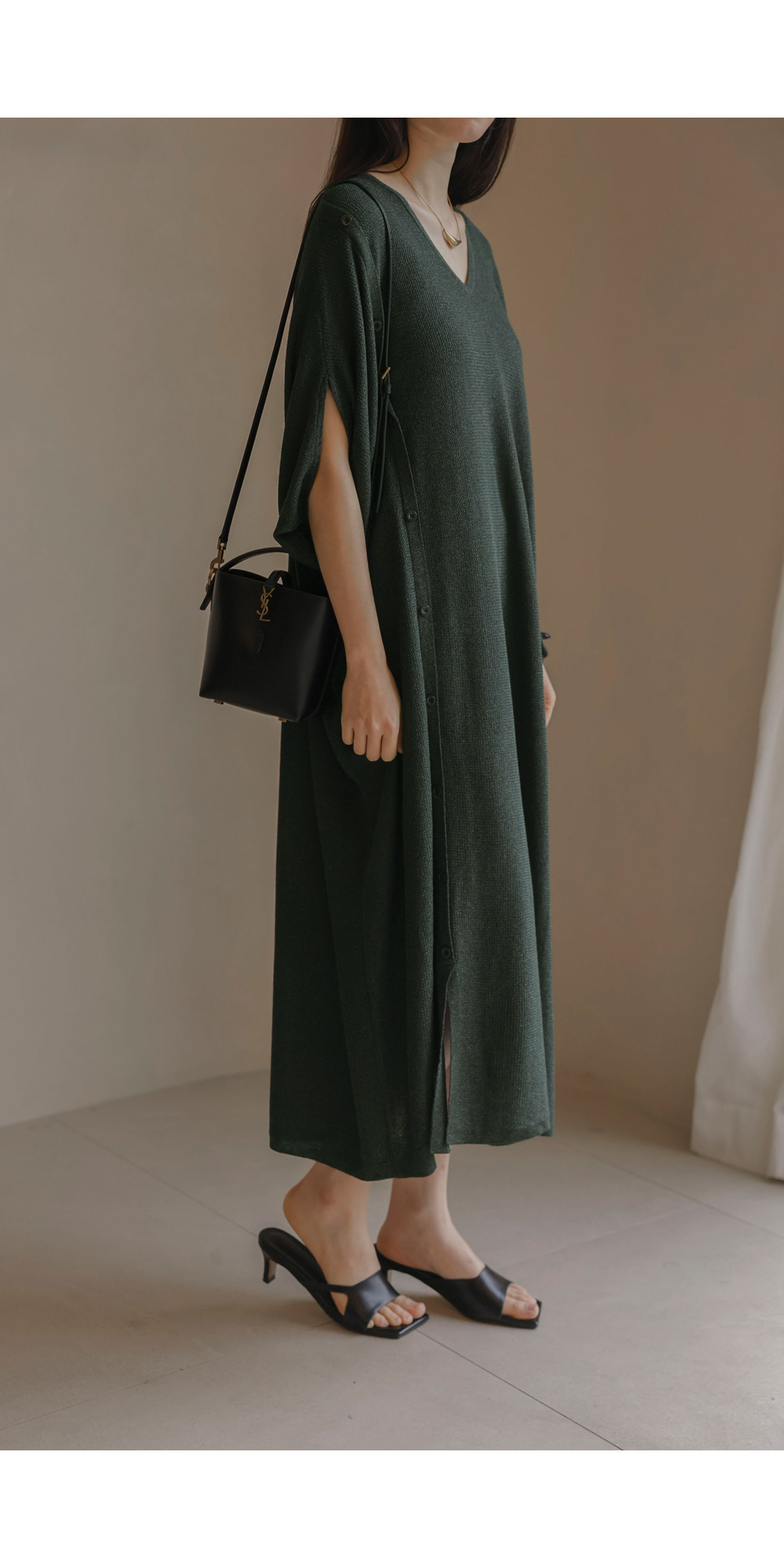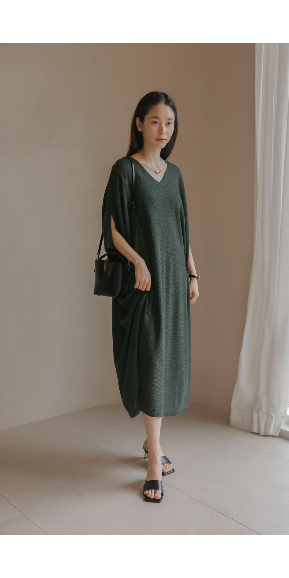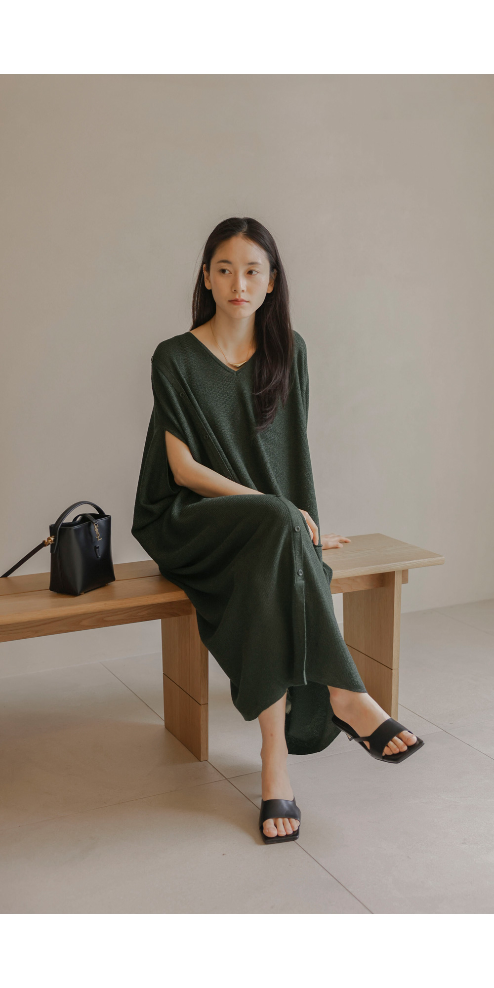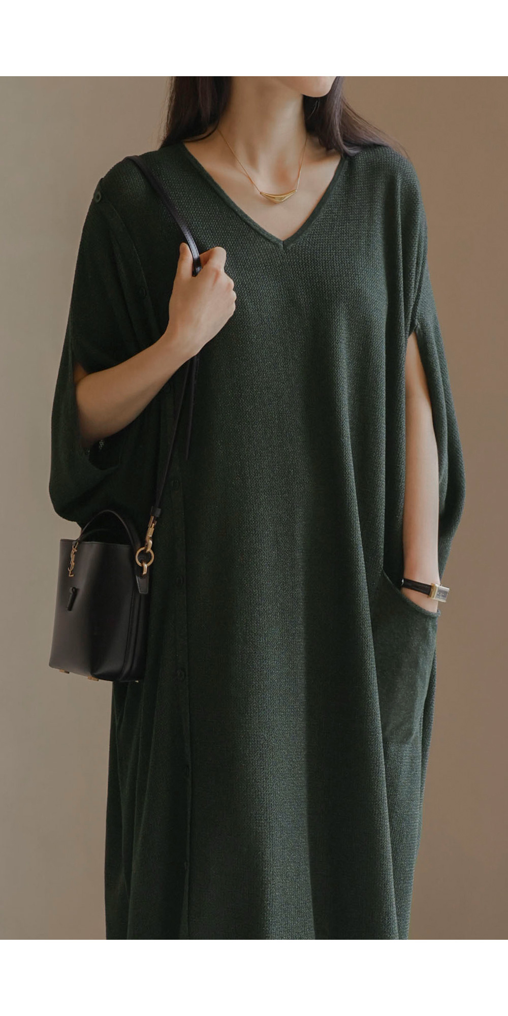 한 장만 툭 걸쳐도 드레시한 분위기가 완성되는 니트 원피스예요. 여유로운 사이즈 덕분에 라인이 드러날까 걱정하셨던 분들도 안심하고 즐기실 수 있구요.