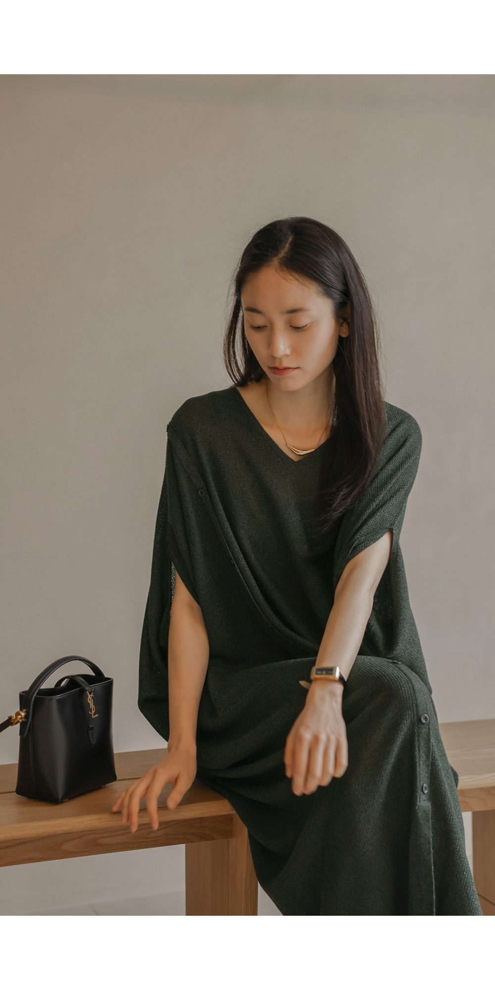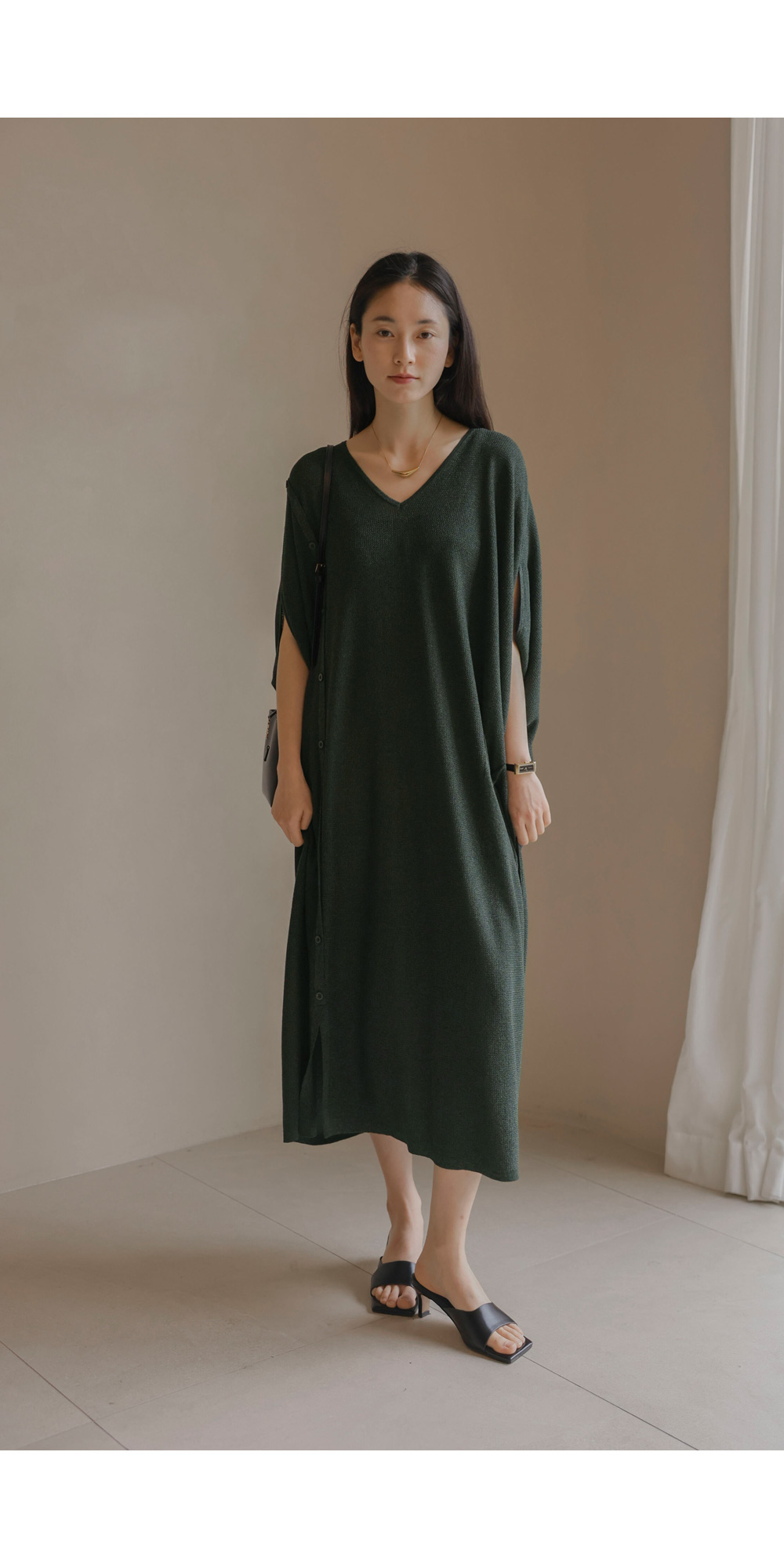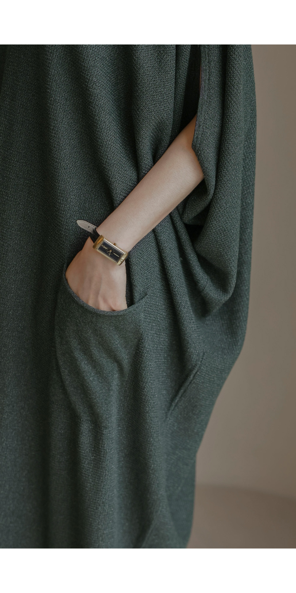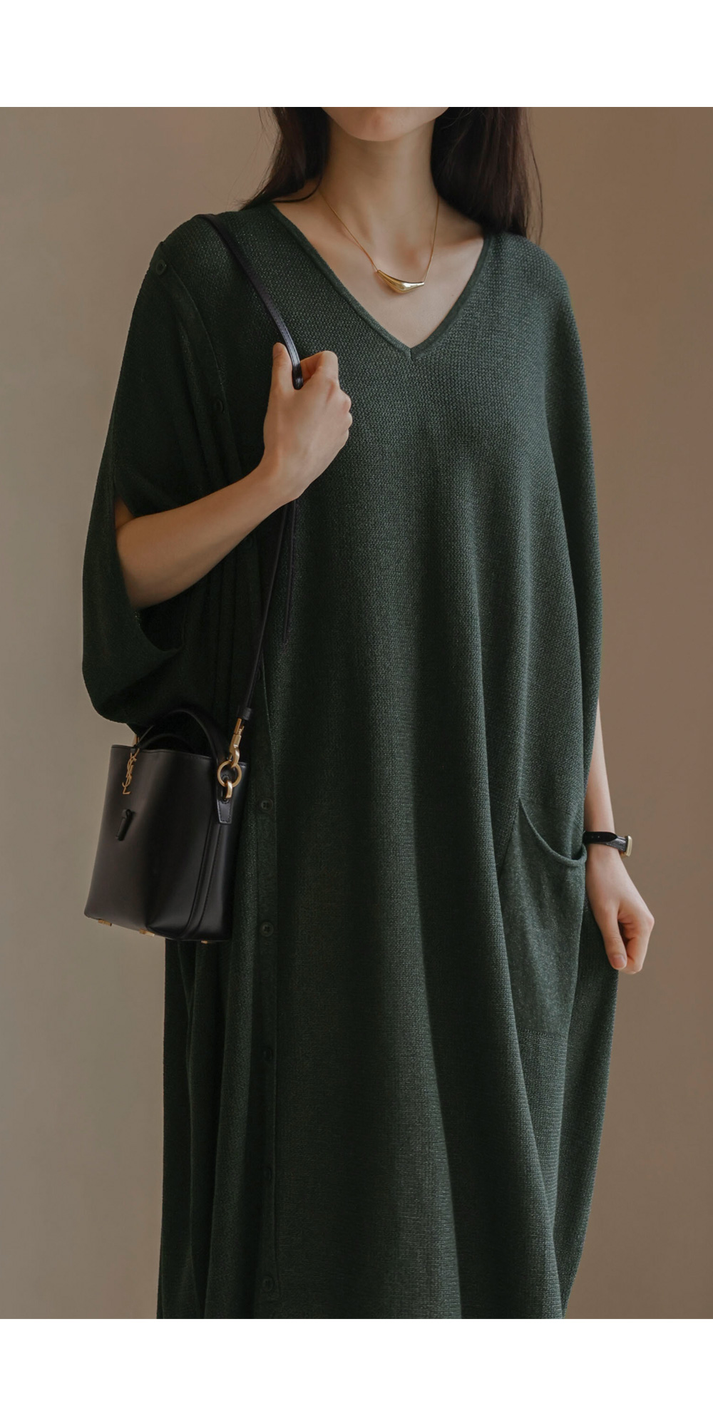 한 장만 툭 걸쳐도 드레시한 분위기가 완성되는 니트 원피스예요. 여유로운 사이즈 덕분에 라인이 드러날까 걱정하셨던 분들도 안심하고 즐기실 수 있구요.
