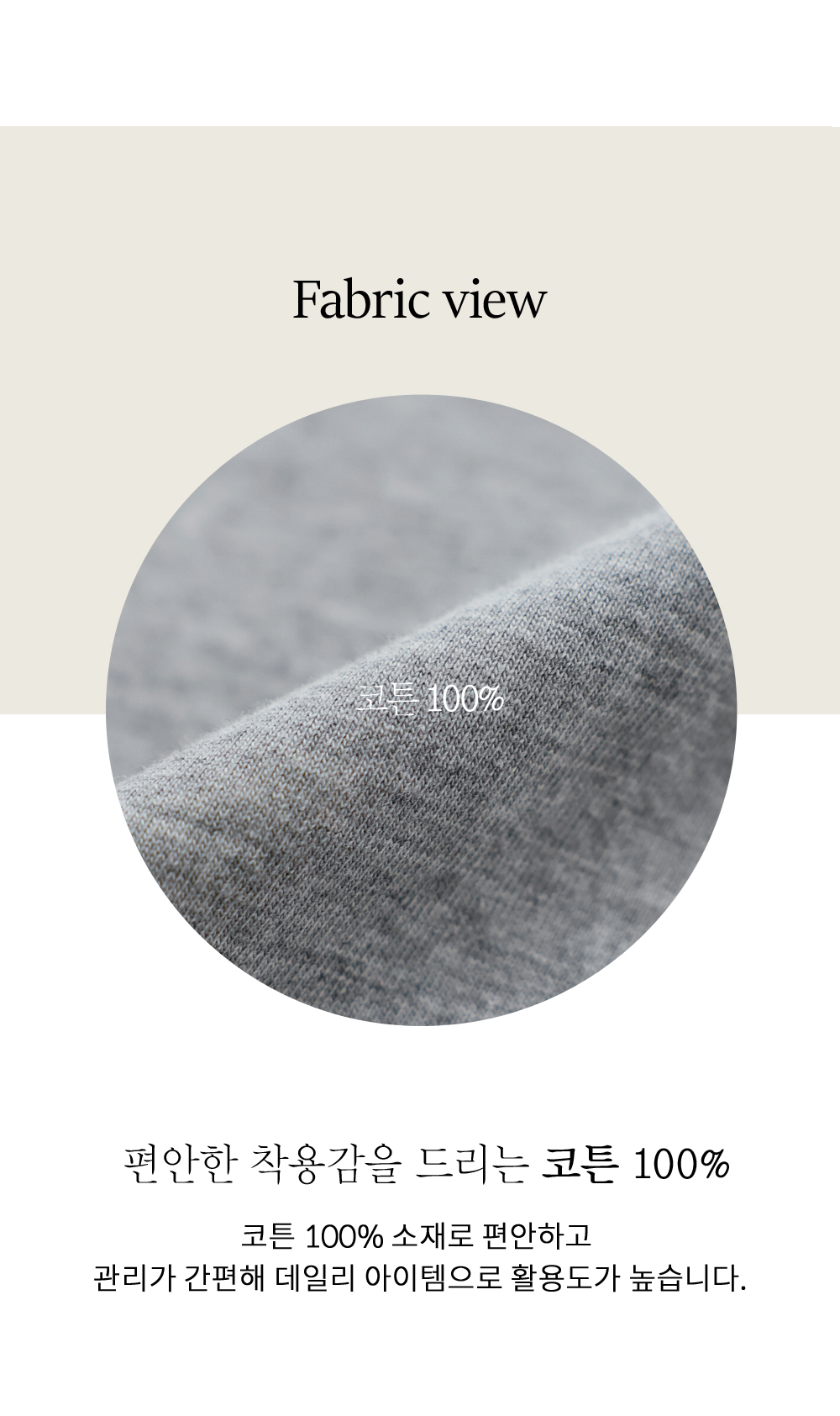 불순물 없이 깨끗하고 순수한 코튼 100% 소재를 사용했어요. 천연 섬유 특유의 부드러운 터치감이 예민한 피부에도 편안하게 안착되며, 얇은 두께감임에도 불구하고 조직감이 촘촘하고 탄탄하여 세탁과 착용이 반복되어도 핏이 무너지지 않아요. 흡습성이 좋아 땀 배출을 돕고 피부를 늘 보송보송하게 유지해 주는 고퀄리티 면 소재랍니다.