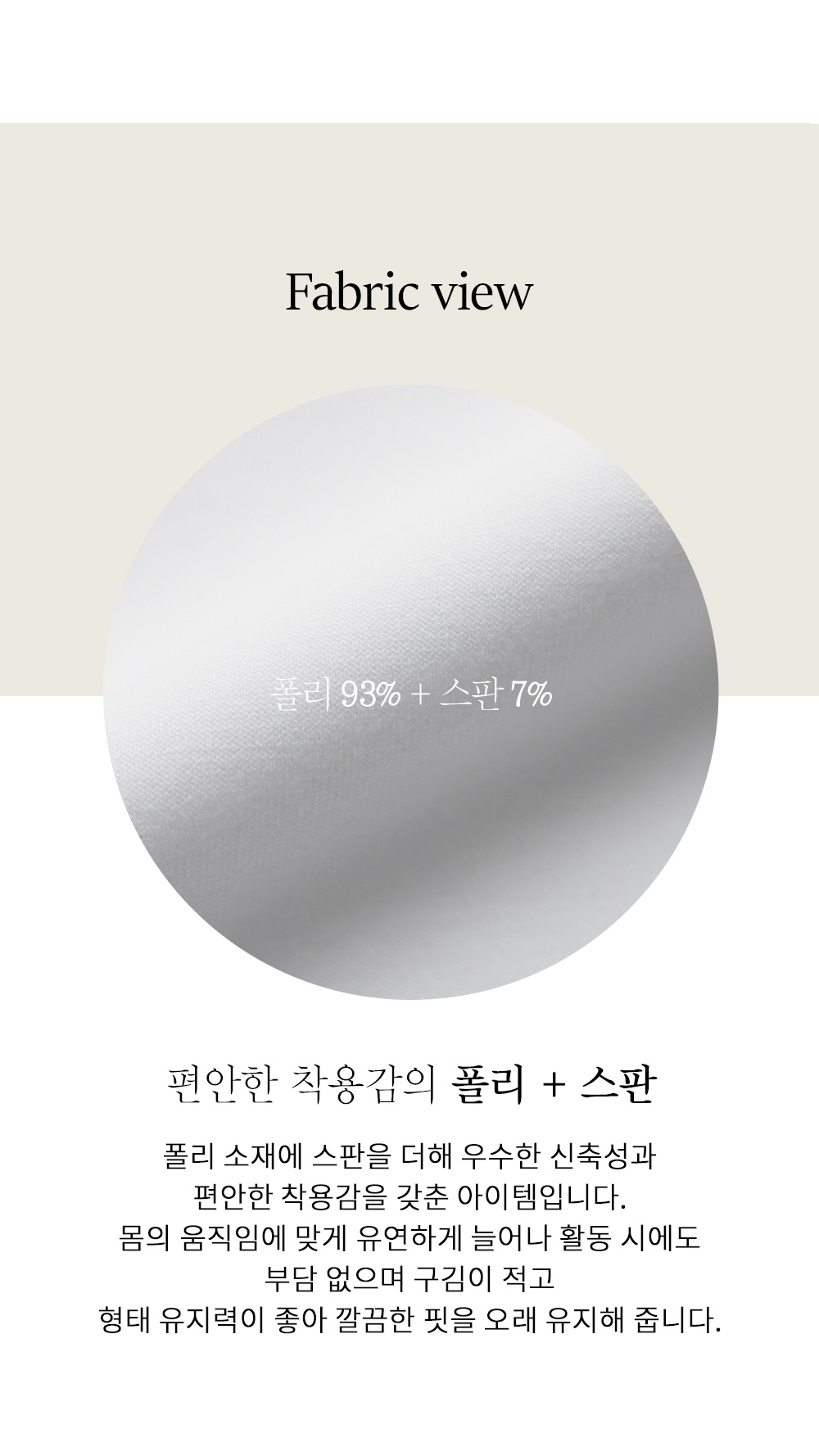 폴리와 스판을 적절히 혼방하여 탄성력이 매우 뛰어나며 피부에 닿는 느낌이 매끈하고 부드럽습니다. 복원력이 우수한 쫀쫀한 소재 특성상 잦은 착용에도 형태 변형이 적고 구김이 잘 가지 않아 관리가 매우 편리합니다. 얇지만 탄탄한 조직감으로 제작되어 사계절 내내 이너 또는 단독으로 활용하기 좋은 실용적인 소재입니다.