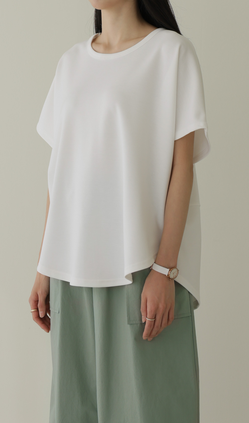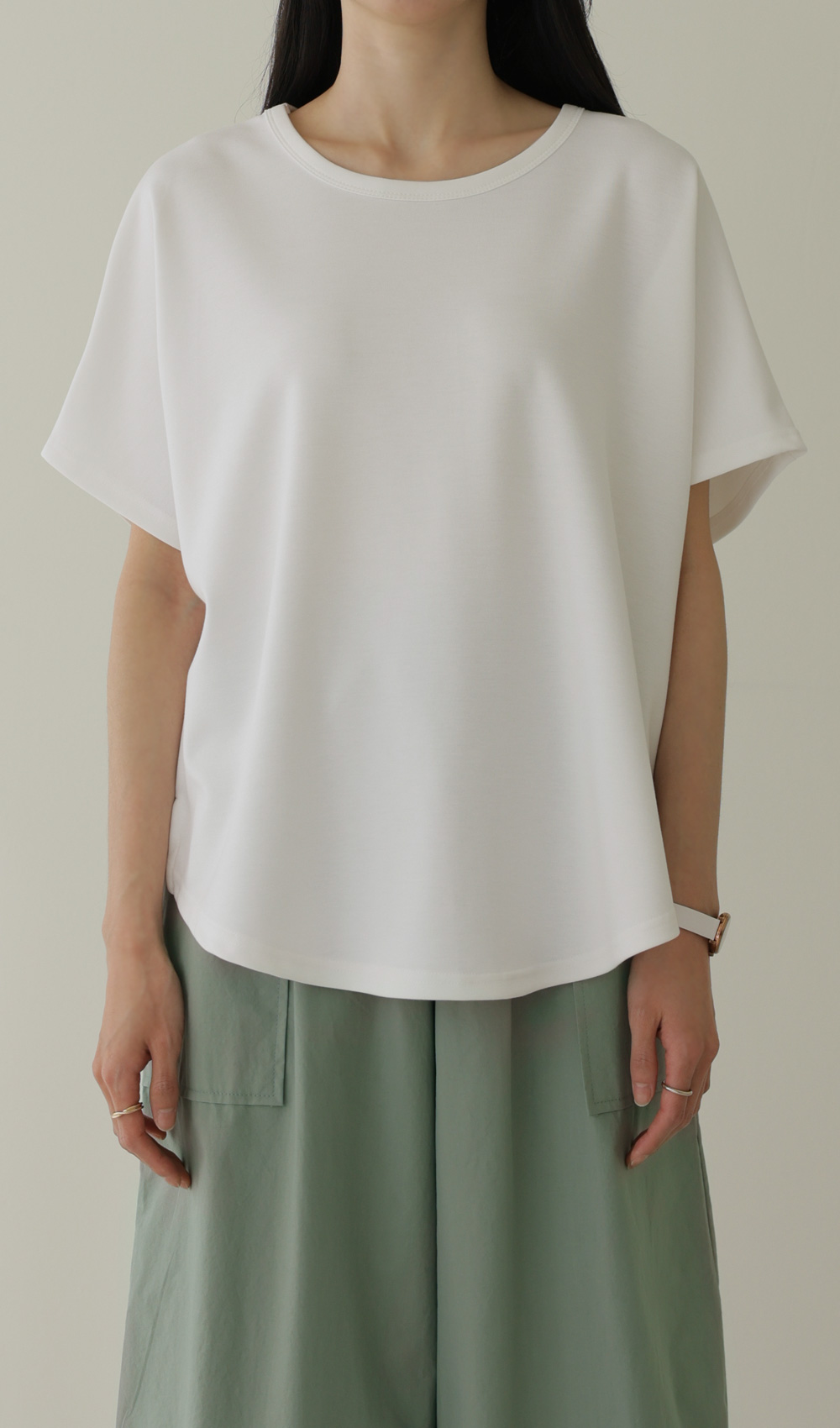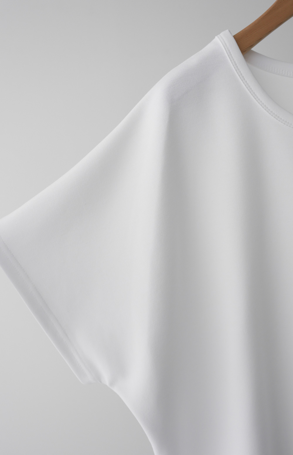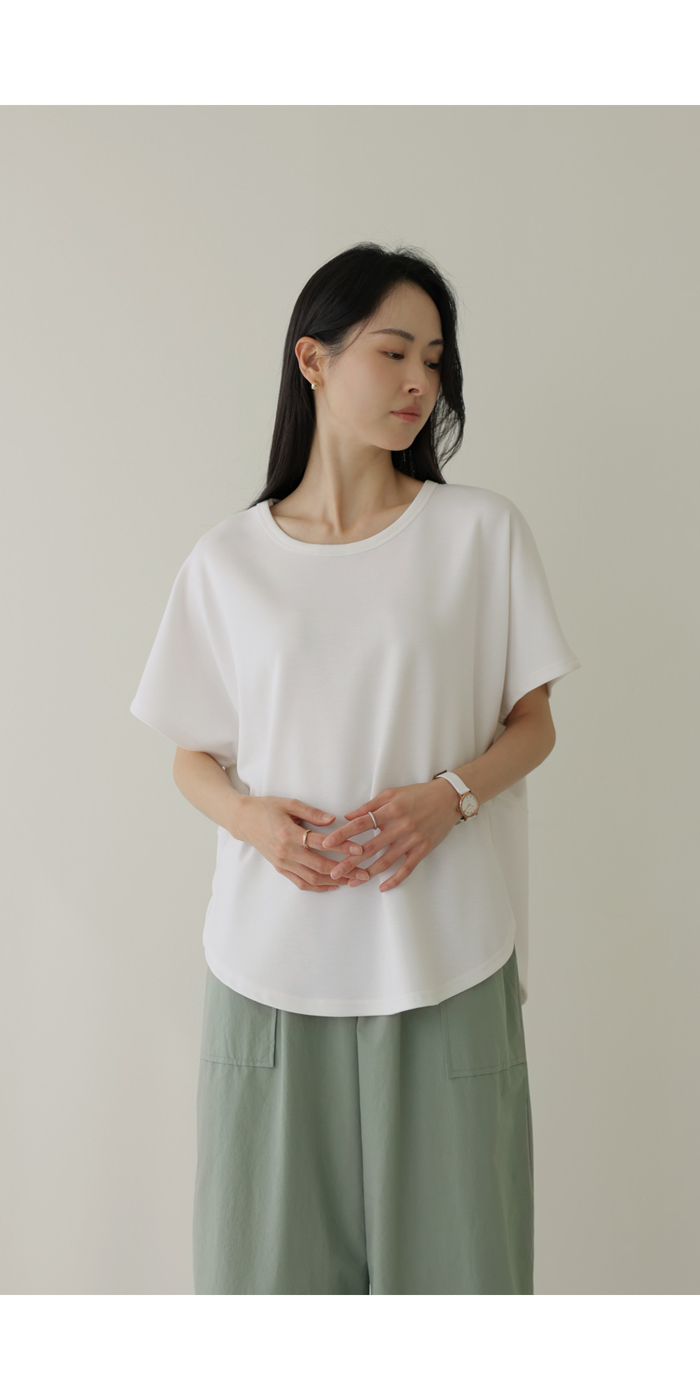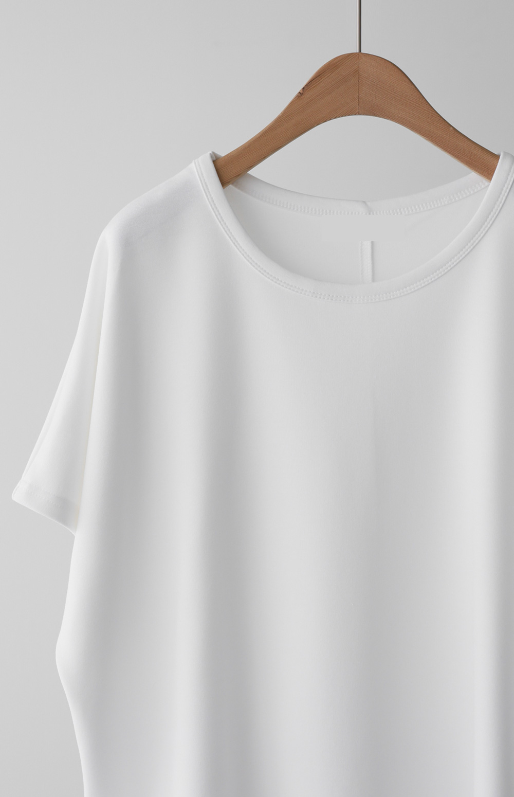 이 티셔츠는 정말 '기본의 품격'을 보여주는 아이템이에요. 어깨선이 없어서 그런지 어깨가 정말 좁아 보이고, 쫀쫀하게 늘어나는 소재 덕분에 하루 종일 입고 있어도 피로감이 전혀 없더라고요.
