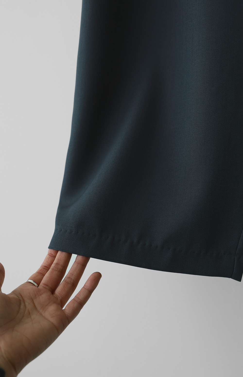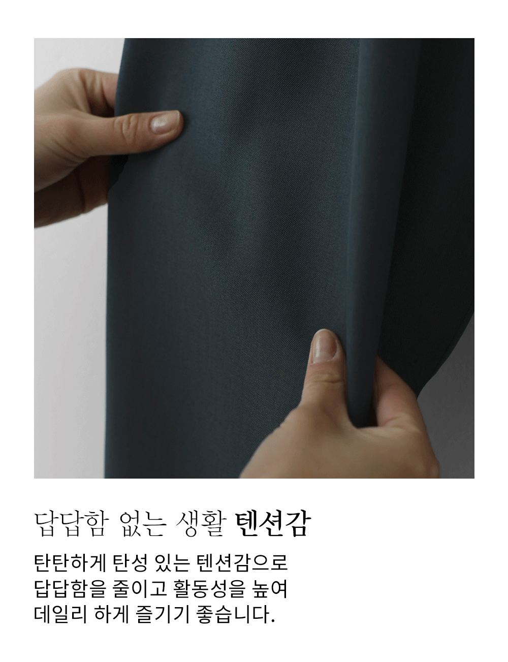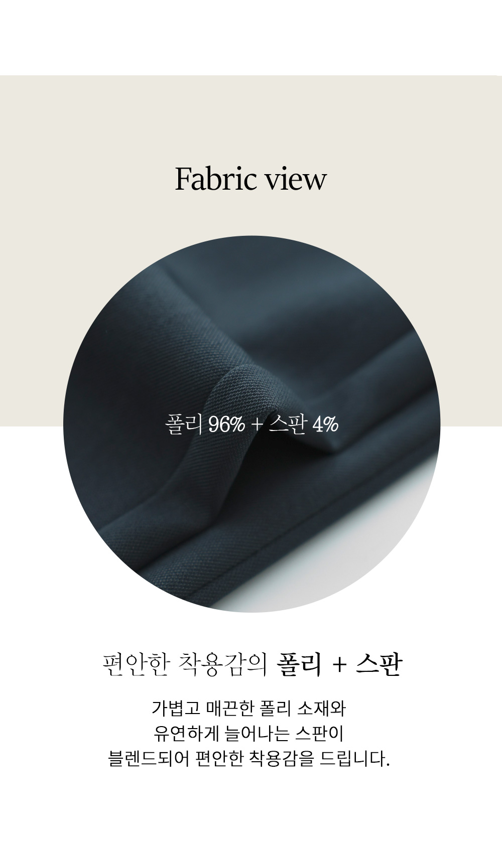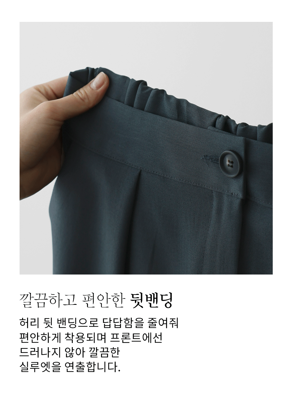 폴리에 스판이 최적의 비율로 혼방되어, 구김 걱정은 덜어내고 활동성은 극대화했어요. 손으로 만졌을 때 느껴지는 매끈하고 시원한 촉감이 일품이며, 원단 자체가 가진 적당한 무게감이 아래로 툭 떨어지는 힘을 실어주어 체형의 굴곡을 드러내지 않고 매끄러운 라인을 만들어줍니다. ![]() 밴딩 가이드 보러가기→ ![]() MD가 답하는 안심 Q&A