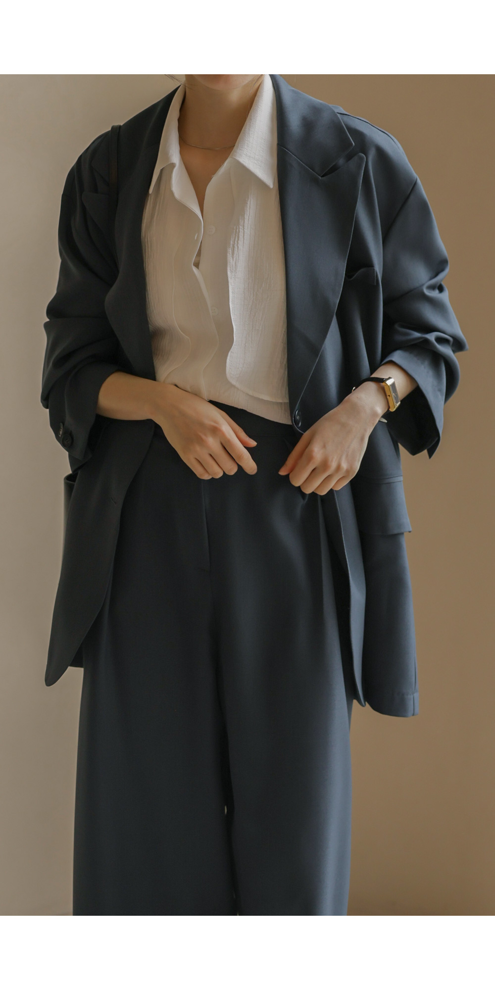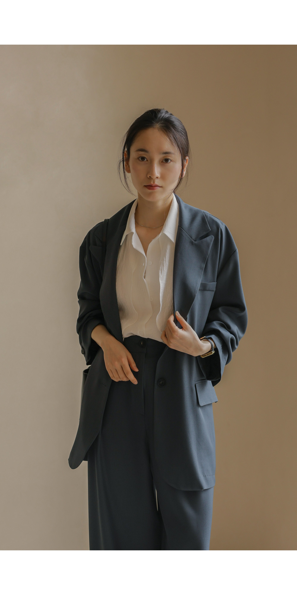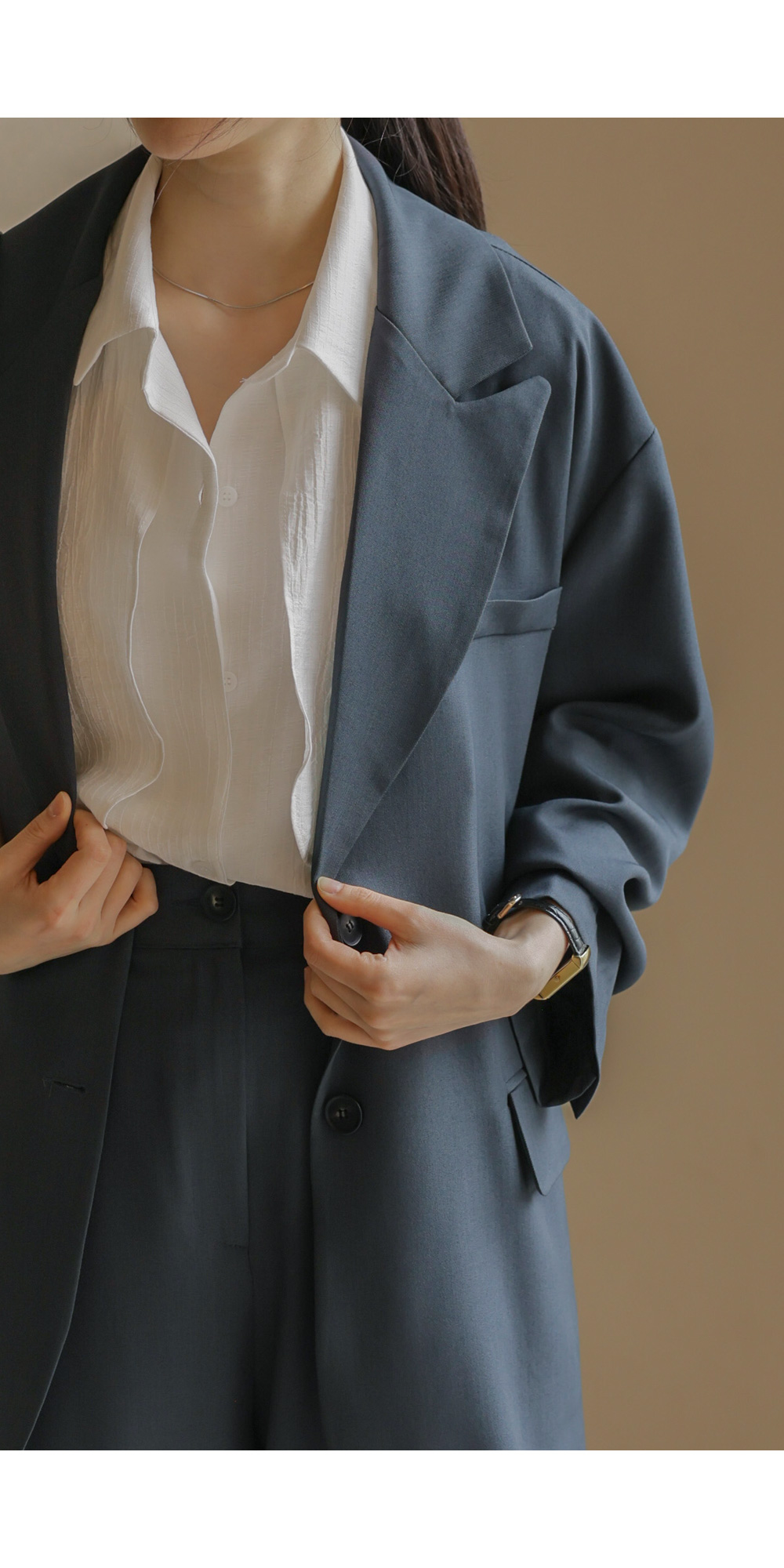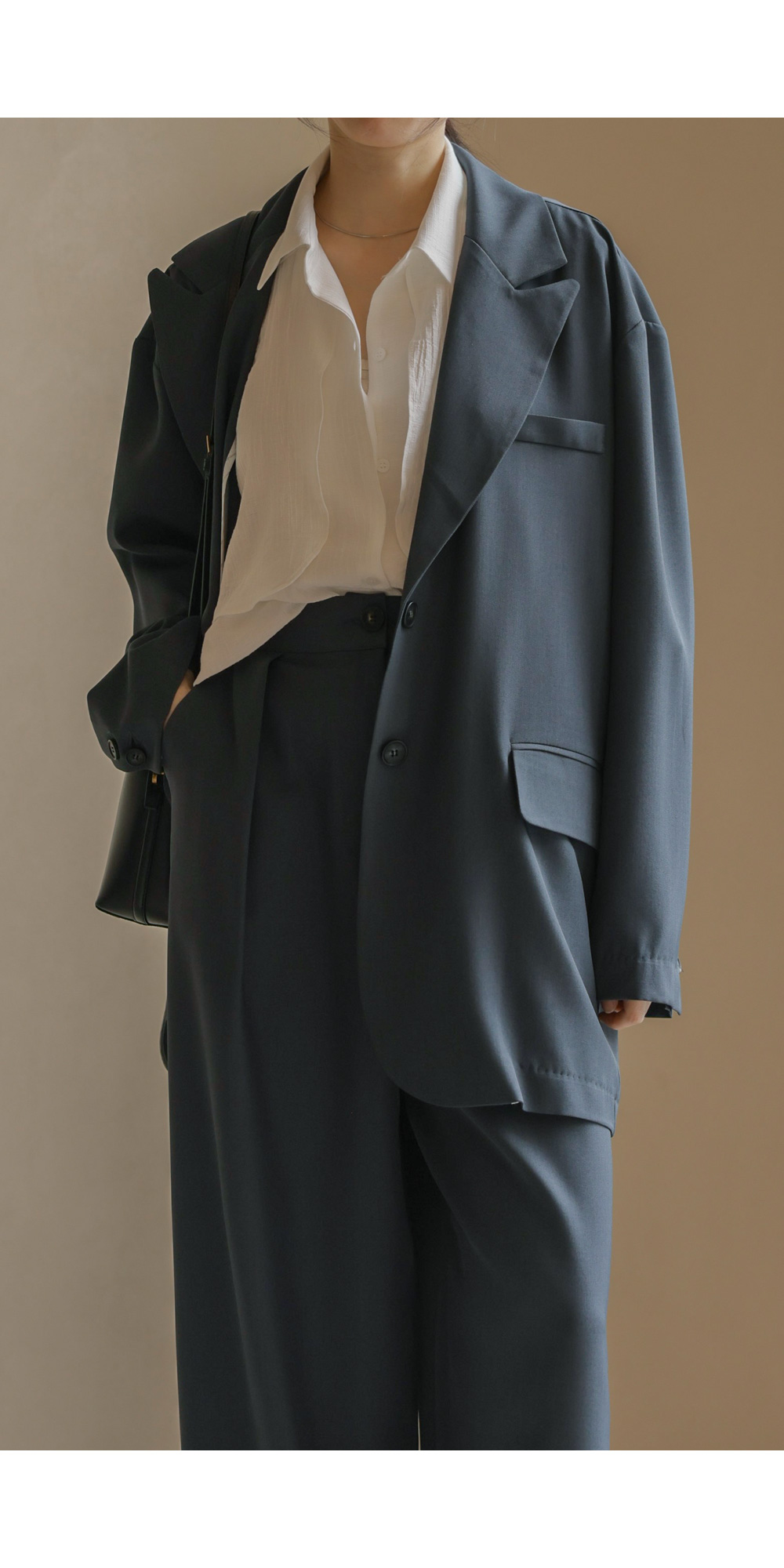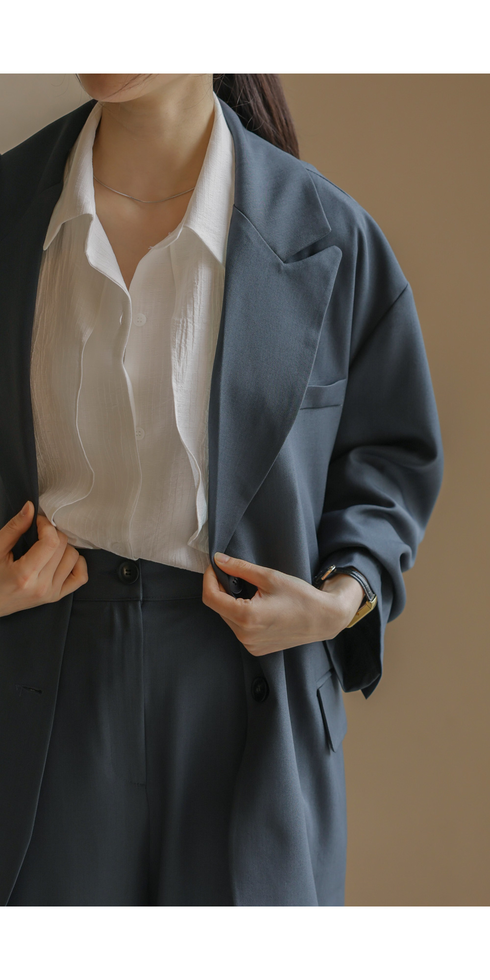 군더더기 없이 깔끔한 실루엣으로 격식 있는 자리는 물론, 일상에서도 세련미를 잃지 않게 해줄 자켓과 팬츠 구성의 셋업 아이템이에요.