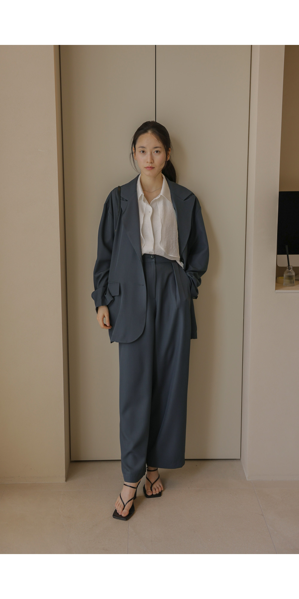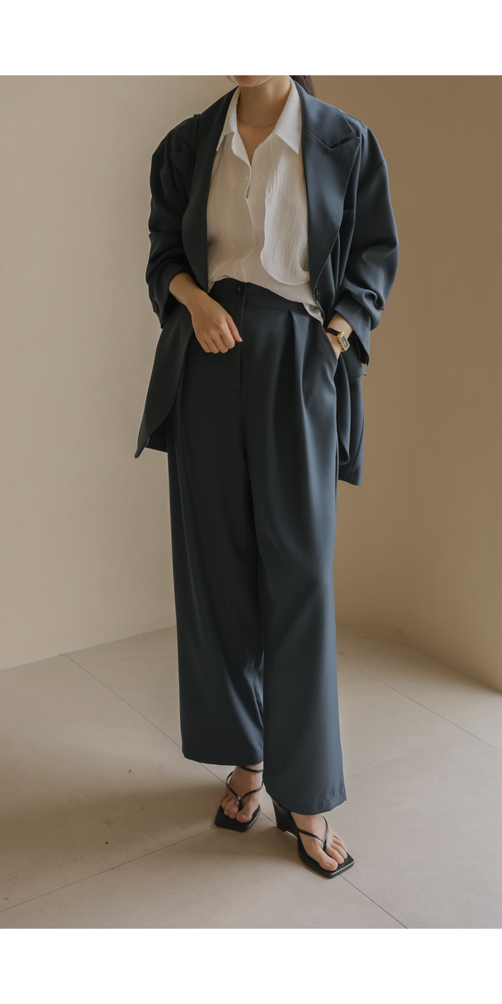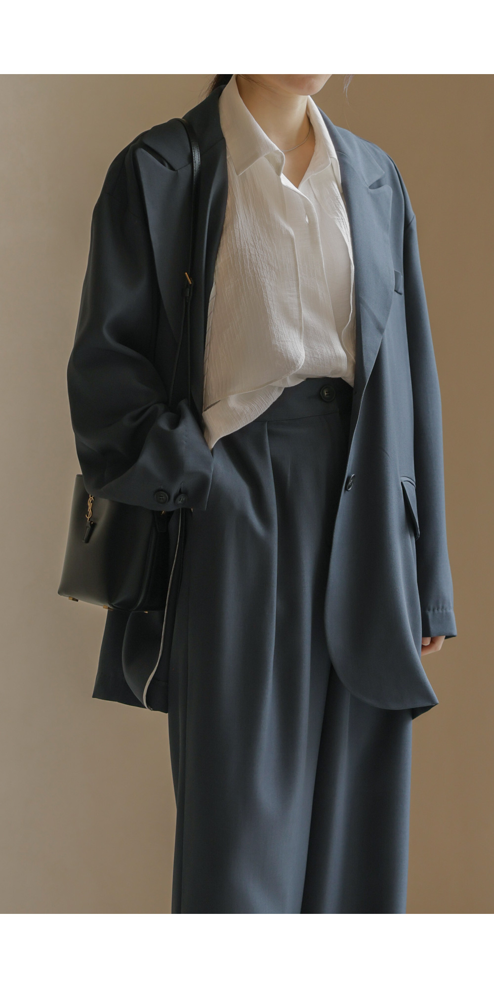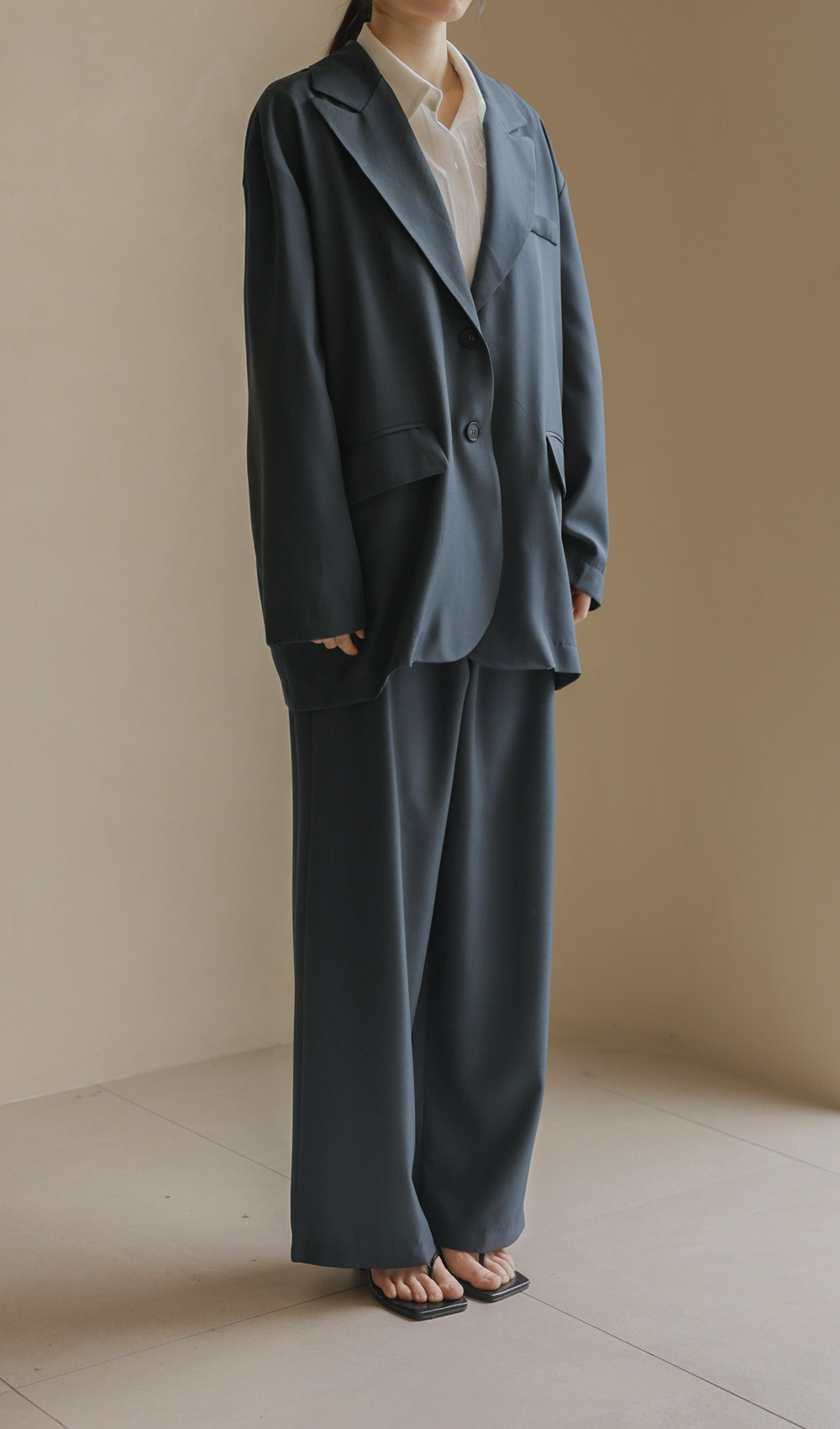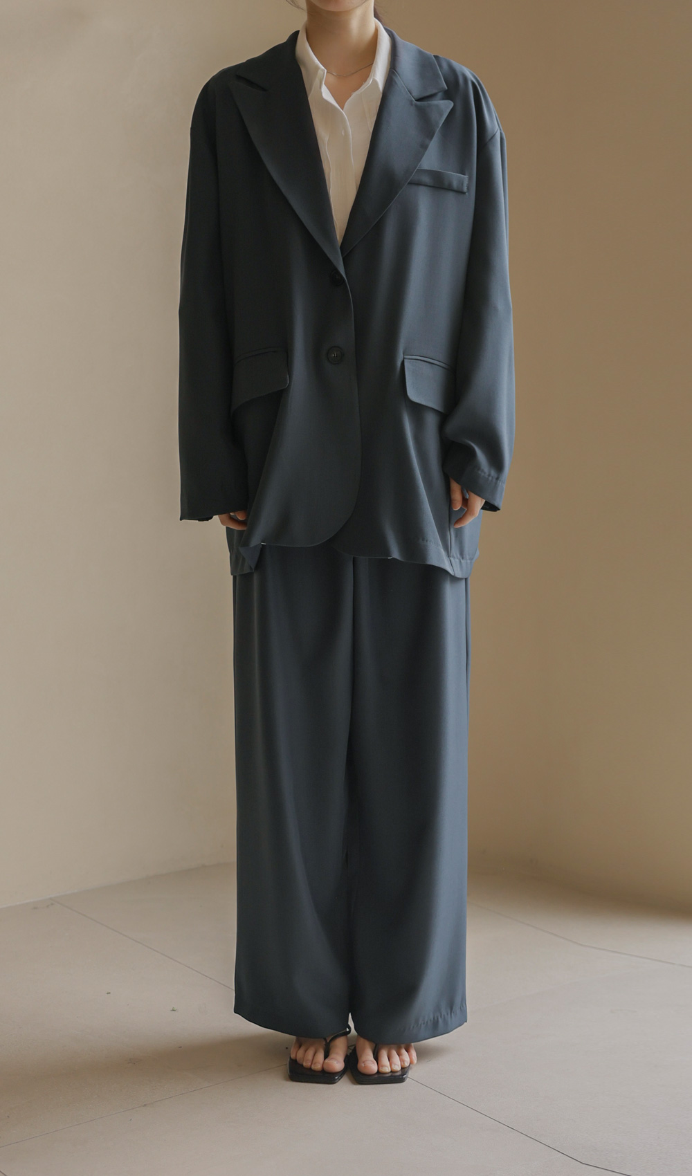 군더더기 없이 깔끔한 실루엣으로 격식 있는 자리는 물론, 일상에서도 세련미를 잃지 않게 해줄 자켓과 팬츠 구성의 셋업 아이템이에요.