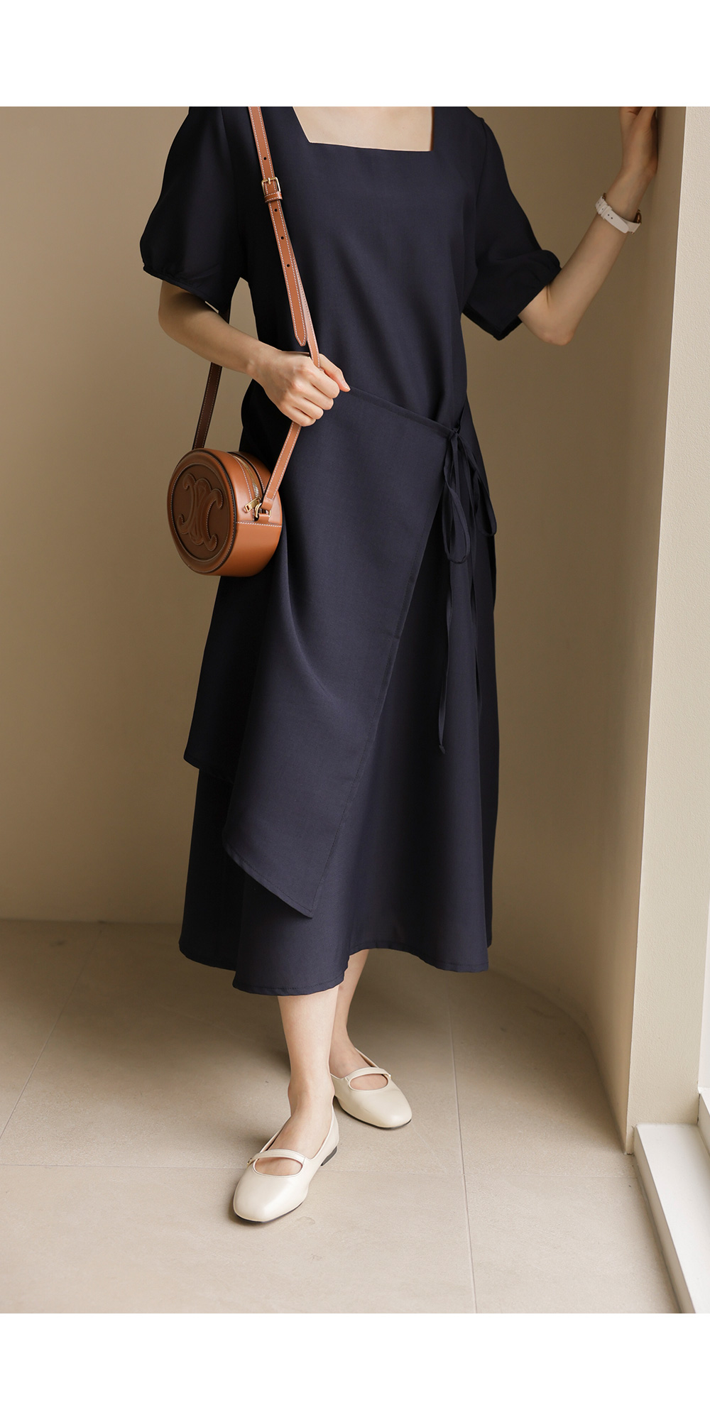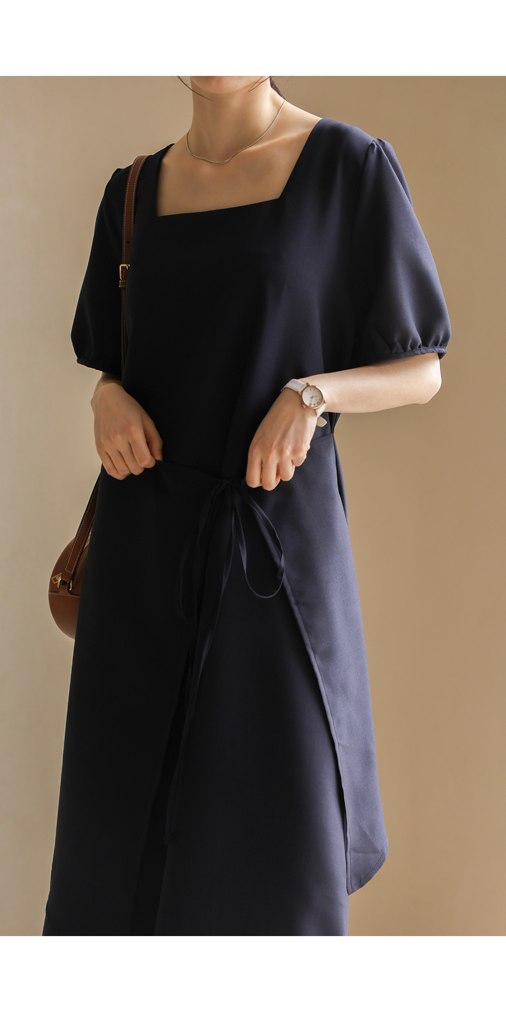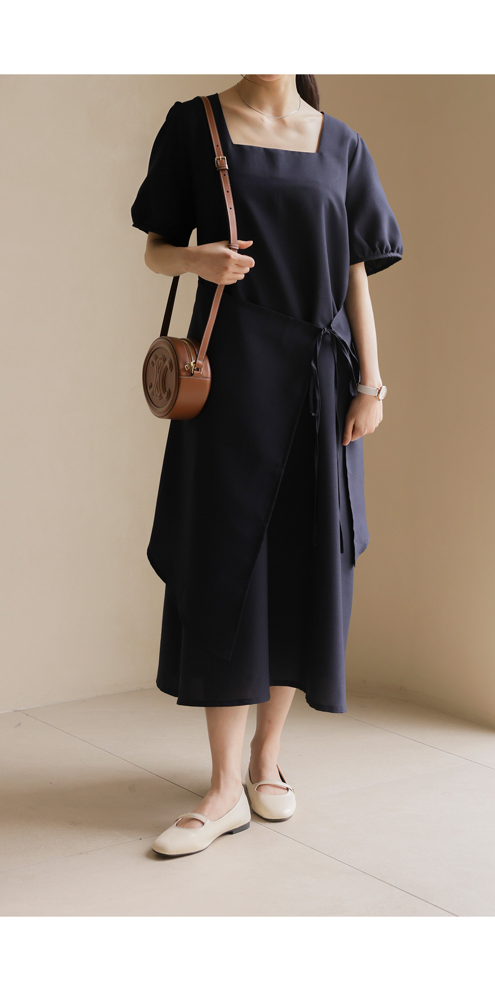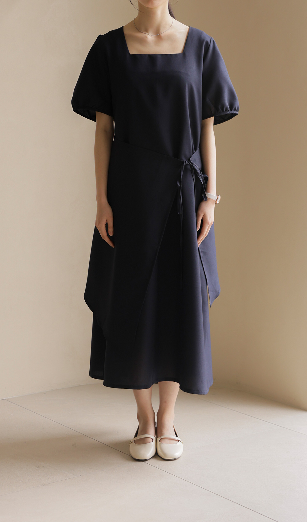 입는 순간 드라마틱한 실루엣의 변화를 경험하실 수 있는 특별한 원피스 소개해요. 시원하게 트인 스퀘어 넥 라인이 쇄골을 예쁘게 드러내 주어 얼굴이 한층 작아 보이고, 랩 스타일과 연결된 스트랩이 허리선을 안정감 있게 잡아주어 체형 보정 효과가 탁월하답니다.