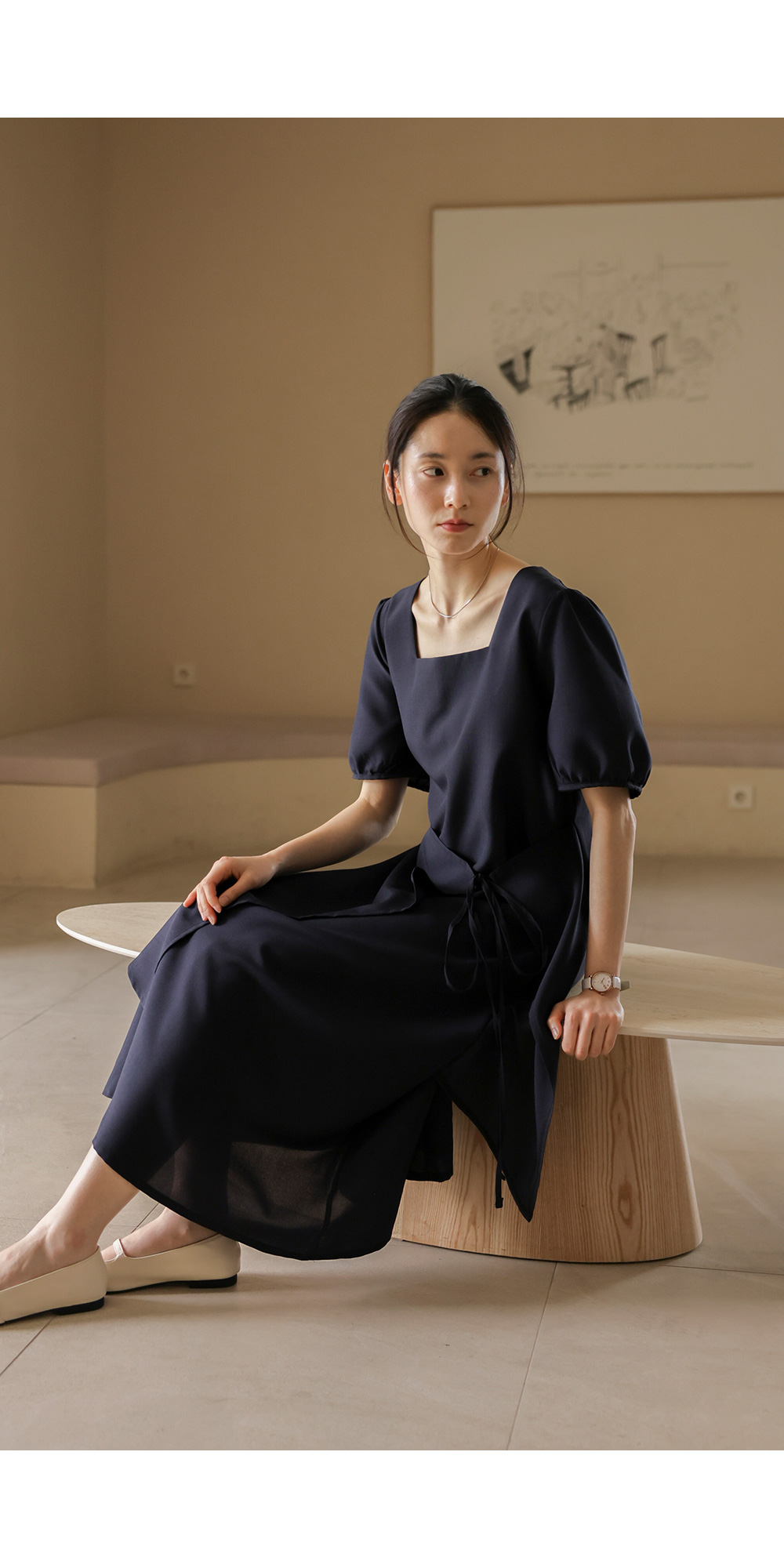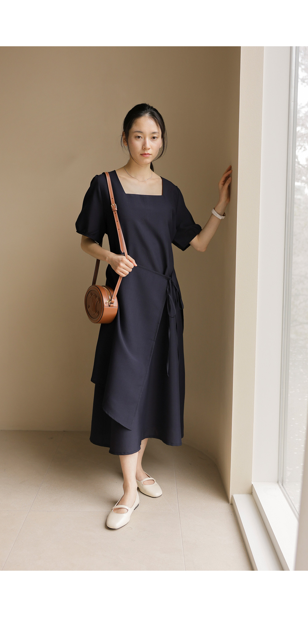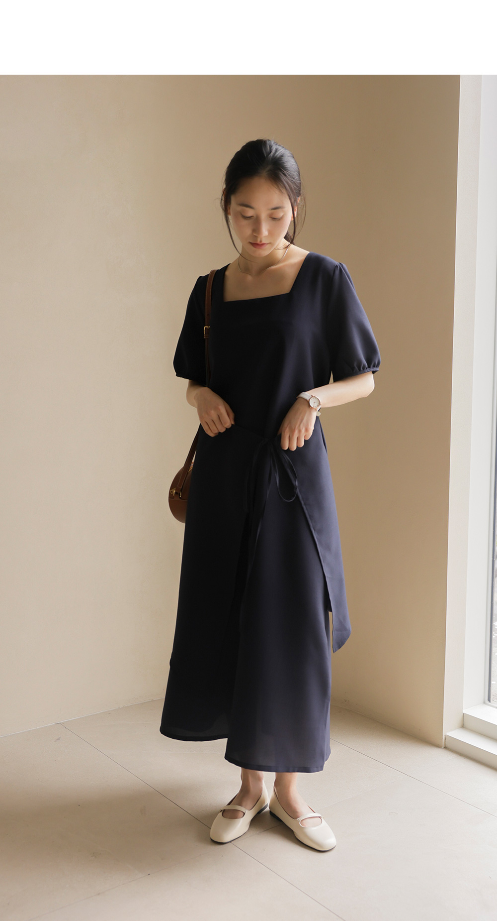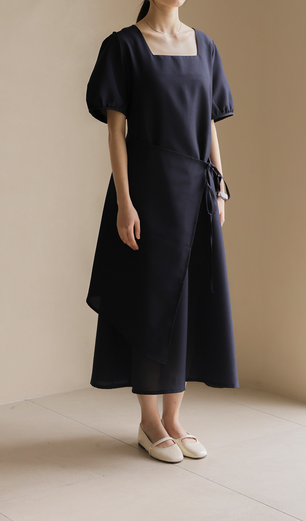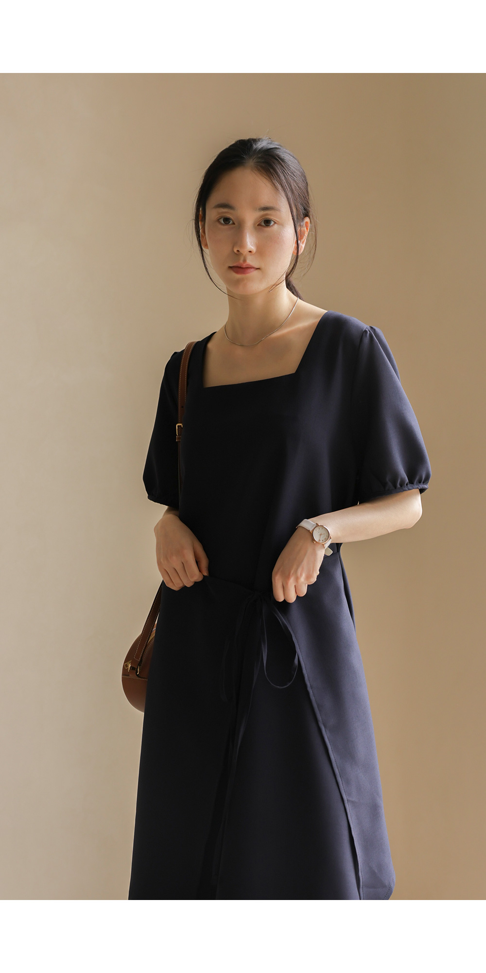 입는 순간 드라마틱한 실루엣의 변화를 경험하실 수 있는 특별한 원피스 소개해요. 시원하게 트인 스퀘어 넥 라인이 쇄골을 예쁘게 드러내 주어 얼굴이 한층 작아 보이고, 랩 스타일과 연결된 스트랩이 허리선을 안정감 있게 잡아주어 체형 보정 효과가 탁월하답니다.