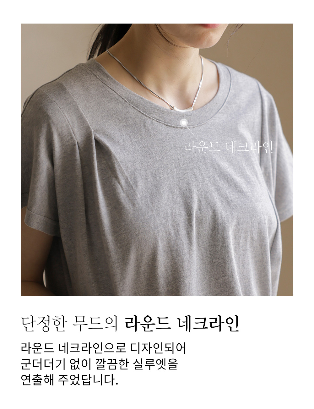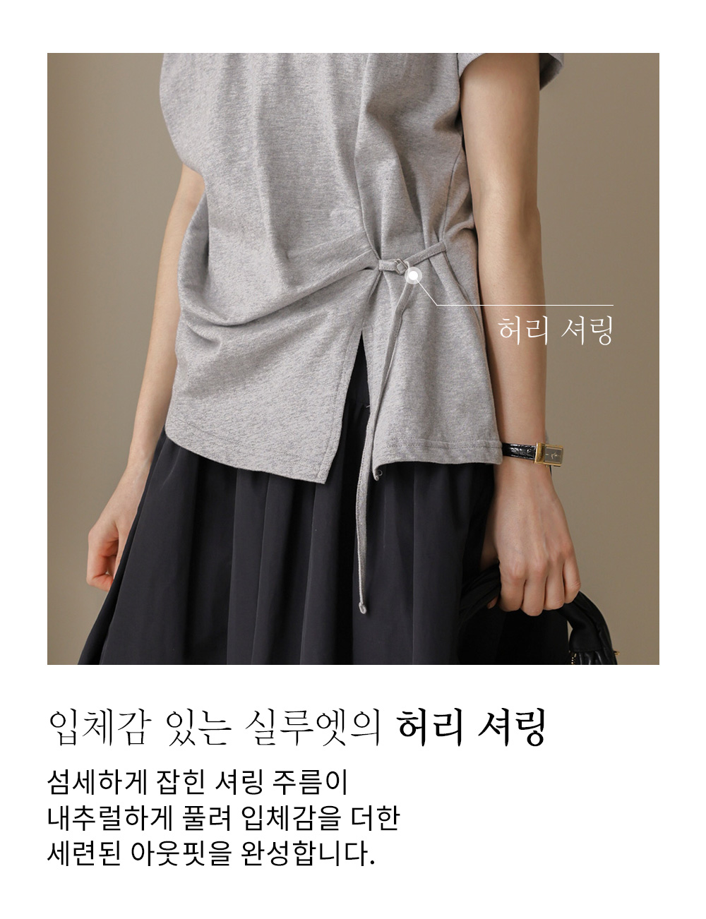 티셔츠 하나만으로도 충분히 꾸민 듯한 분위기를 낼 수 있는 감각적인 아이템이에요. 차분하고 이지적인 분위기의 그레이와 어디에나 매치하기 좋고 슬림해 보이는 블랙 두 가지 컬러로 구성되어 있구요.