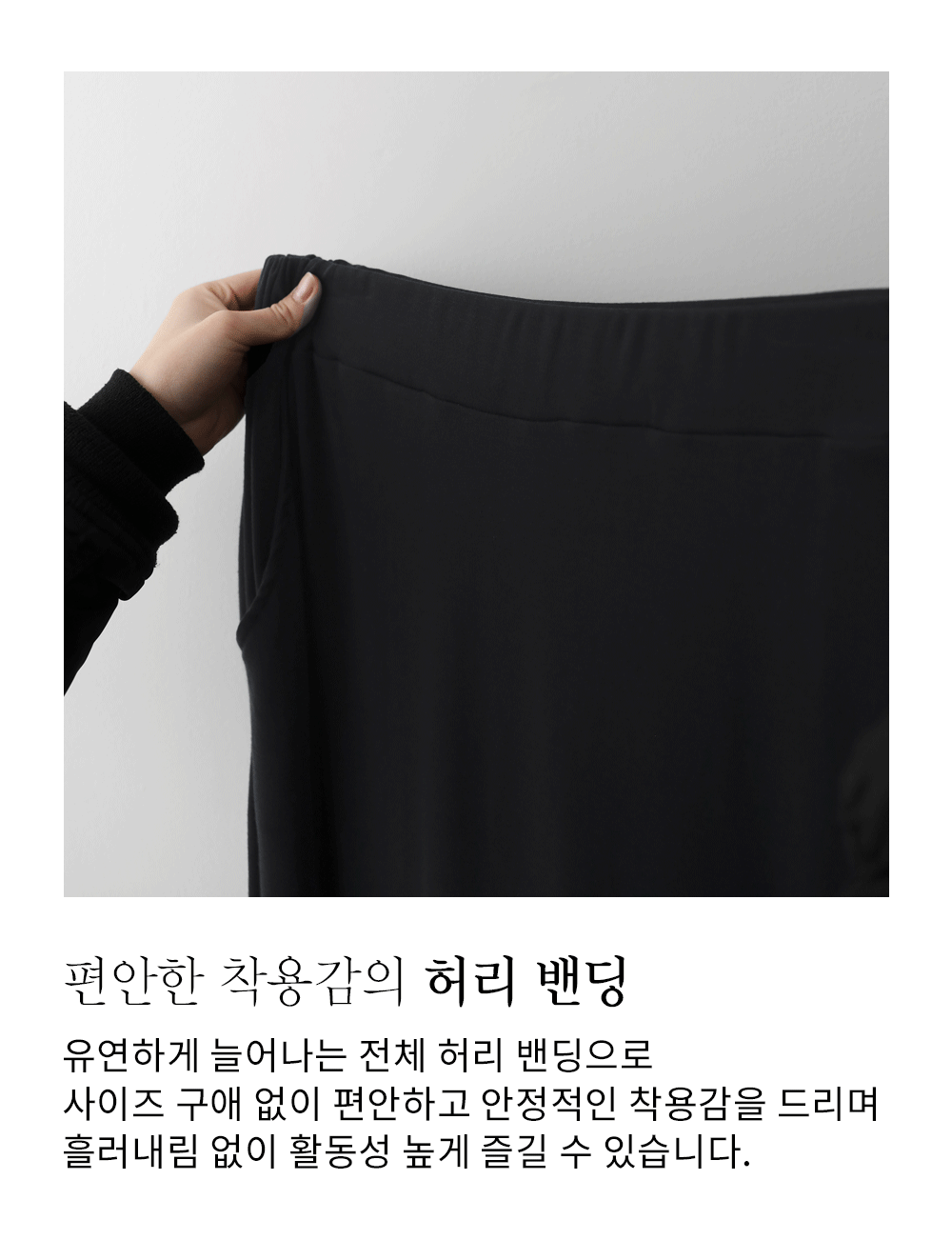 레이온 특유의 찰랑거리고 촉촉한 촉감에 폴리에스터의 복원력을 더해 제작했구요. 여기에 스판을 혼방하여 사방으로 쫀쫀하게 늘어나는 텐션감이 활동성을 극대화해 준답니다. 안감이 없어도 원단 자체의 톡톡한 밀도감 덕분에 몸매 라인이 울퉁불퉁하게 드러나지 않으며, 부드럽게 몸을 감싸주어 땀이 나도 쾌적함이 오래 유지되는 고품질 소재예요. ![]() 밴딩 가이드 보러가기→ ![]() MD가 답하는 안심 Q&A