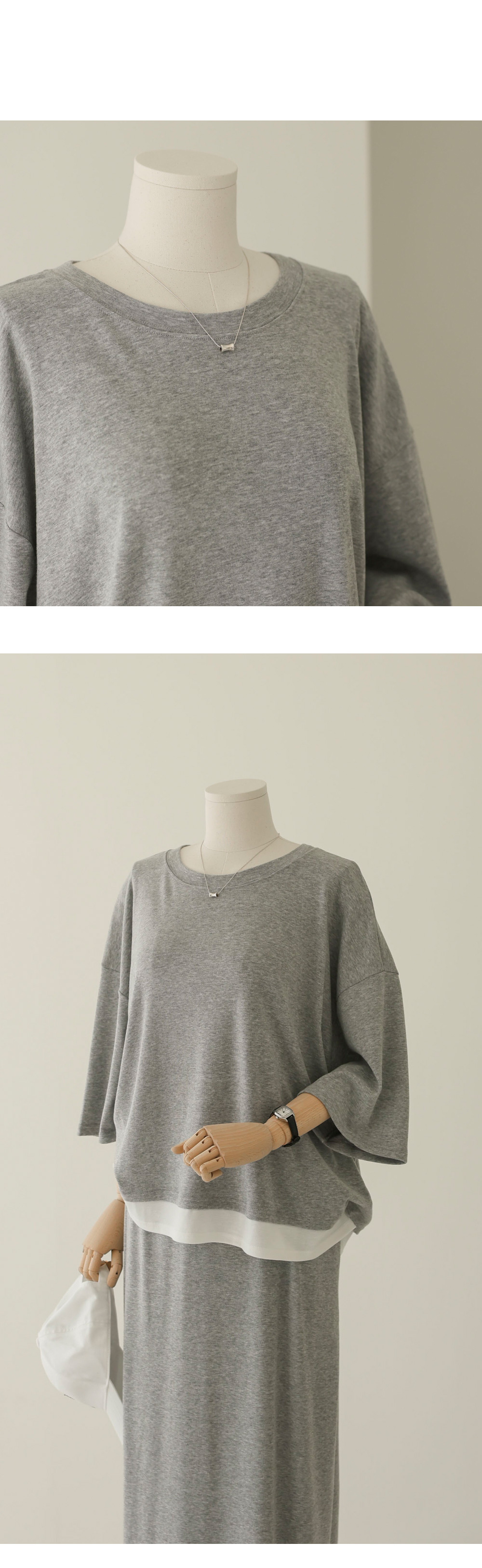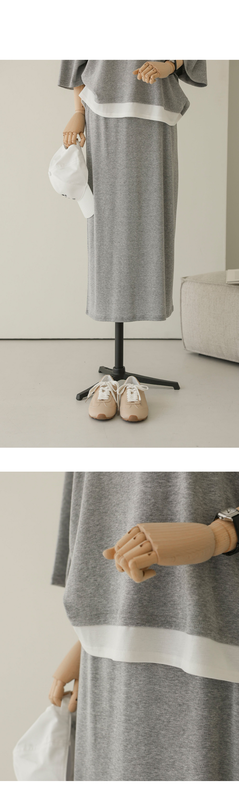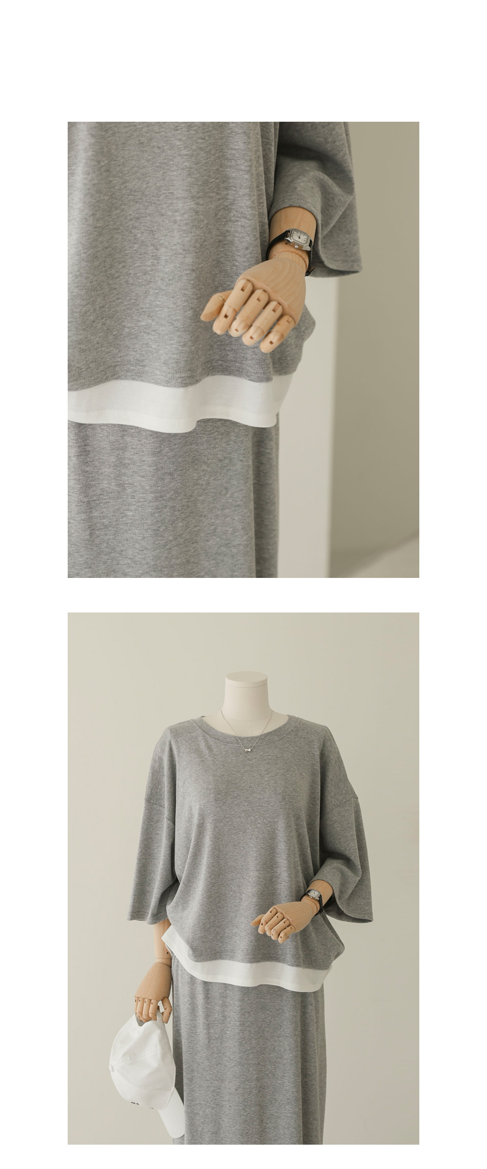 티셔츠와 스커트 세트는 우리 가족 여러분의 아침 시간을 가장 여유롭게 만들어주는 고마운 아이템이죠. 이번 세트는 상의 티셔츠 밑단에 배색 원단을 덧대어 마치 티셔츠 두 벌을 겹쳐 입은 듯한 입체감을 주었답니다.