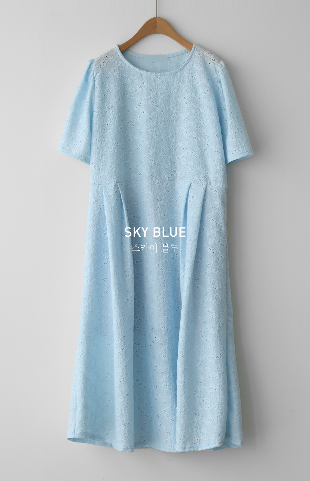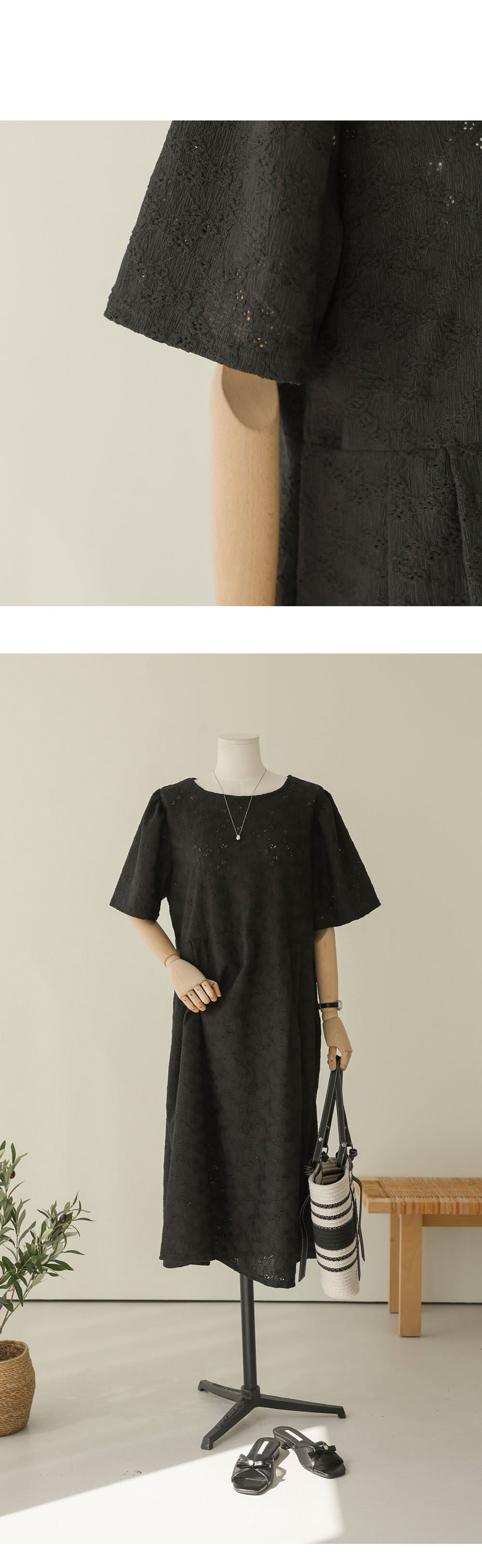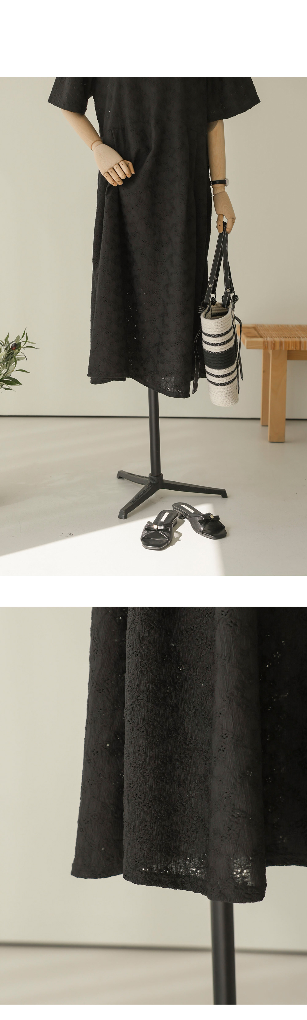 여름철 가장 시원하면서도 스타일을 챙기기 좋은 아이템이에요. 정교한 전체 펀칭 레이스 소재를 사용하여 시각적인 청량감과 고급스러움을 동시에 잡은 원피스랍니다.