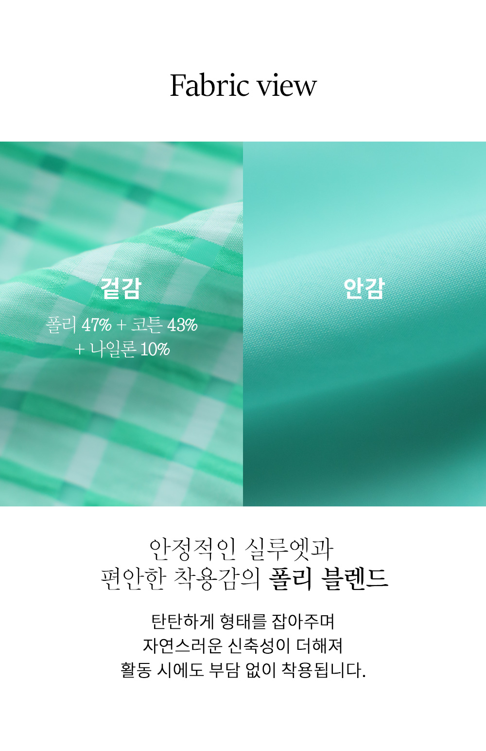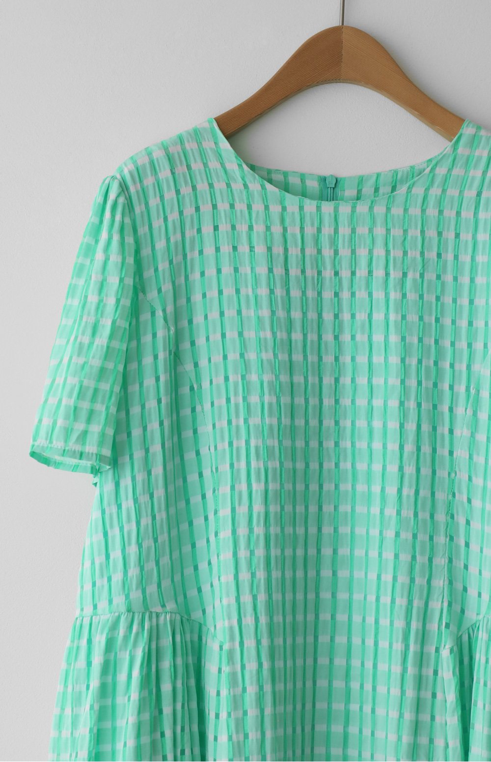 어깨를 살짝 봉긋하게 살려주어 얼굴은 작아 보이고 팔뚝 라인은 여유 있게 커버해 주구요. 라운드넥 디자인이 목선을 단정하고 깨끗하게 표현해 준답니다. 허리 라인에도 살짝 셔링을 잡아주어 복부의 굴곡을 자연스럽게 감춰주면서도 여성스러운 곡선을 살려주었구요. 뒷 지퍼로 마감하여 착용이 간편할 뿐만 아니라 외관상으로도 아주 깔끔해요. 전체적으로 들어간 체크 패턴은 간격이 일정하고 촘촘하여 시각적으로 체형이 팽창해 보이지 않도록 세심하게 설계했답니다.