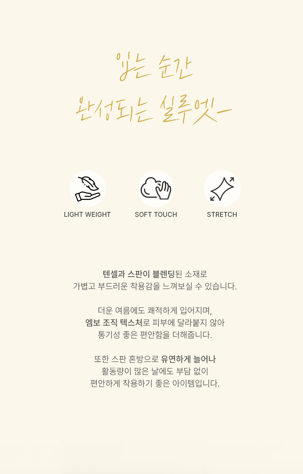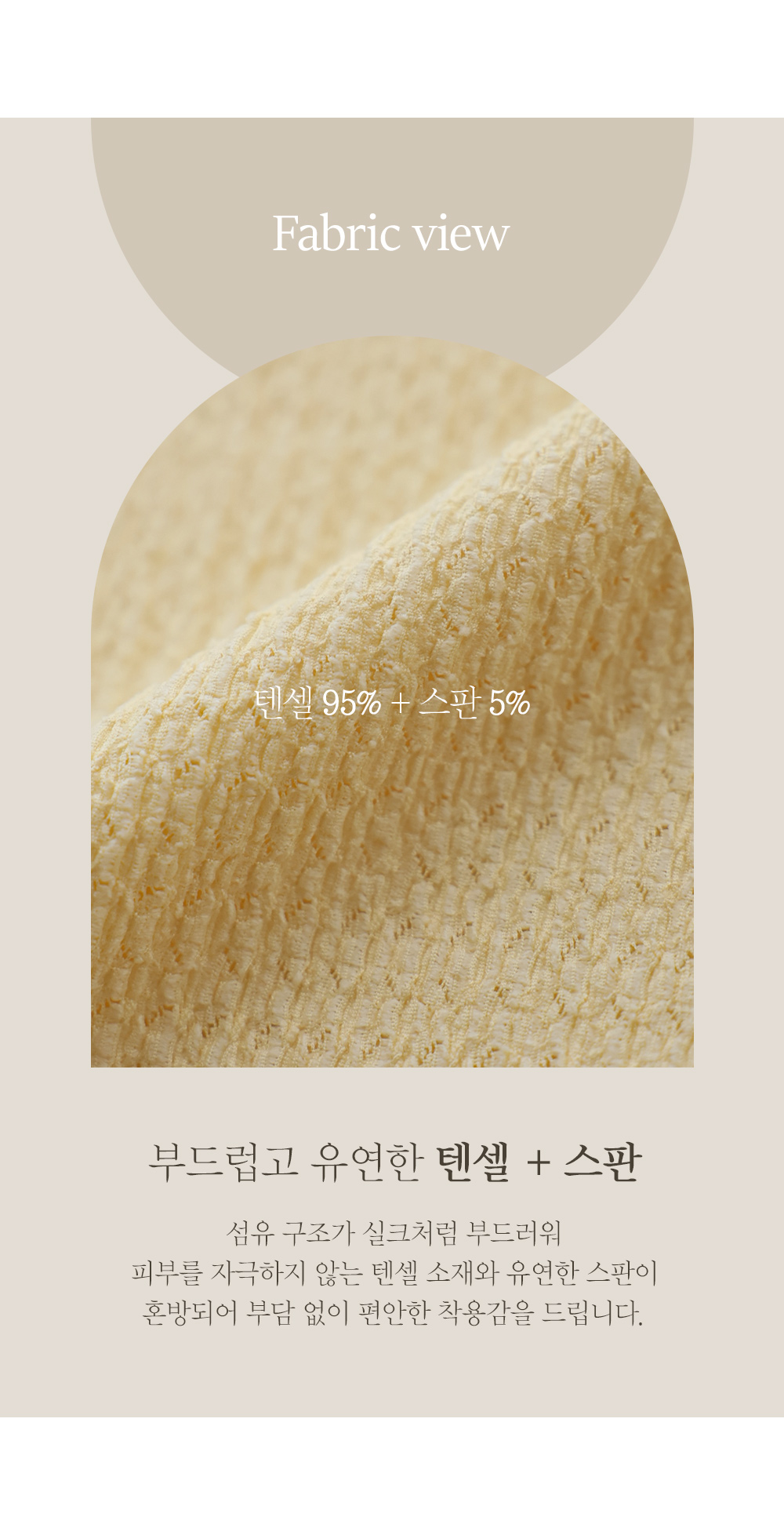 텐셀 소재가 고함유되어 실크처럼 부드러운 촉감을 자랑하며, 피부가 예민하신 분들도 자극 없이 기분 좋게 착용하실 수 있어요. 스판이 섞여 있어 텐션감이 아주 훌륭하며, 올록볼록한 입체적인 텍스처 덕분에 구김이 잘 가지 않아 별도의 다림질 없이도 깔끔하게 입기 좋답니다. 가볍고 통기성이 좋은 소재라 기온이 올라가는 날씨에도 끈적임 없이 산뜻한 착용감을 선사하는 고기능성 소재예요. ![]() ![]() MD가 답하는 안심 Q&A