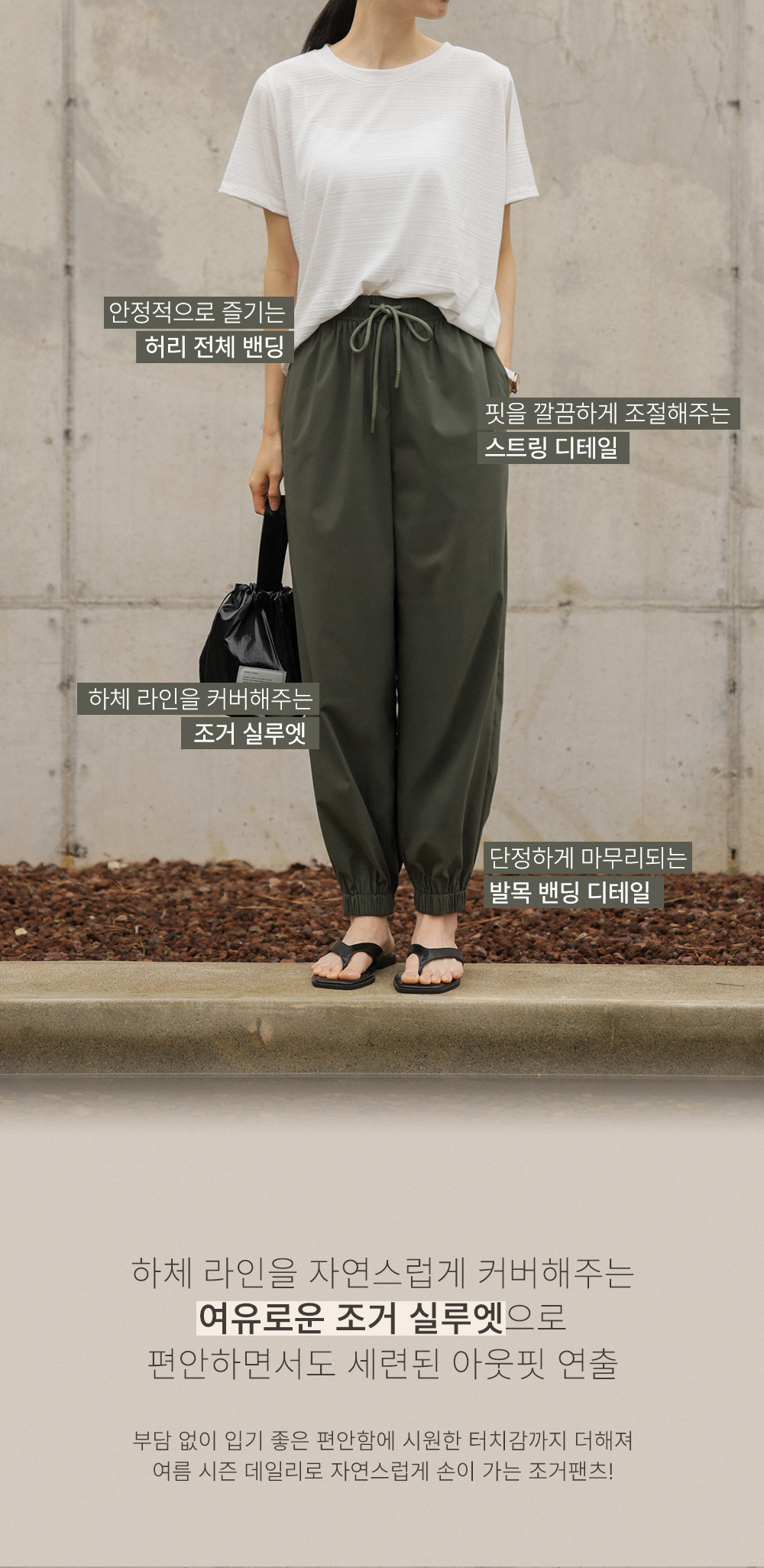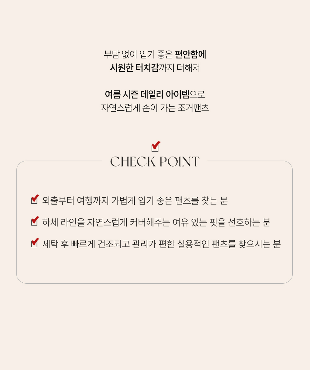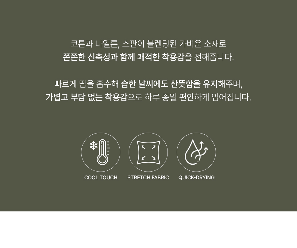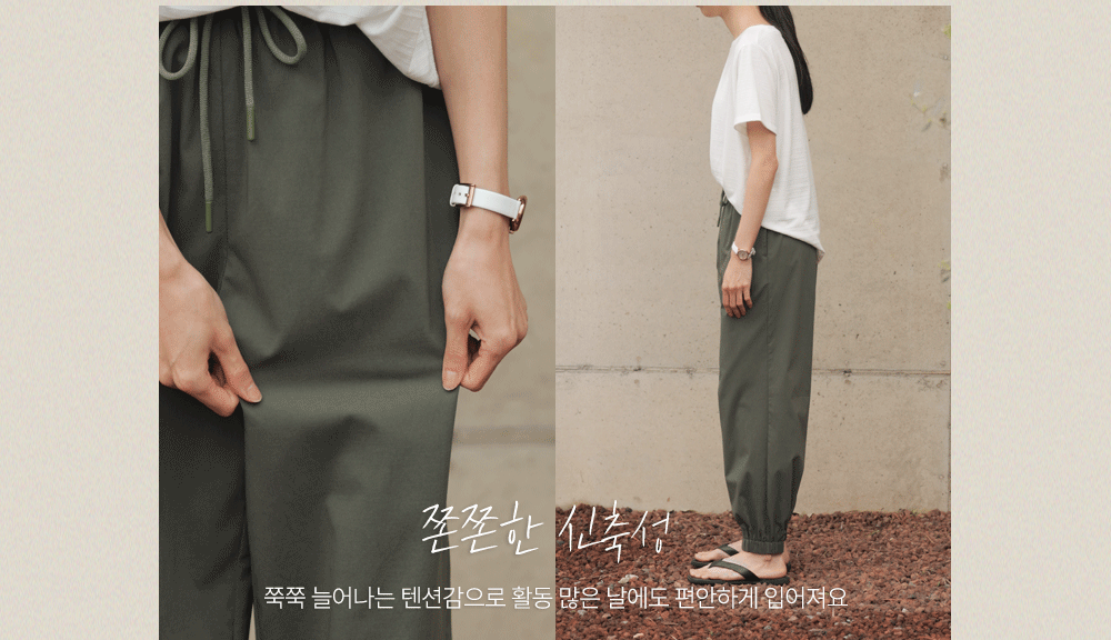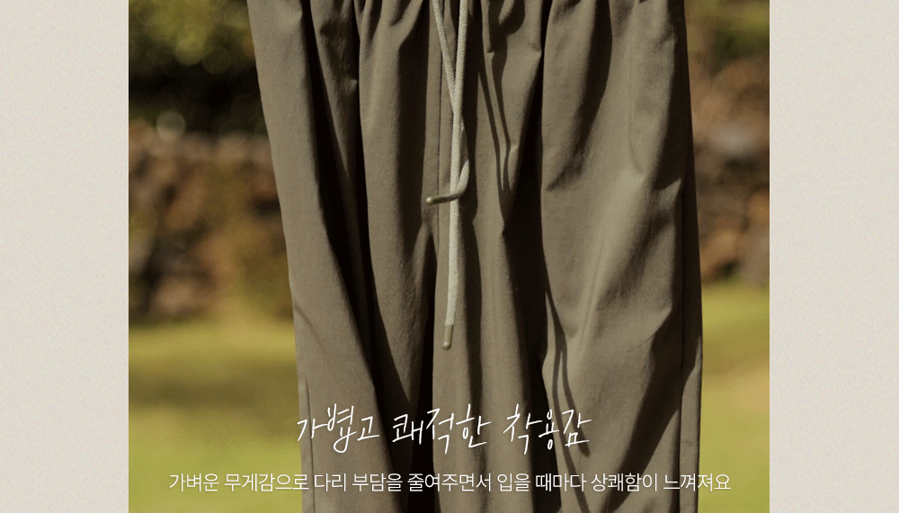 나일론과 코튼, 그리고 스판이 적절하게 혼방되어 가볍고 바스락거리는 쾌적함을 선사해요. 원단 표면에 은은한 결이 살아있어 시각적으로 고급스러우며, 신축성이 매우 뛰어나 무릎 나옴이나 형태 변형 걱정 없이 탄탄하게 입으실 수 있답니다. 몸에 달라붙지 않는 매끄러운 터칭감 덕분에 땀이 나는 날에도 쾌적한 착용감을 오래도록 유지해 주는 소재예요. ![]() 핏 가이드 보러가기→ 밴딩 가이드 보러가기→ ![]() MD가 답하는 안심 Q&A