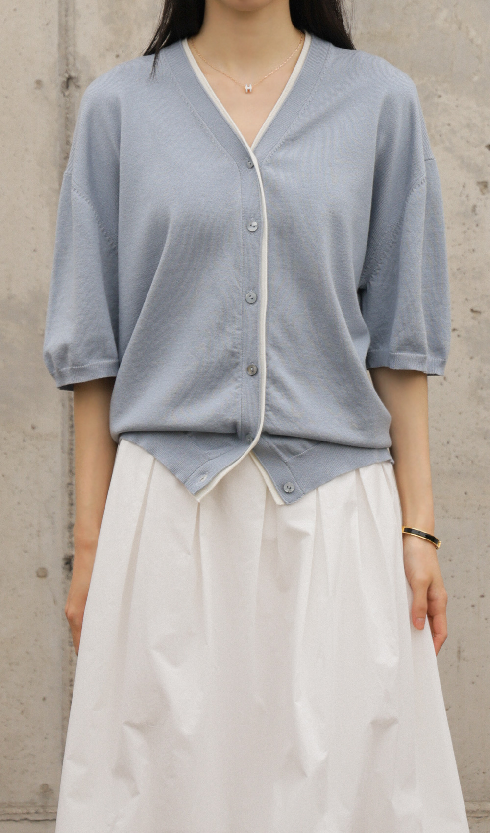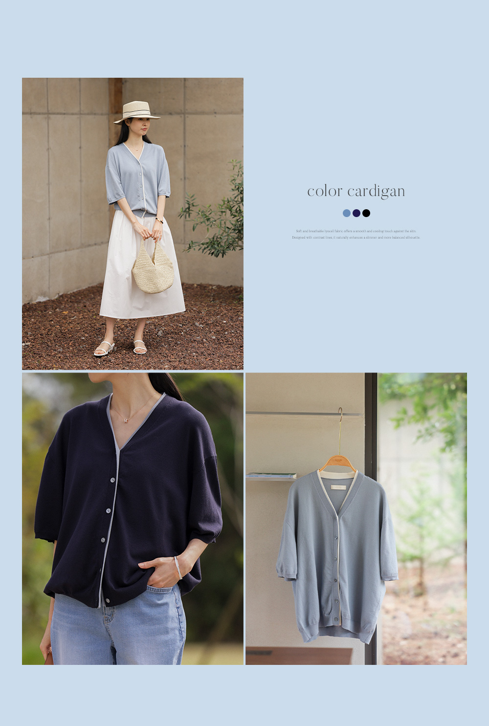 가디건은 간절기부터 실내 에어컨 바람 아래까지 사계절 내내 활용도가 가장 높은 아이템 중 하나예요. 이번에 선보이는 제작 가디건은 V네크라인을 따라 밑단까지 이어지는 배색 라인이 포인트가 되어 단조로운 코디에 확실한 생기를 불어넣어 준답니다.