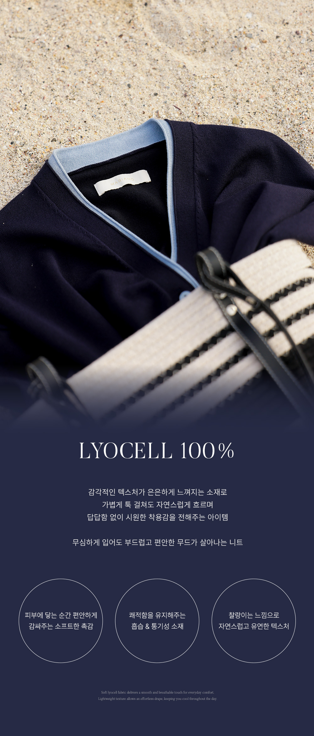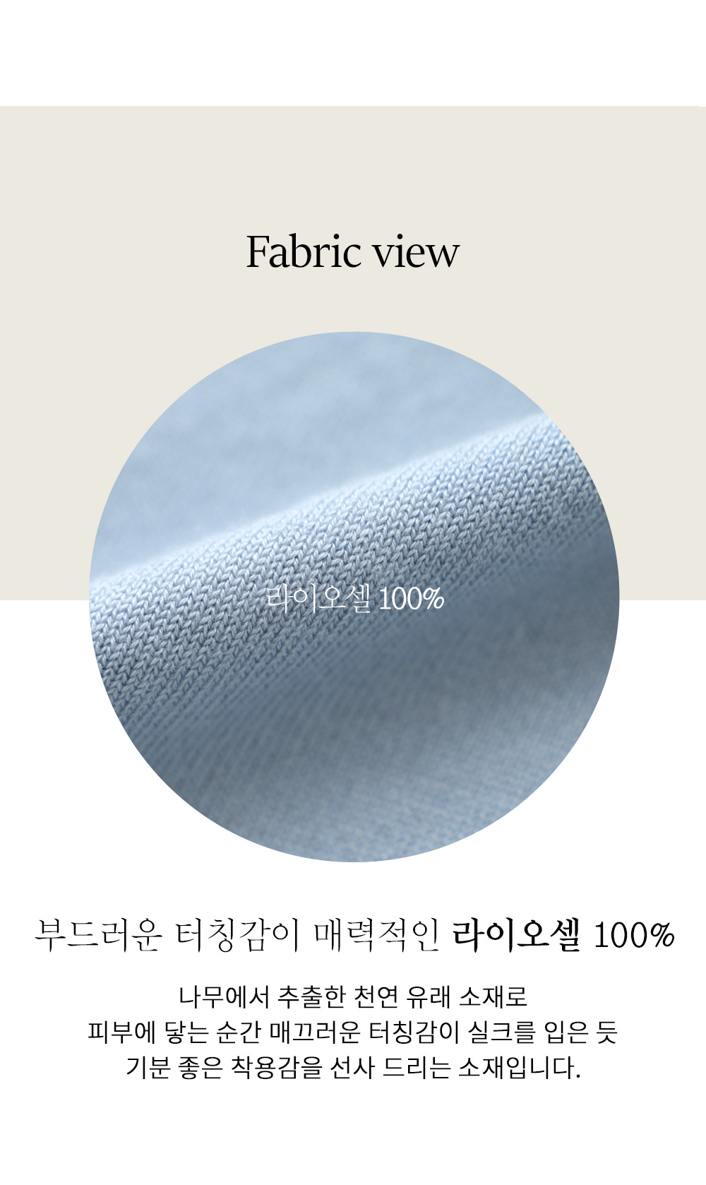 라이오셀 특유의 매끄러우면서도 차르르하게 떨어지는 텍스처가 돋보이는 소재예요. 입는 순간 몸을 부드럽게 감싸주는 촉감이 아주 훌륭하며, 얇은 두께감임에도 탄탄한 조직감을 가지고 있어 실루엣을 예쁘게 잡아주며, 쾌적한 착용감을 유지해 주어 하루 종일 기분 좋게 착용하실 수 있어요.