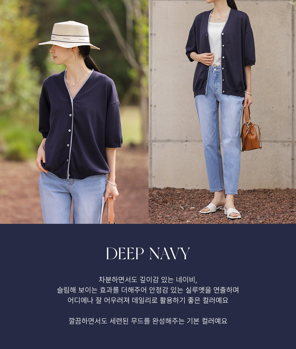 전체적으로 여유 있는 실루엣이라 체형 부각 없이 편안하게 입기 좋구요, 네이비, 스카이블루, 블랙까지 총 세 가지 컬러로 준비되어 있어 각각 다른 분위기를 연출하기에 참 좋아요.